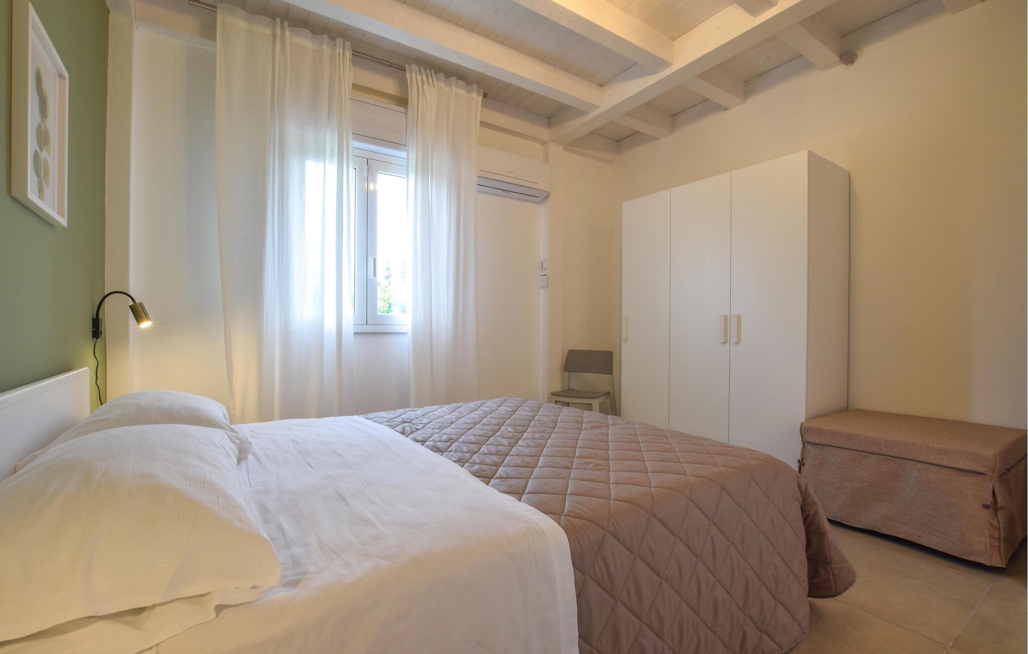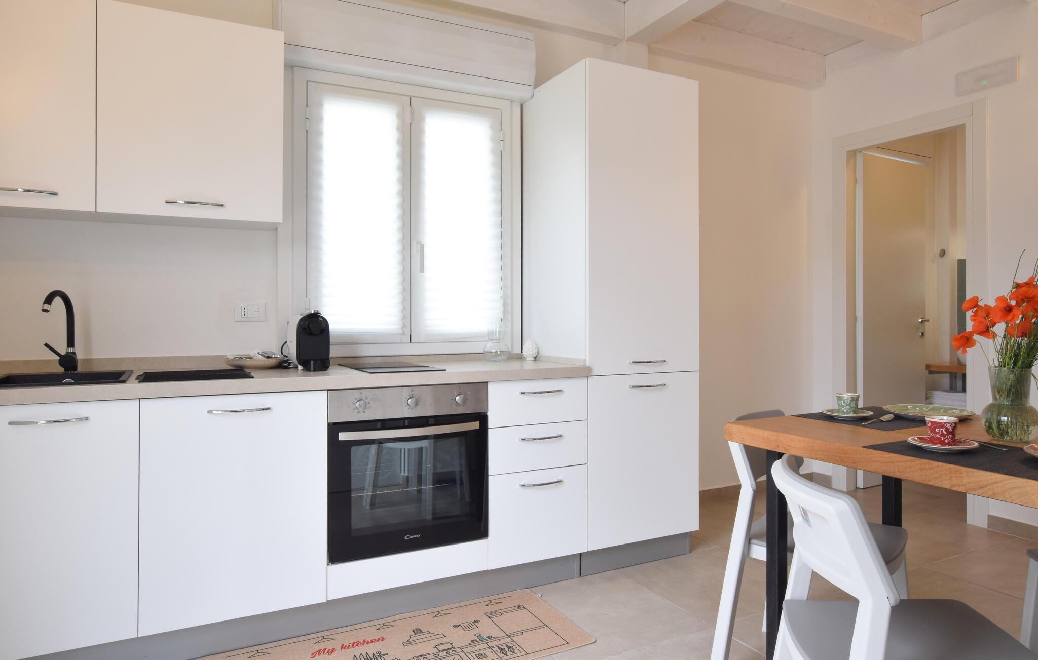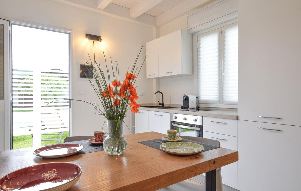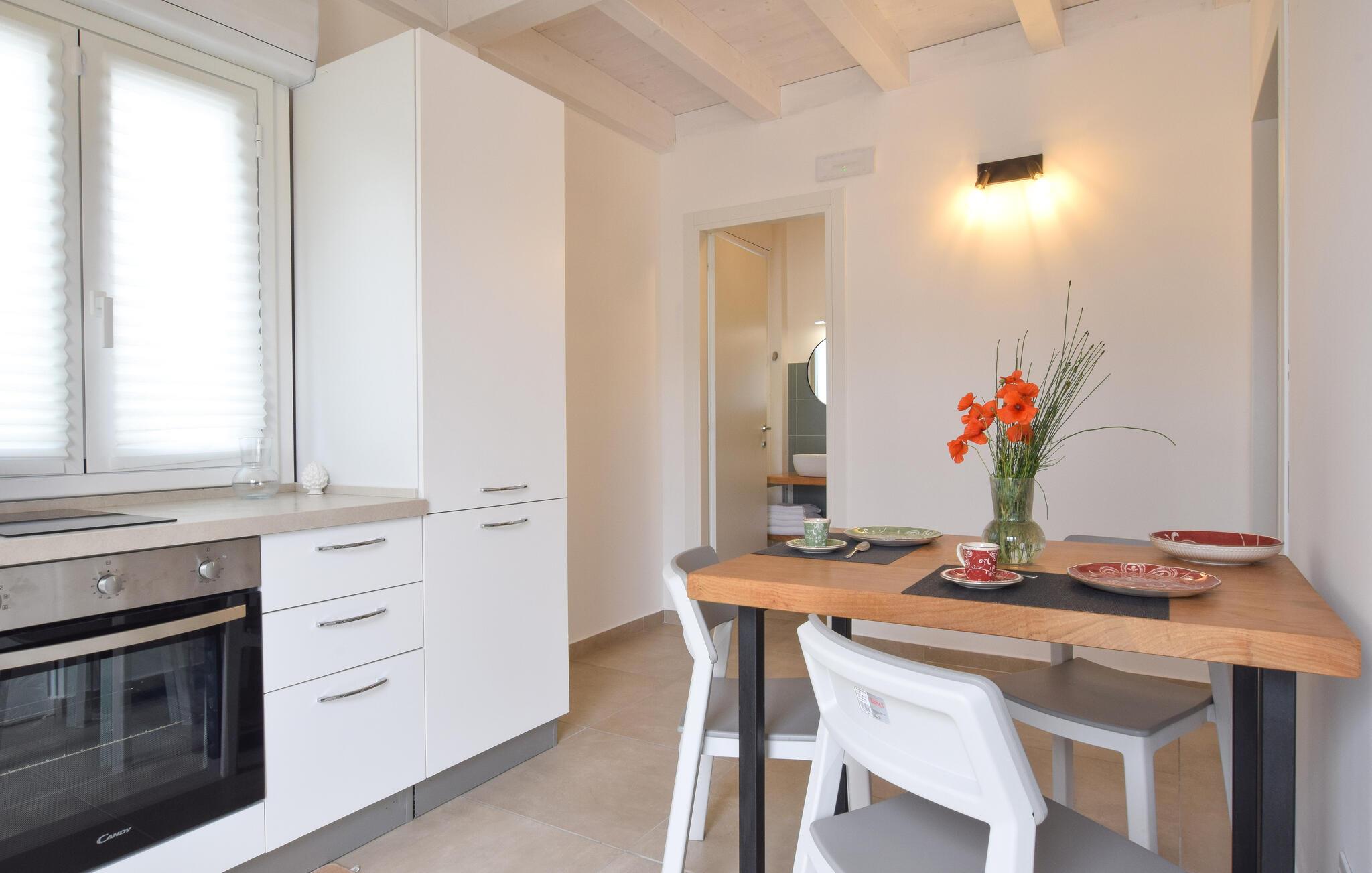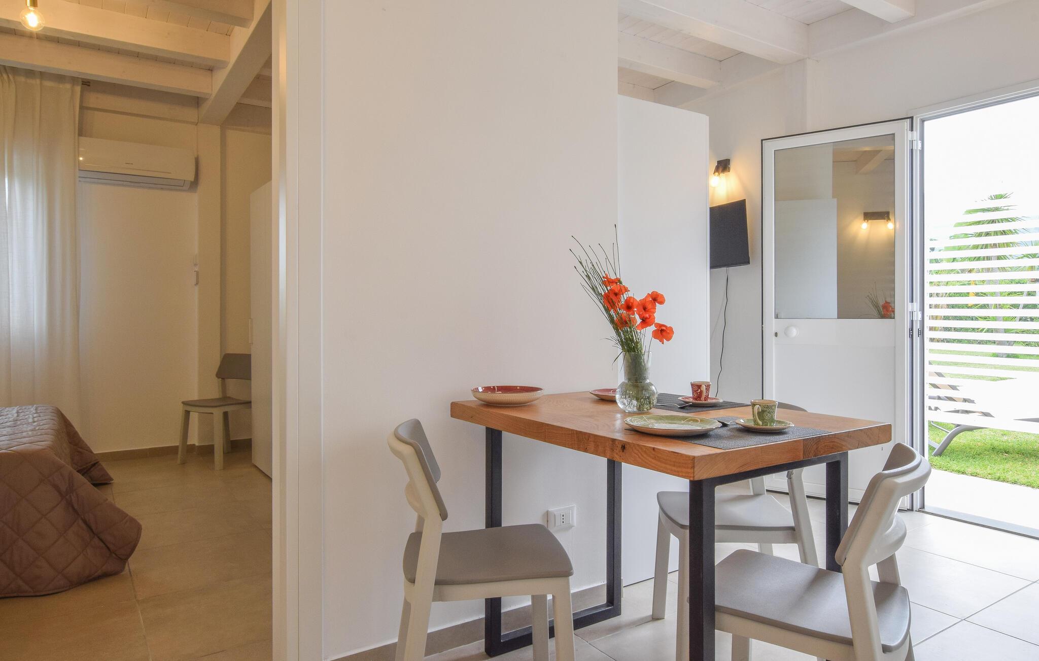 En lys og venlig atmosfære byder jer velkommen til dette charmerende feriehus nær stranden. Tilbered middelhavsretter med friske råvarer fra markedet i det åbne køkken og planlæg jeres aktiviteter over fælles måltider ved det stilfulde spisebord. Nyd den smagfulde atmosfære med en afslappende bog eller en hyggelig spilleaften på den behagelige sofa.