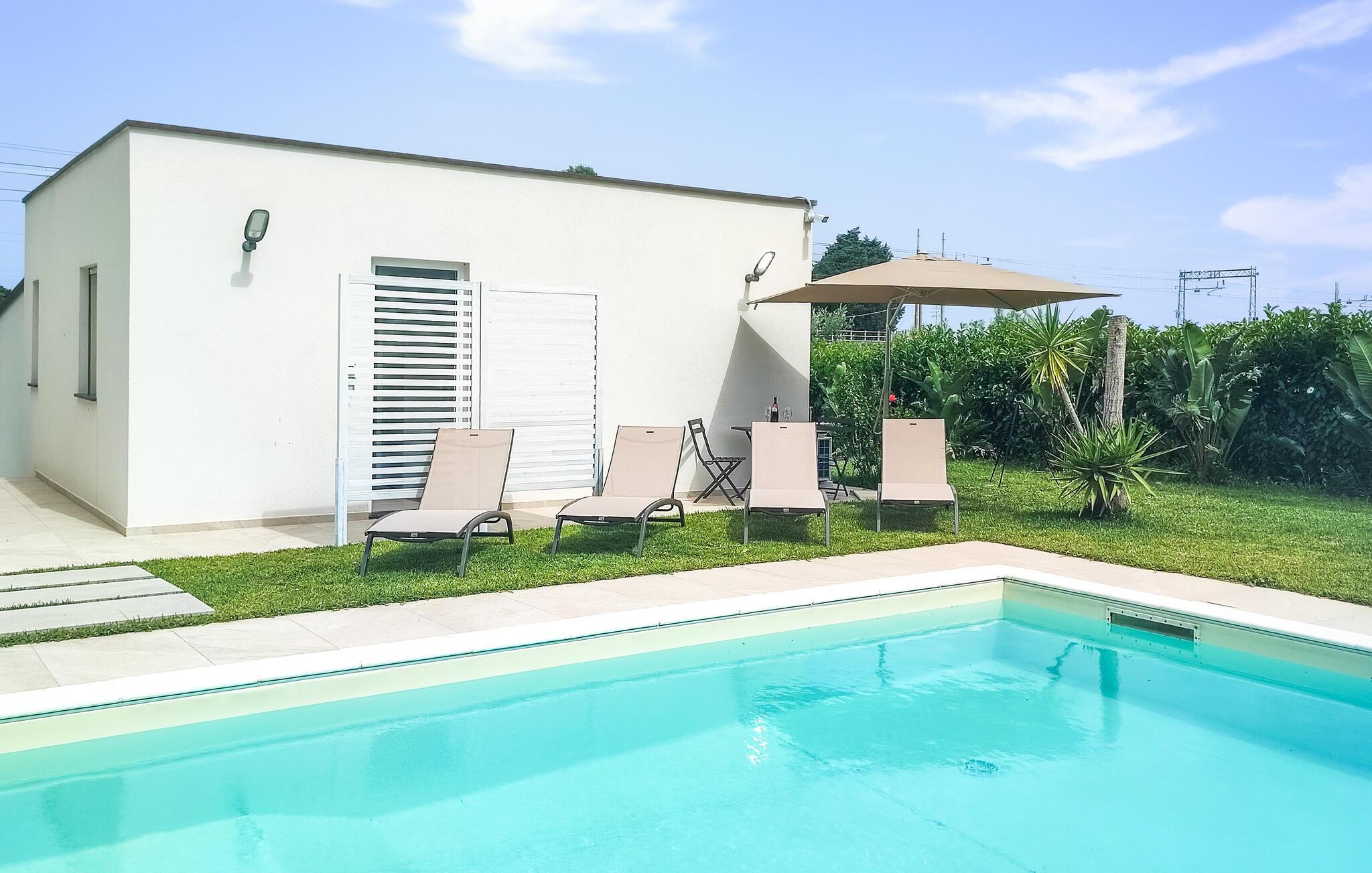 Tilbring en solrig ferie ved havet i dette komfortable feriehus med pool.