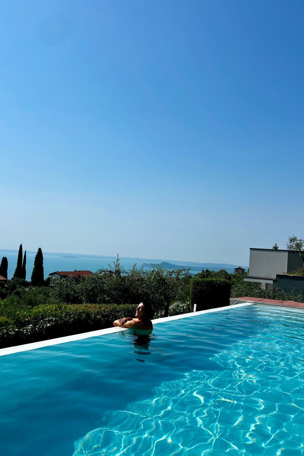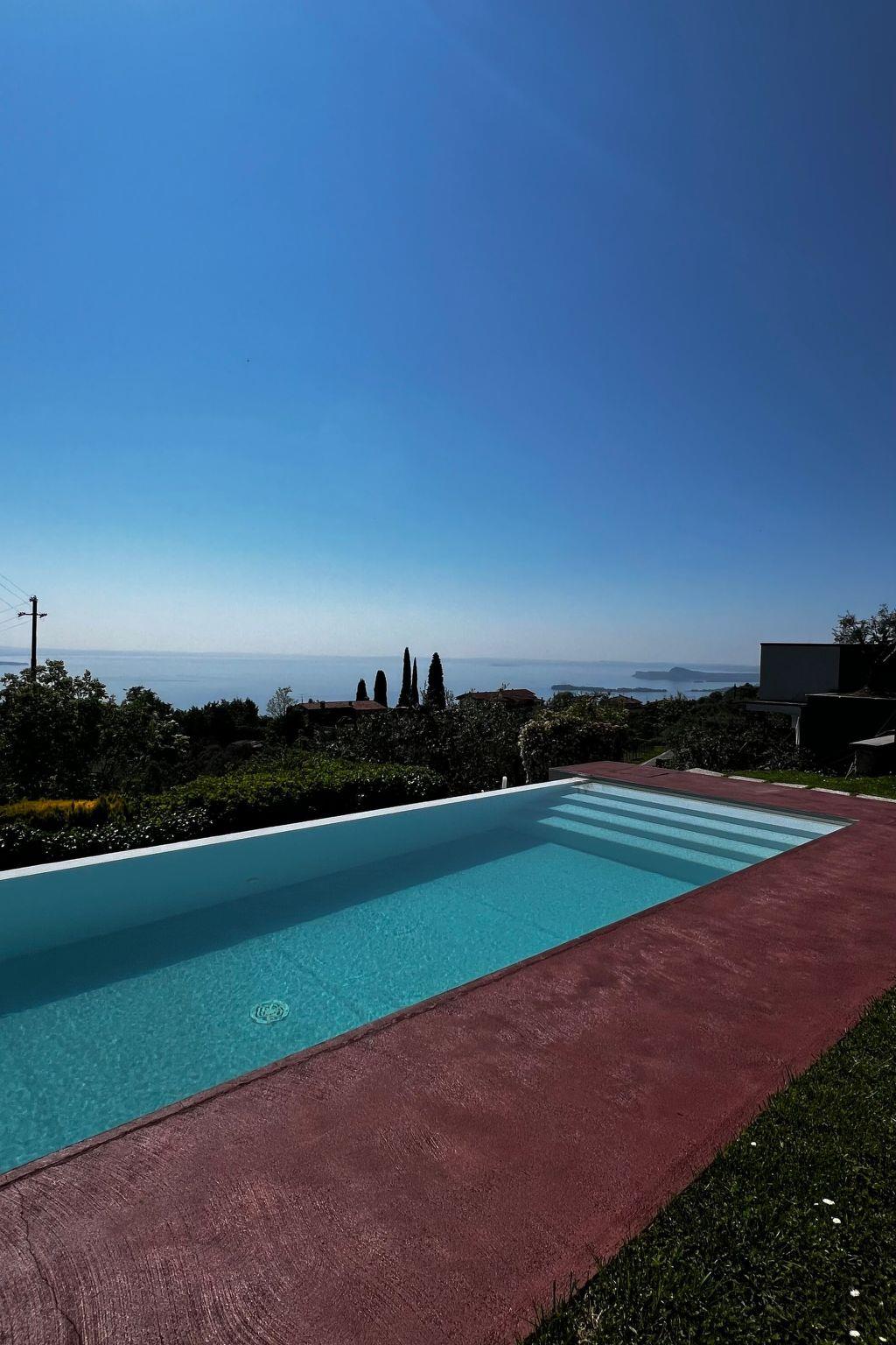 There is a balcony, a communal swimming pool with a view of the lake and sun loungers, an outdoor shower and a car park.