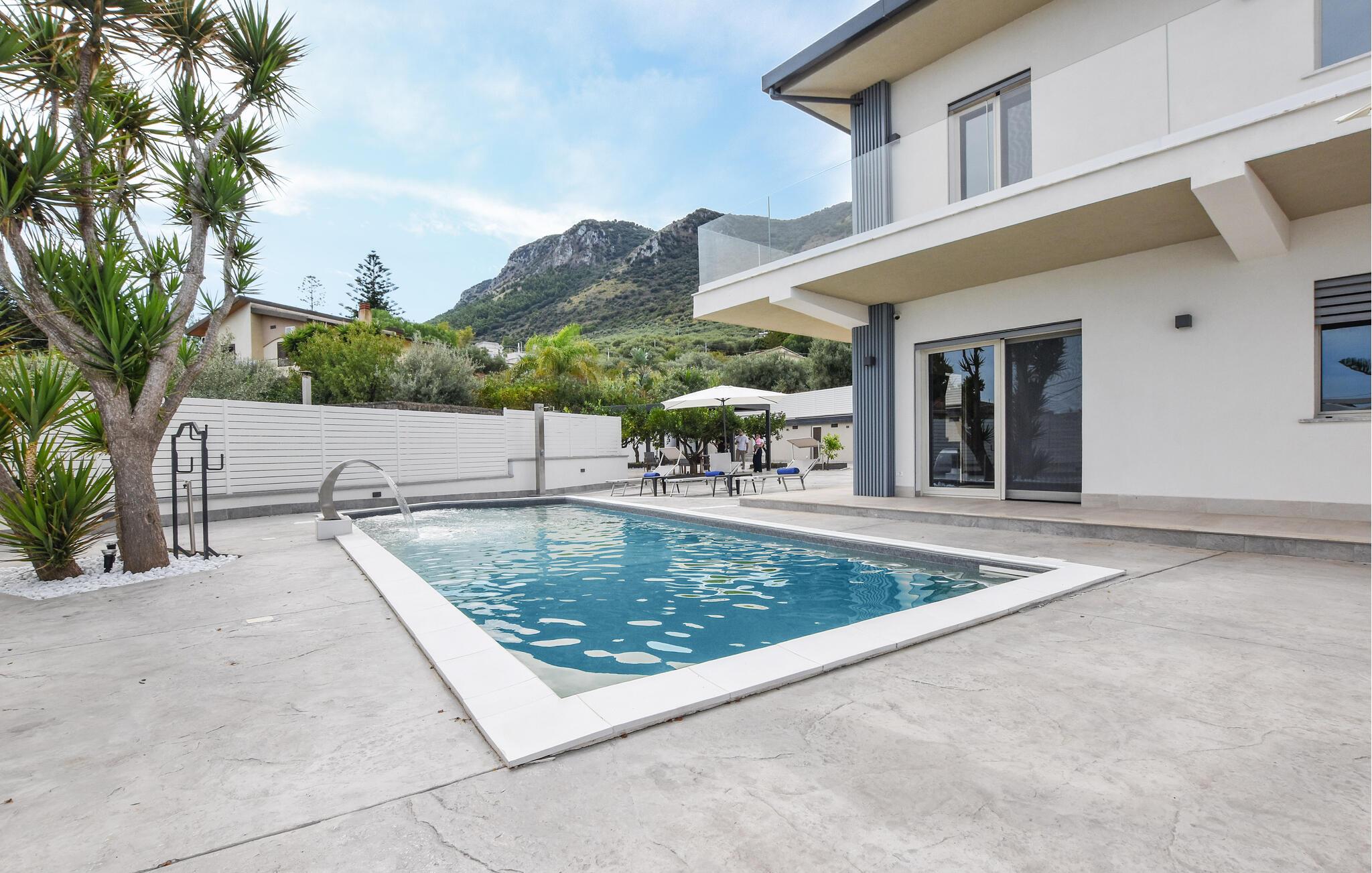 Nyd den betagende udsigt over havet nær Trabia fra altanen. Dyk ned i den afsidesliggende pool og server jer morgenmad på terrassen. Genoplad batterierne på behagelige liggestole og tryl lækre tilbehør frem til stemningsfulde grillmad i sommerkøkkenet, mens de yngre gæster nyder rutsjebanen og legehuset.