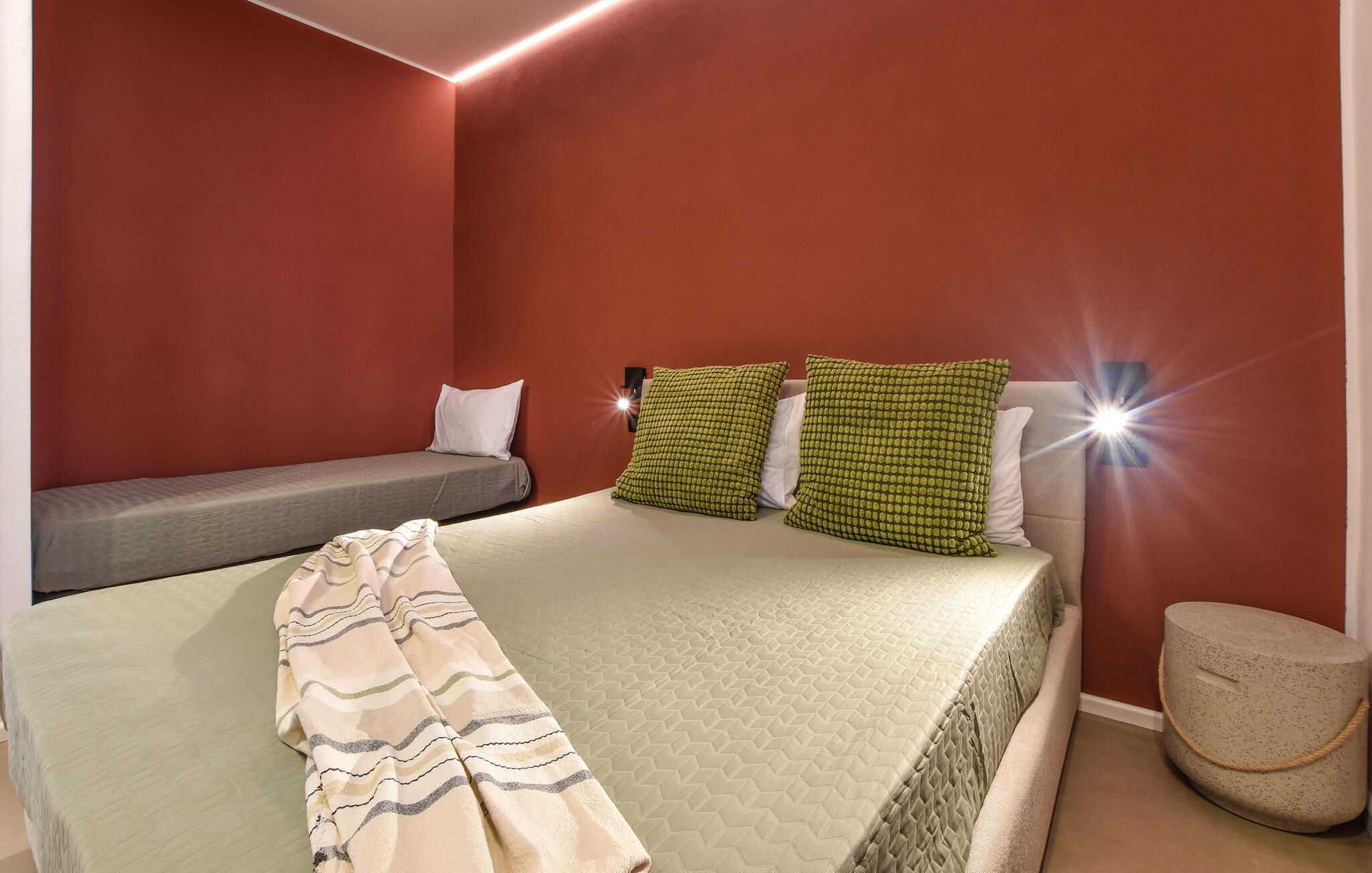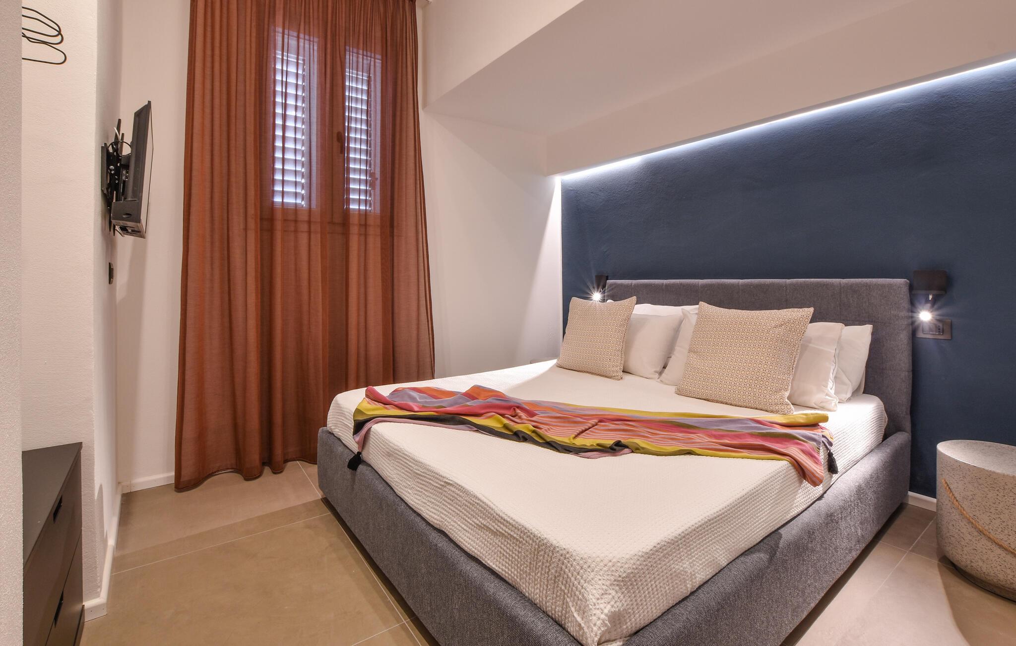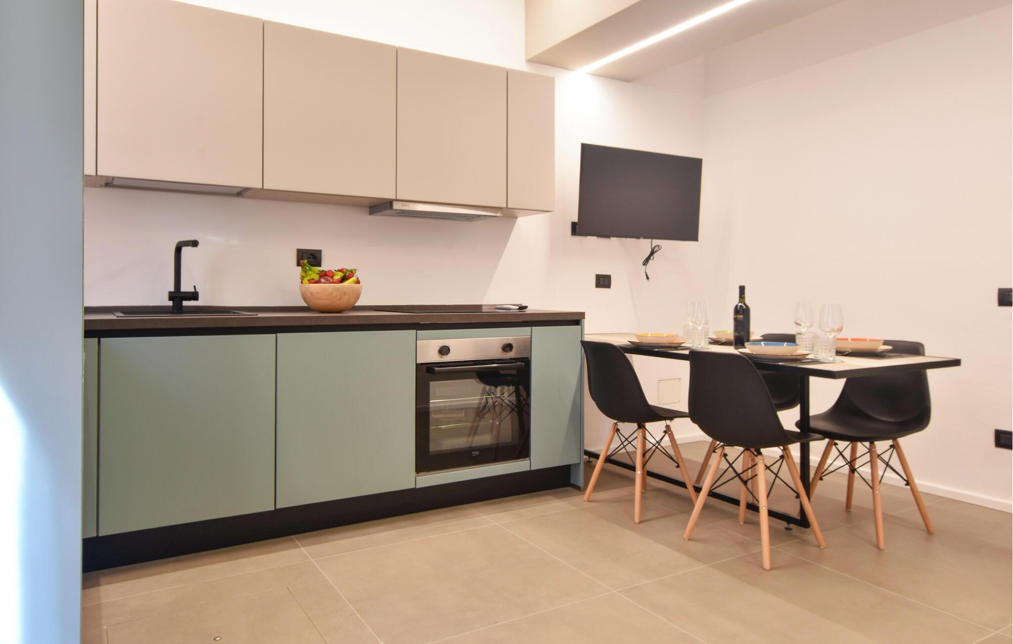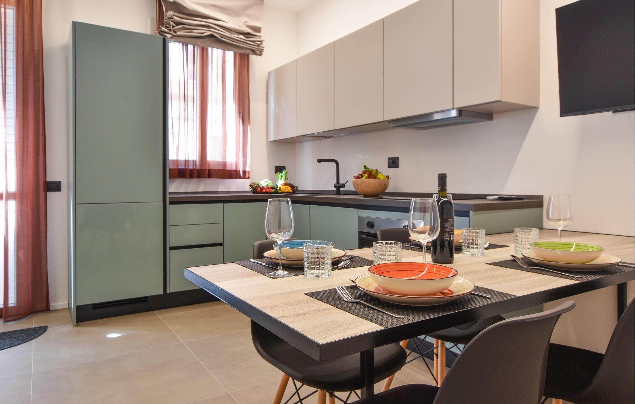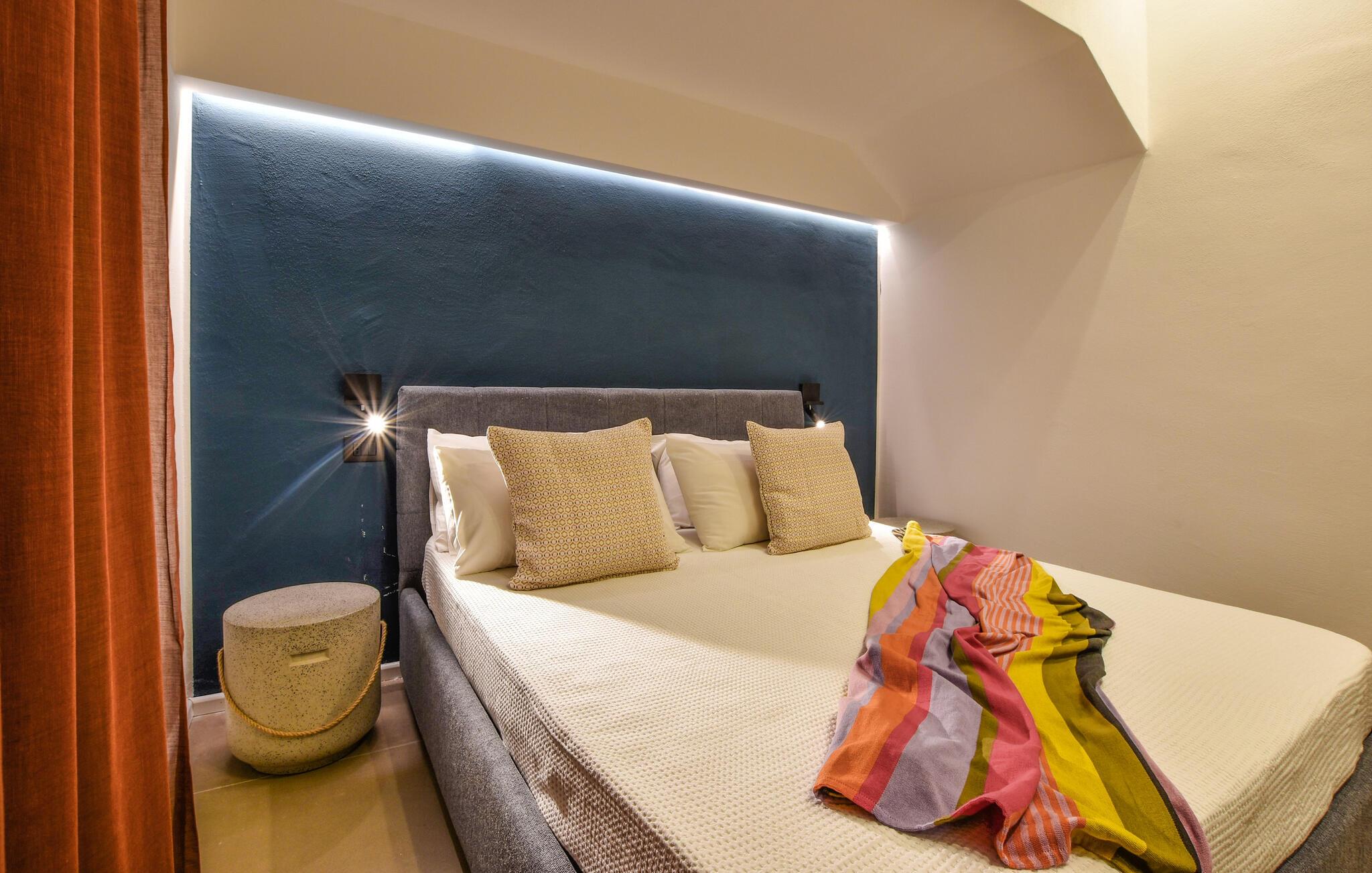 Denne smagfulde ferielejlighed ligger kun få skridt fra kysten og har et stilfuldt interiør. Tilbered lækre måltider i det lyse og rummelige køkken og nyd dem ved det hyggelige spisebord. Slap af i den komfortable sofa med en god bog eller afslut dagen med en spilleaften.
