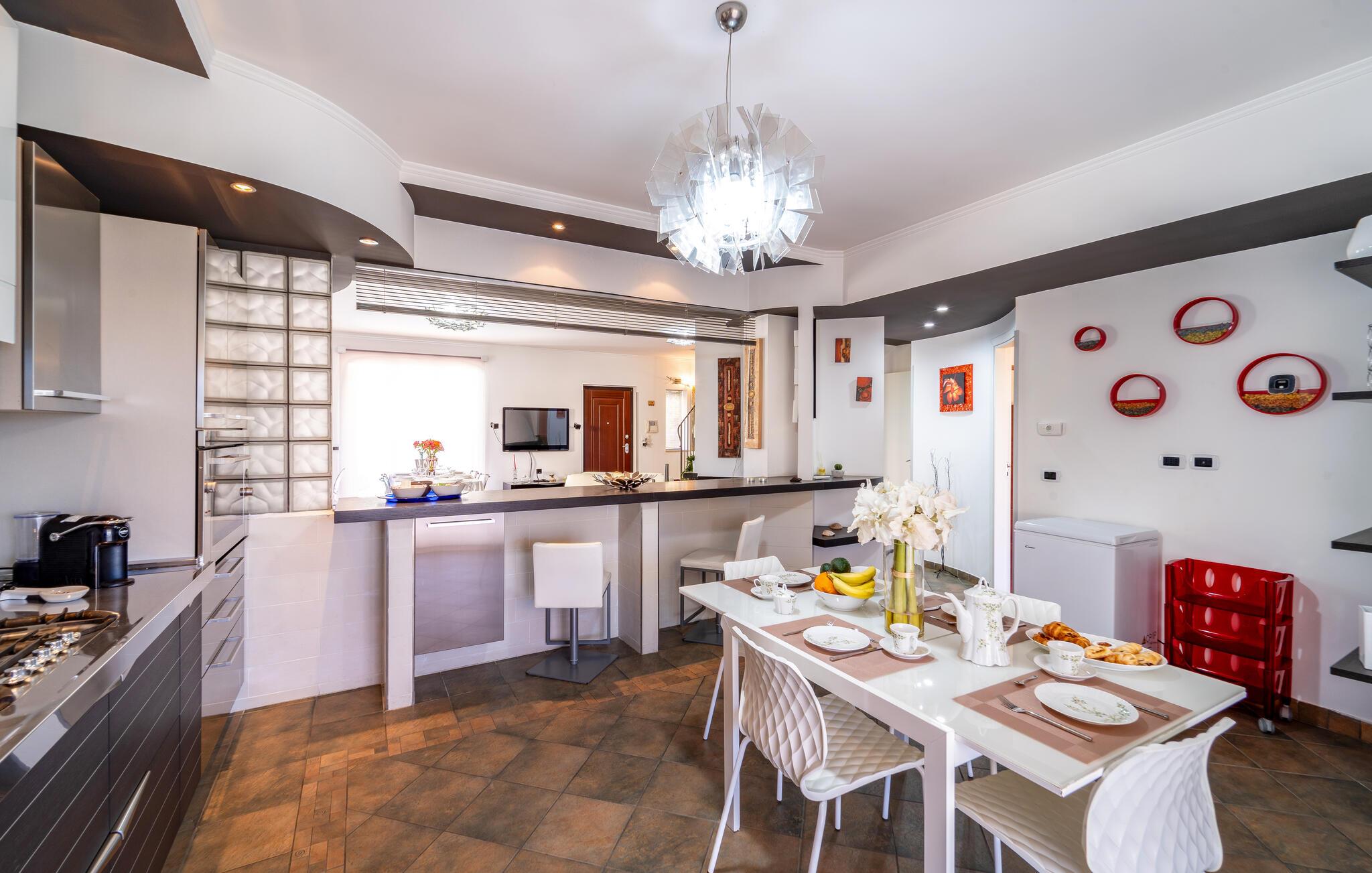 Dette rummelige feriehus inviterer jer til en uforglemmelig ferie i en fantastisk beliggenhed. Brug det fuldt udstyrede køkken til at trylle regionale specialiteter frem, og nyd måltiderne ved det stilfulde spisebord. Slap af på de komfortable sofaer, eller fordyb jer i en god bog i en af husets rolige kroge. Her føles hvert øjeblik som ren luksus.