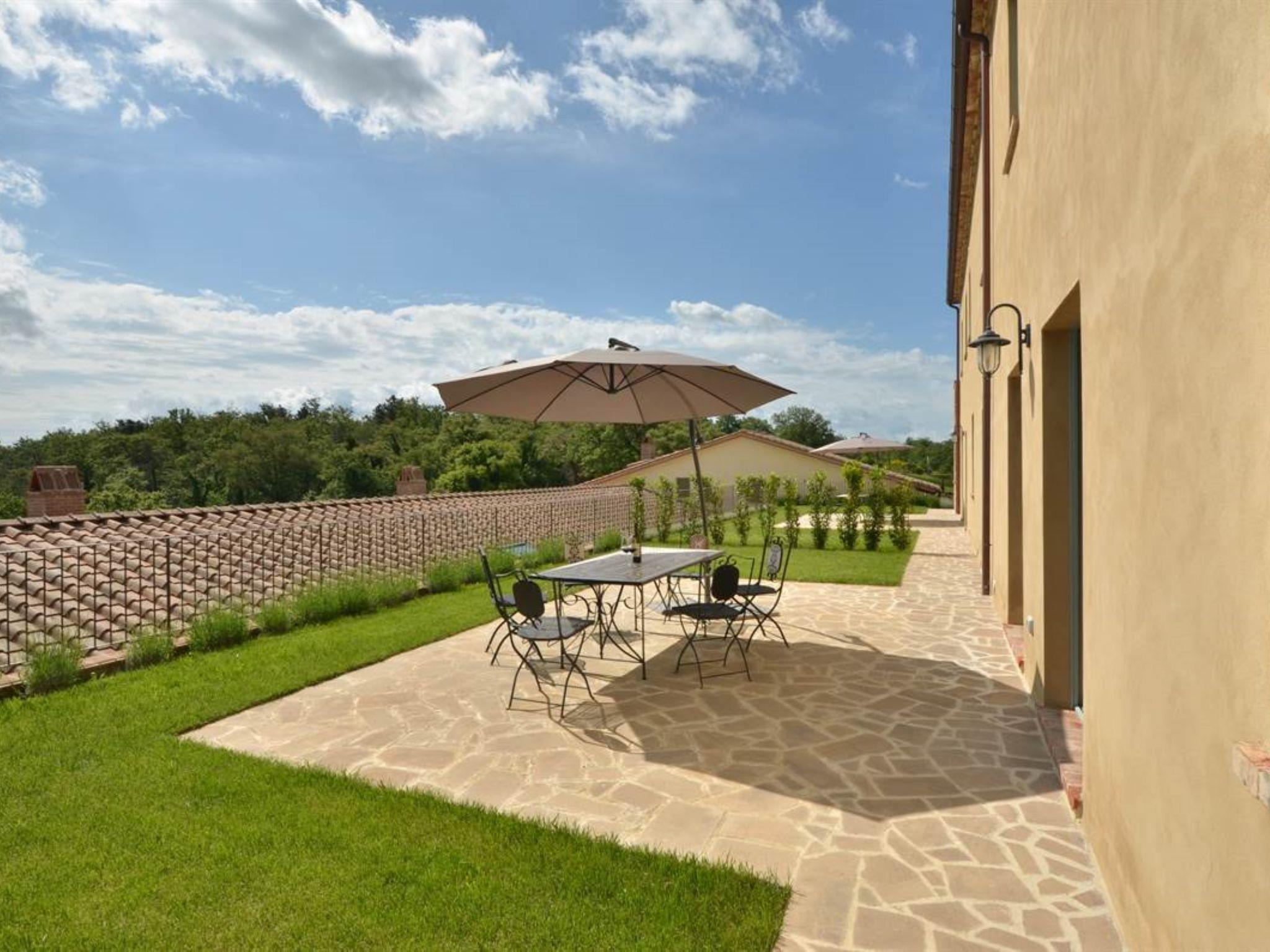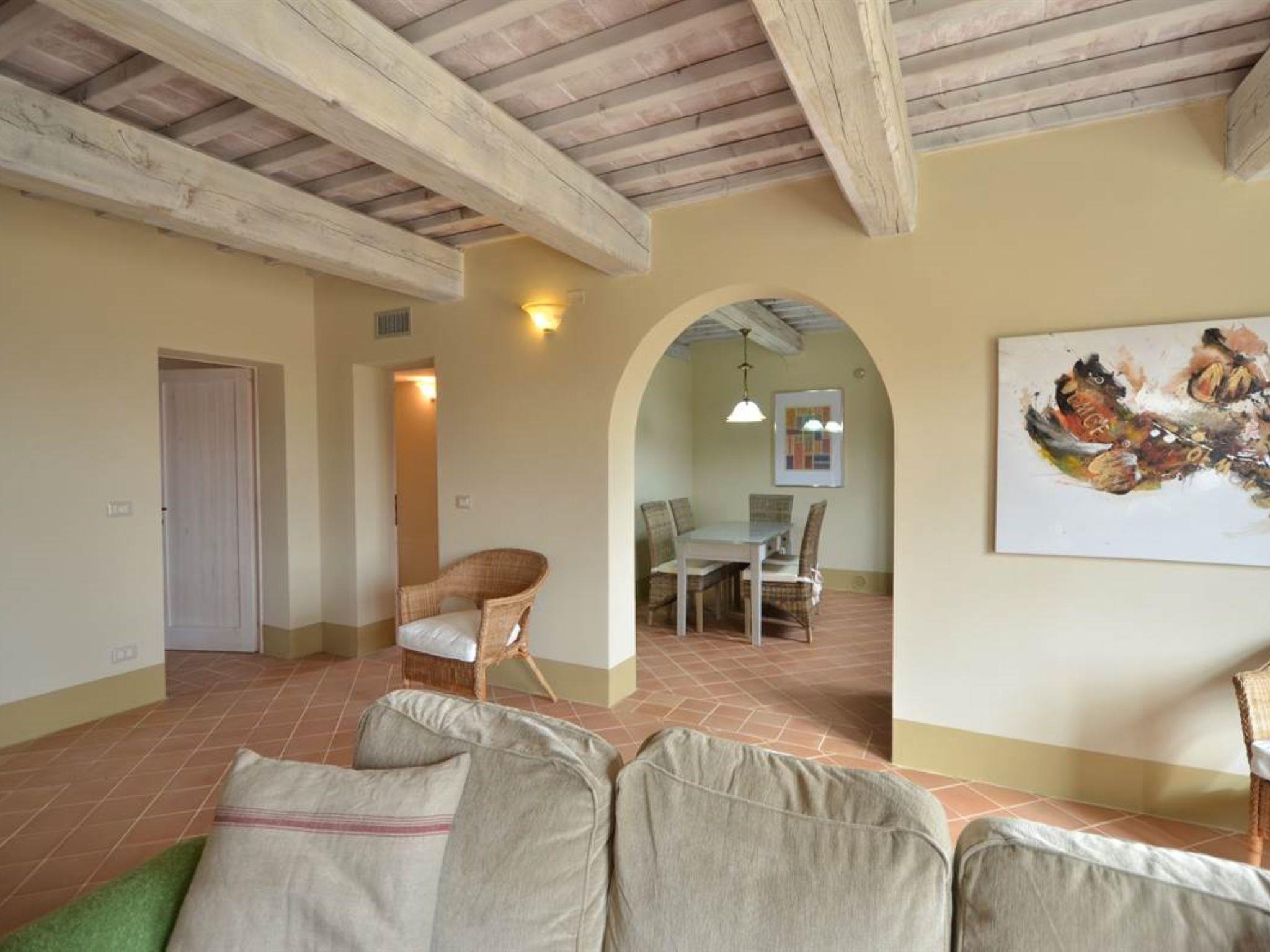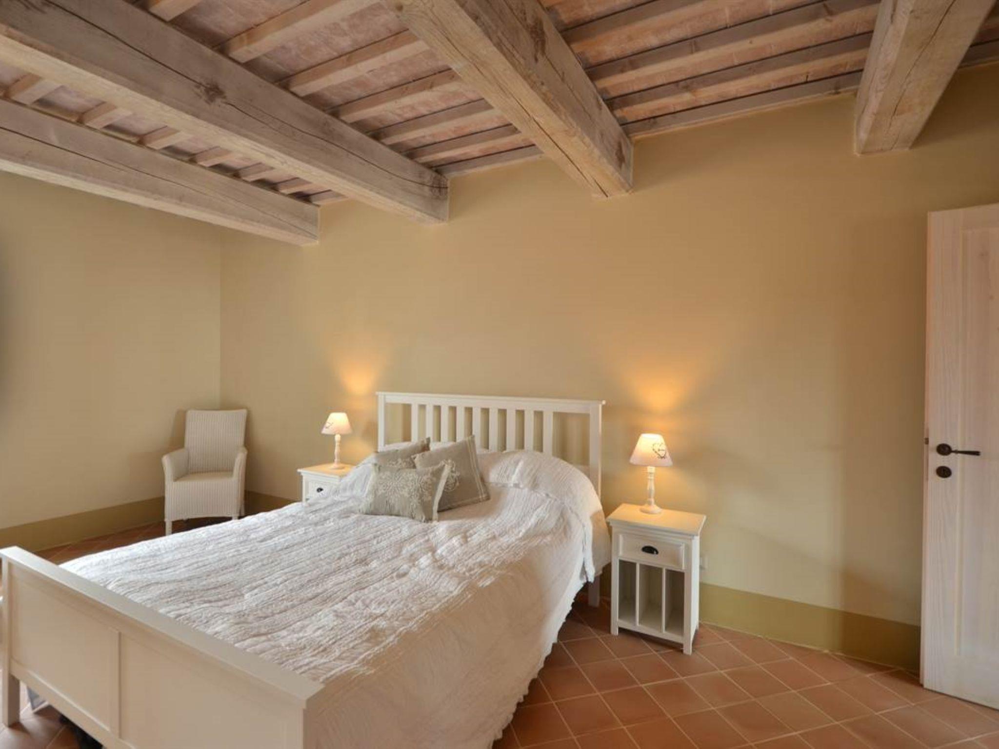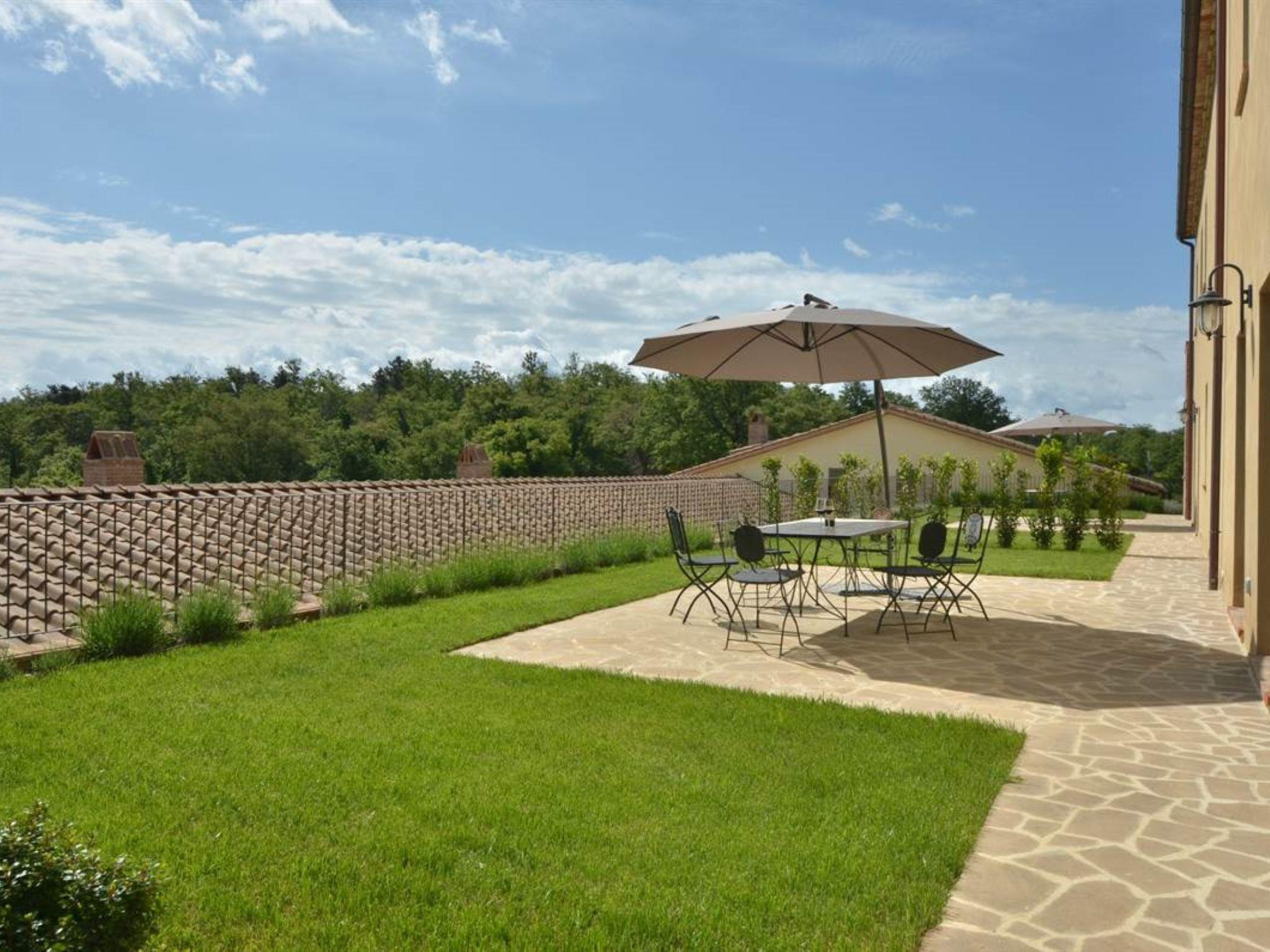 Very beautiful, comfortable residence "Cignella Resort", surrounded by trees, fields and vineyards. 13 apartments in the residence. 3 km from the centre of Trequanda, in a secluded, sunny, elevated position, 30 km from the lake, in the countryside. For shared use: property (fenced), large garden plants and trees, swimming pool fenced (10 x 12 m, seasonal availability: 01.May. - 15.Oct. pool opening hours: 08:00-19:00) with internal staircase. Children's pool, outdoor shower, patio, pergola, terrace, garden furniture, barbecue, pool maintenance by the owner/gardener. In the house: reception, breakfast room, lounge, massage (extra). Linen change weekly. Towel change weekly. Room cleaning on request (extra). Breakfast possible (extra). Airport transfer (extra). 1 km long bumpy motor access. Parking on the premises. Shop 3 km, grocery 3 km, supermarket 10 km, shopping centre 10 km, restaurant 3.5 km, bus stop 1.5 km, railway station "Foiano della Chiana" 22 km, thermal baths "Rapolano Terme" 30 km, bathing lake "Trasimeno" 30 km. Golf course (9 hole) 17 km. Nearby attractions: Pienza 13 km, Montepulciano 14 km, Montalcino 32 km, Cortona 39 km, Arezzo 48 km, Siena 49 km. Well-known lakes can easily be reached: Trasimeno 30 km, Chiusi 35 km. Please note: reception open 09:00-18:00 hrs. Suitable for families, baby equipment (included), childminding (extra). Suitable for events. On request: airport transfer to the holiday accommodation. Please note: Loading and unloading of baggage is possible at the holiday house. 24hr guard. Residence with electric gates. All houses/apartments are individually designed/furnished.