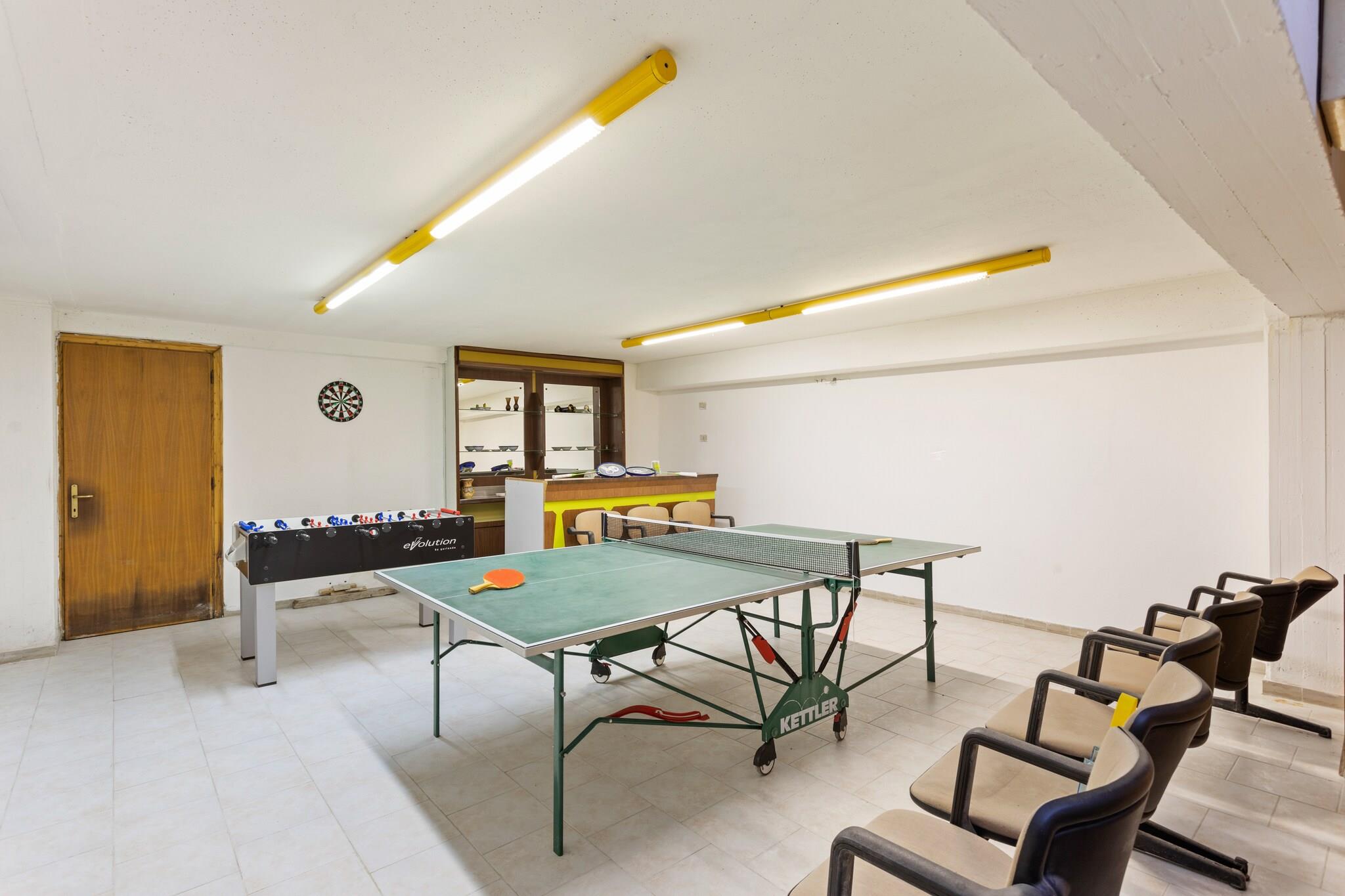 På 2. etage: (Køkken(kogeplade, elkedel, kaffemaskine, ovn, køle-fryseskab), stue / spisestue(enkeltskabsseng, Fjernsyn, spisebord), soveværelse(dobbeltseng), soveværelse(enkeltseng, enkeltseng), badeværelse(bruser, håndvask, toilet, bidet), klimaanlæg) vaskerum (håndvask, toilet, vaskemaskine), fitnessrum(fitnessapparater), opholdsrum(bordtennisbord, bordfodbold), terrasse, have(deles med andre gæster), havemøbler, swimmingpool(deles med andre gæster, 15 x 7 m., opened from Jun upto and including 1/2 Sep)