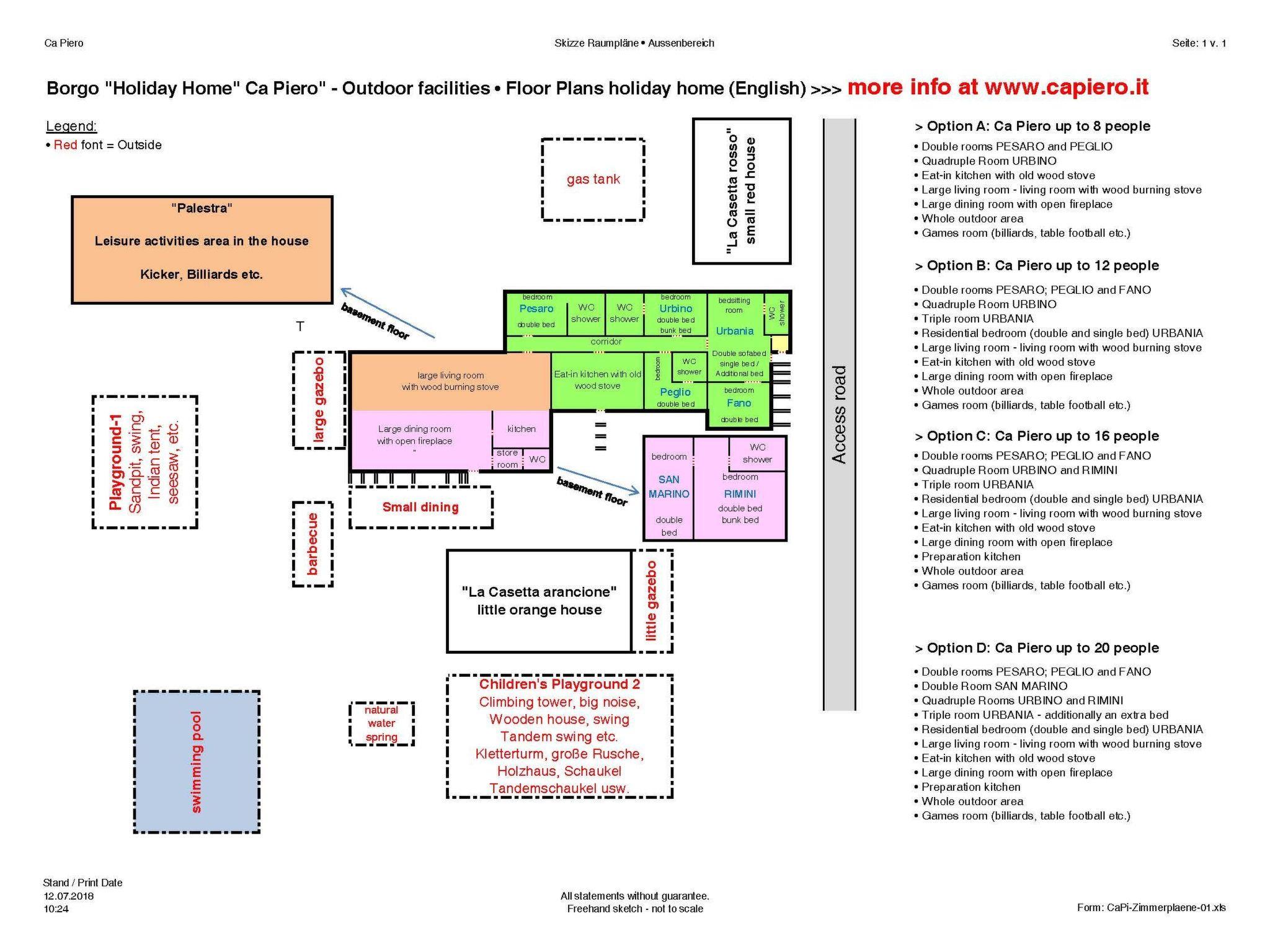If you would like to rent the house for up to seventeen people, there are four bedrooms available on the ground floor: Two double rooms (double beds: 150 x 195 and 180 x 200), a triple room (single bed: 80 x 180, double bed: 160 x 190) and another triple room (single bed: 75 x 180, double bed: 180 x 200). In addition, two people can sleep on a sofa bed (160 x 190) in a small living room. Three of the bedrooms are connected to a bathroom with WC and shower. A further bathroom with WC and shower is located next to the living room/bedroom, which also serves as a passageway to the fourth bedroom. There are two further bedrooms in the basement: a double room (double bed: 180 x 200) and a triple room (single bed: 80 x 190, double bed: 140 x 200). A bathroom with WC and shower is connected to the triple room. You can also use both kitchens, the large dining room with open fireplace, the 65 m² living room with wood-burning stove and the entire outdoor area. Two baby packs, each consisting of a cot and high chair, can also be provided free of charge on request.