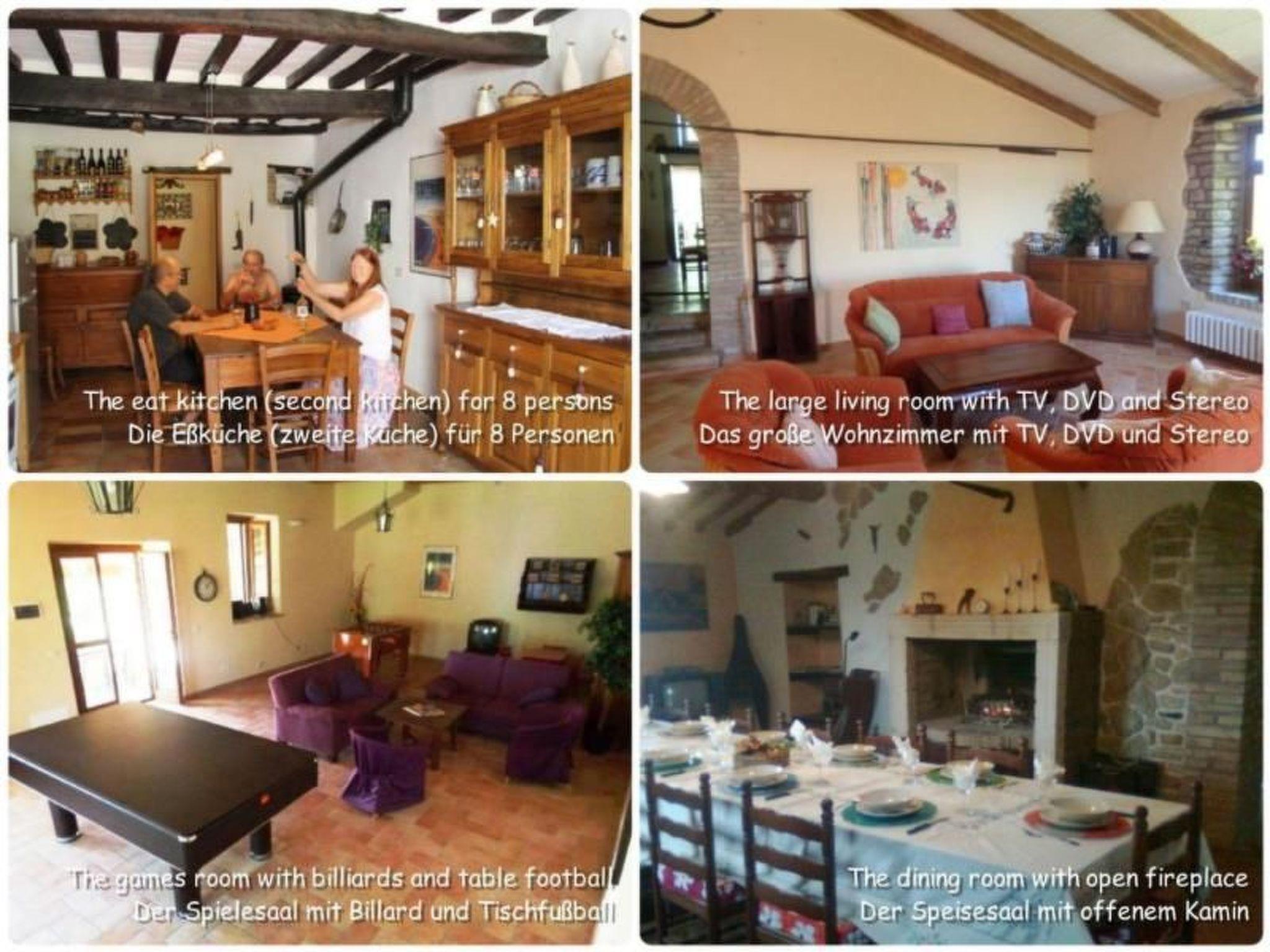 Inside, Ca' Piero durch gemütlich eingerichtete Doppelbettzimmer, die mit einer inneren Wärme und dem Charme des Südens empfangen. Jedes Zimmer verfügt über ein eigenes Badezimmer mit Dusche. Zusätzlichen Komfort bieten ein Wohnzimmer mit Schlafcouch, Kamin und Pelletofen sowie zwei voll ausgestattete Küchen für die Zubereitung kulinarischer Genüsse. Ein großes Esszimmer mit eindrucksvollem offenen Kamin lädt bis zu 16 Personen zu stimmungsvollen Mahlzeiten ein. Entspannung nach dem Essen finden Sie im Wohnzimmer mit einer Größe von über 65 qm, ausgestattet mit modernen Annehmlichkeiten wie Stereoanlage, DVD-Player, TV und Internetanschluss, sowie einer Bibliothek, Spielesammlungen und einem neuen Spielesaal mit Tischfußball und Billardtisch.