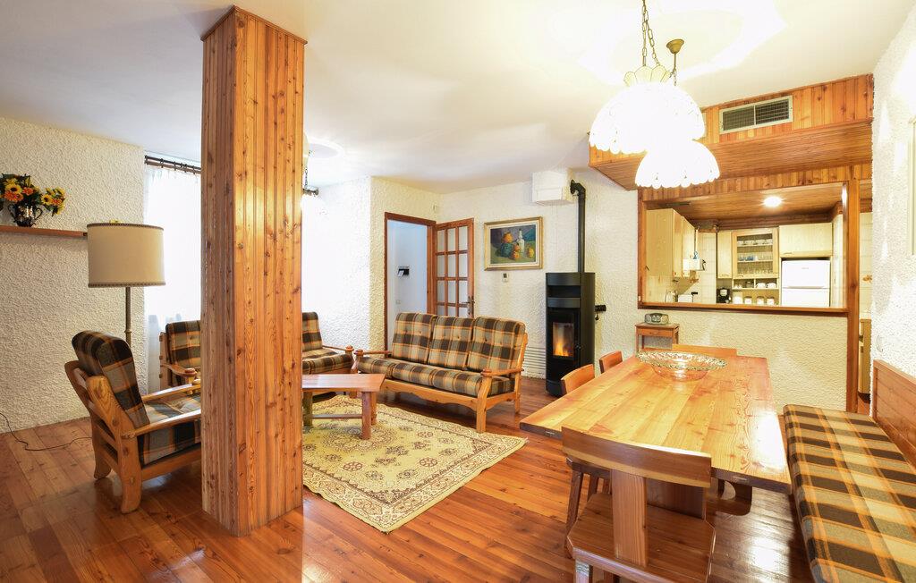 Jeres ferielejlighed ligger idyllisk indlejret i naturen og tilbyder en ideel kombination af rustik charme og moderne komfort. Hyg jer i det rummelige opholdsområde med de smukke trædetaljer, og slap af her efter en dag fuld af opdagelser i området. Brug det veludstyrede køkken til at tilberede jeres måltider, og nyd dem ved det hyggelige træspisebord, som også indbyder til hyggeligt samvær.