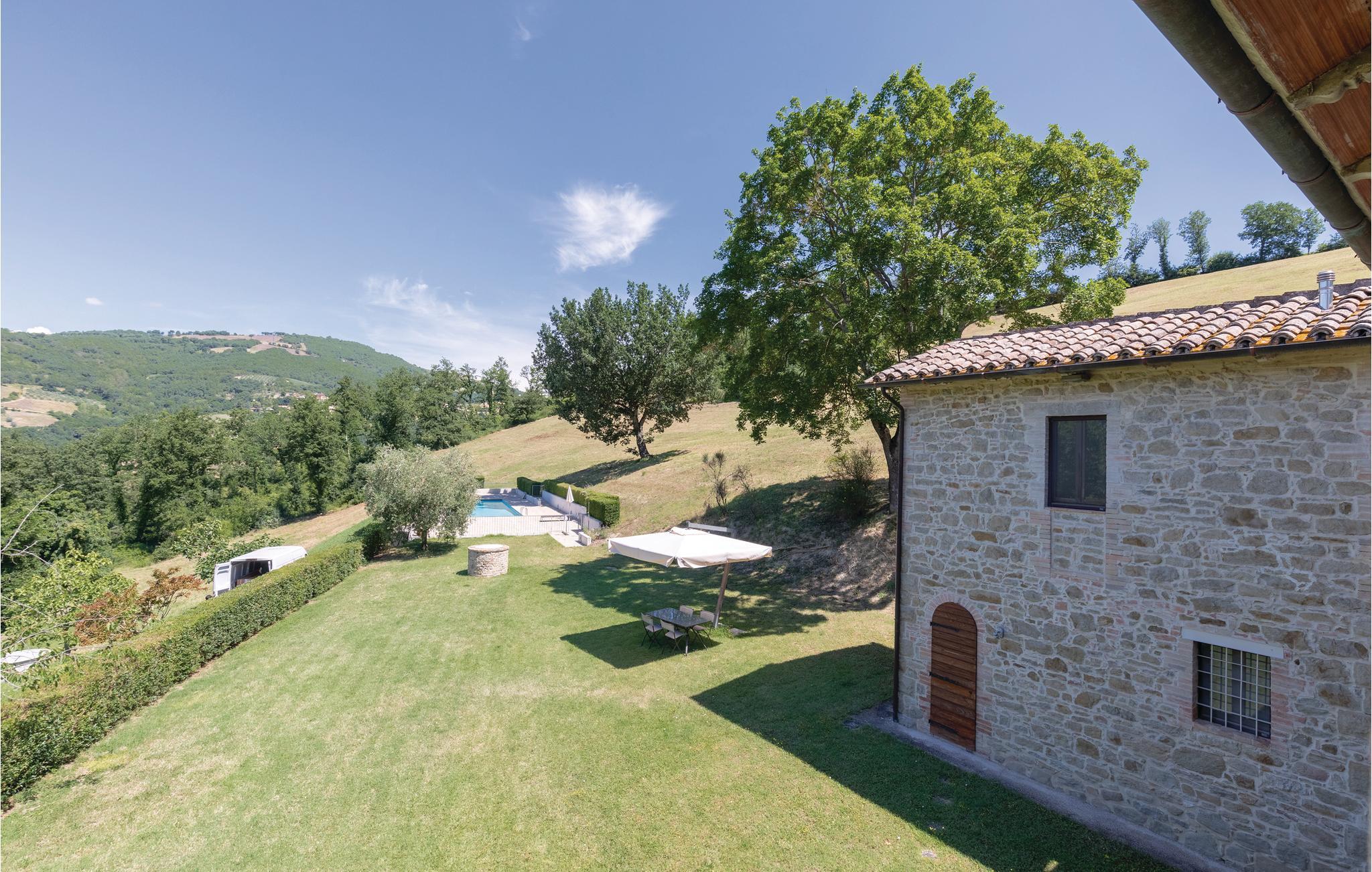 Glæd jer til at bo i særdeles smukke omgivelser på en bakketop, over en stor dal, omgivet af en skov med egetræer. Til hver lejlighed hører et privat område i haven med komfortable havemøbler. Poolen med en stor terrasse der inviterer til solbad og afslapning, med fantastisk udsigt, bruges fælles, bl.a. med gæsterne der bor i det der oprindeligt var en lade, nu feriebolig med to sovepladser. Området er skønt at vandre i. Indrettet enkelt og praktisk.