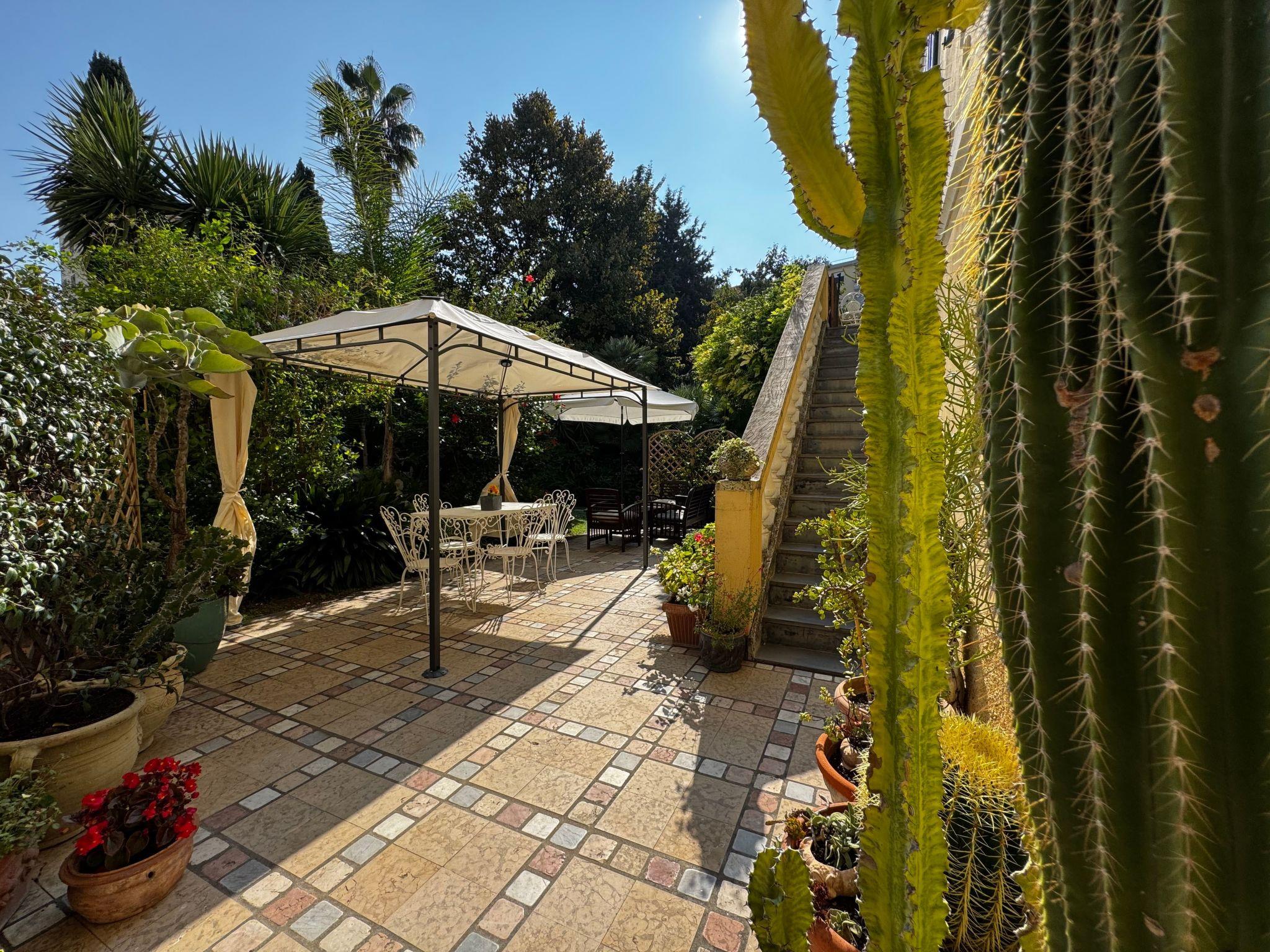 The flat overlooks a lush garden, equipped with tables and chairs, available for guests.