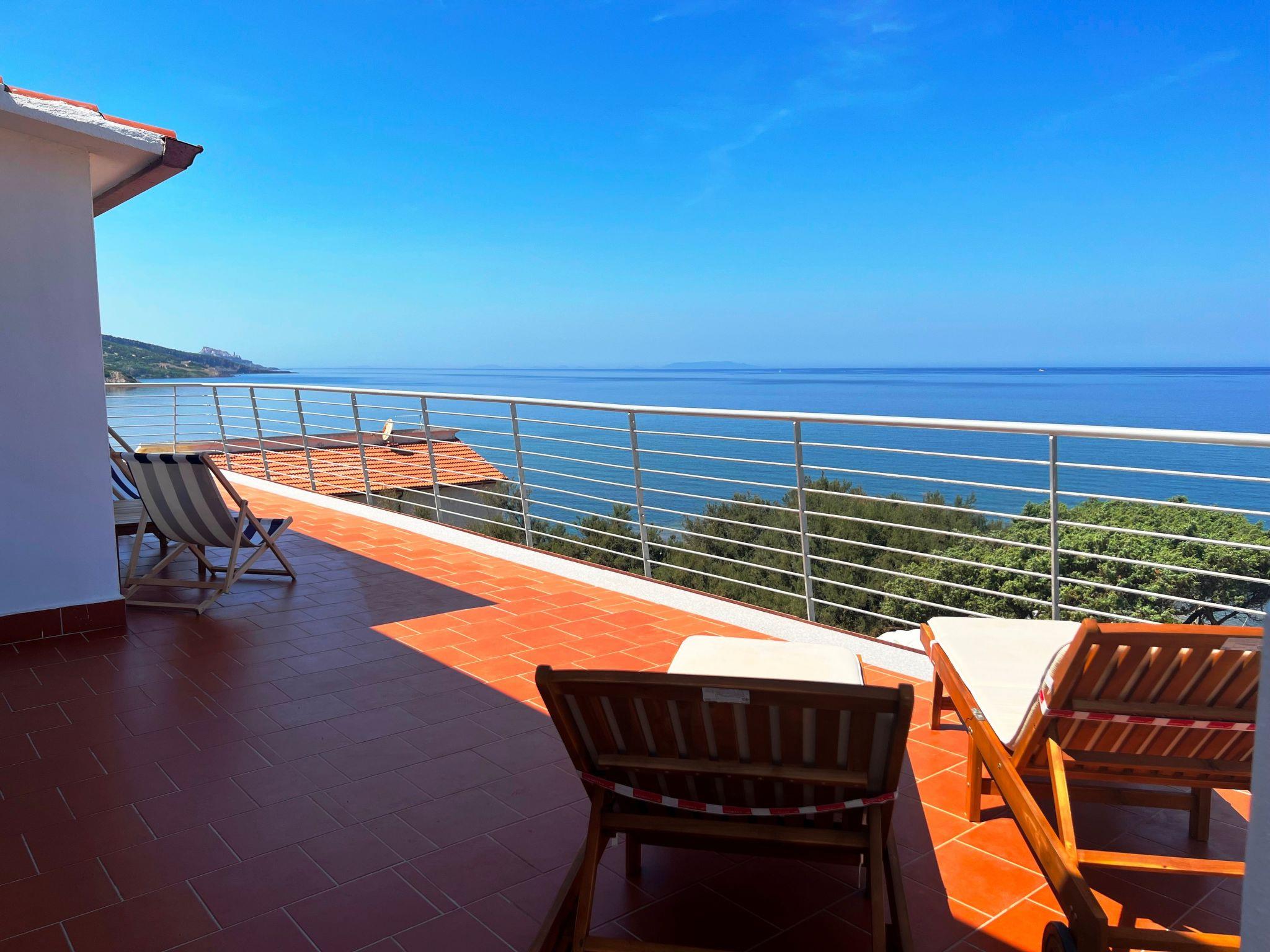 Splendid panoramic terrace overlooking the sea, for exclusive use, with veranda, table, chairs and barbeque. Well-exposed terrace, with a shady part under the veranda and a sunny part all day long. The surrounding garden for shared use is adjacent to the cliff and the beach.