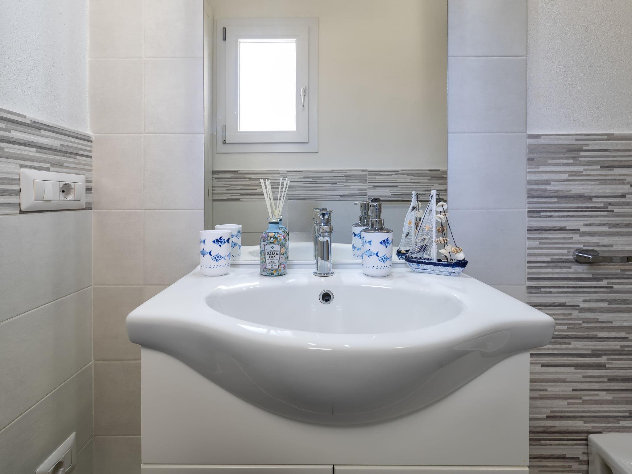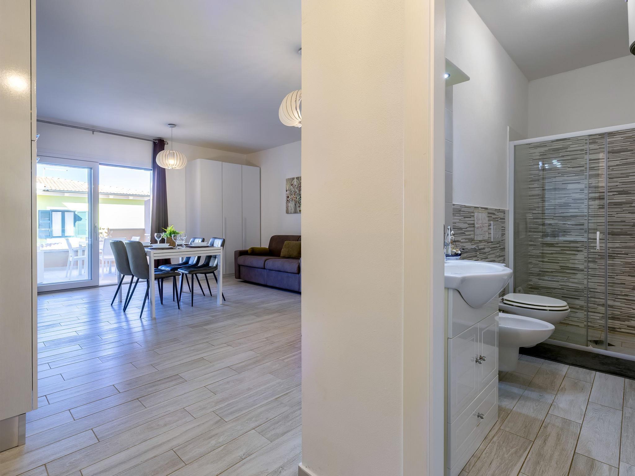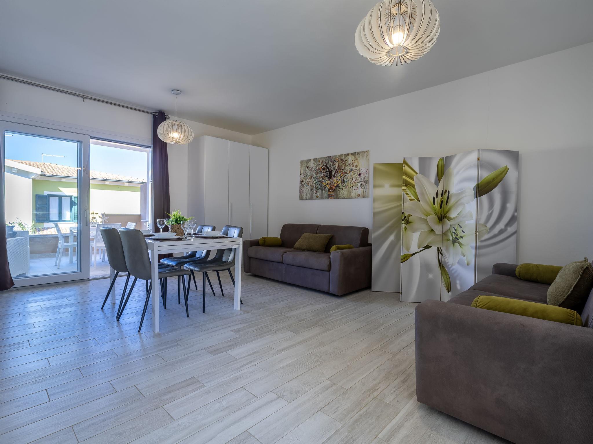 "Granello di sole", 1-room apartment 40 m2 on 1st floor. Modern and cosy furnishings: living/dining room with 1 sofabed, 1 double sofabed and satellite TV (flat screen). Exit to the terrace. Open kitchen (oven, dishwasher, 4 induction hot plates, toaster, kettle, electric coffee machine). Shower/bidet/WC. Air-conditioning, forced-air heating. Terrace 12 m2, roofed. Terrace furniture, sitting area. Facilities: washing machine, iron, hair dryer. Internet (WiFi, free). IT000000C0000T0000