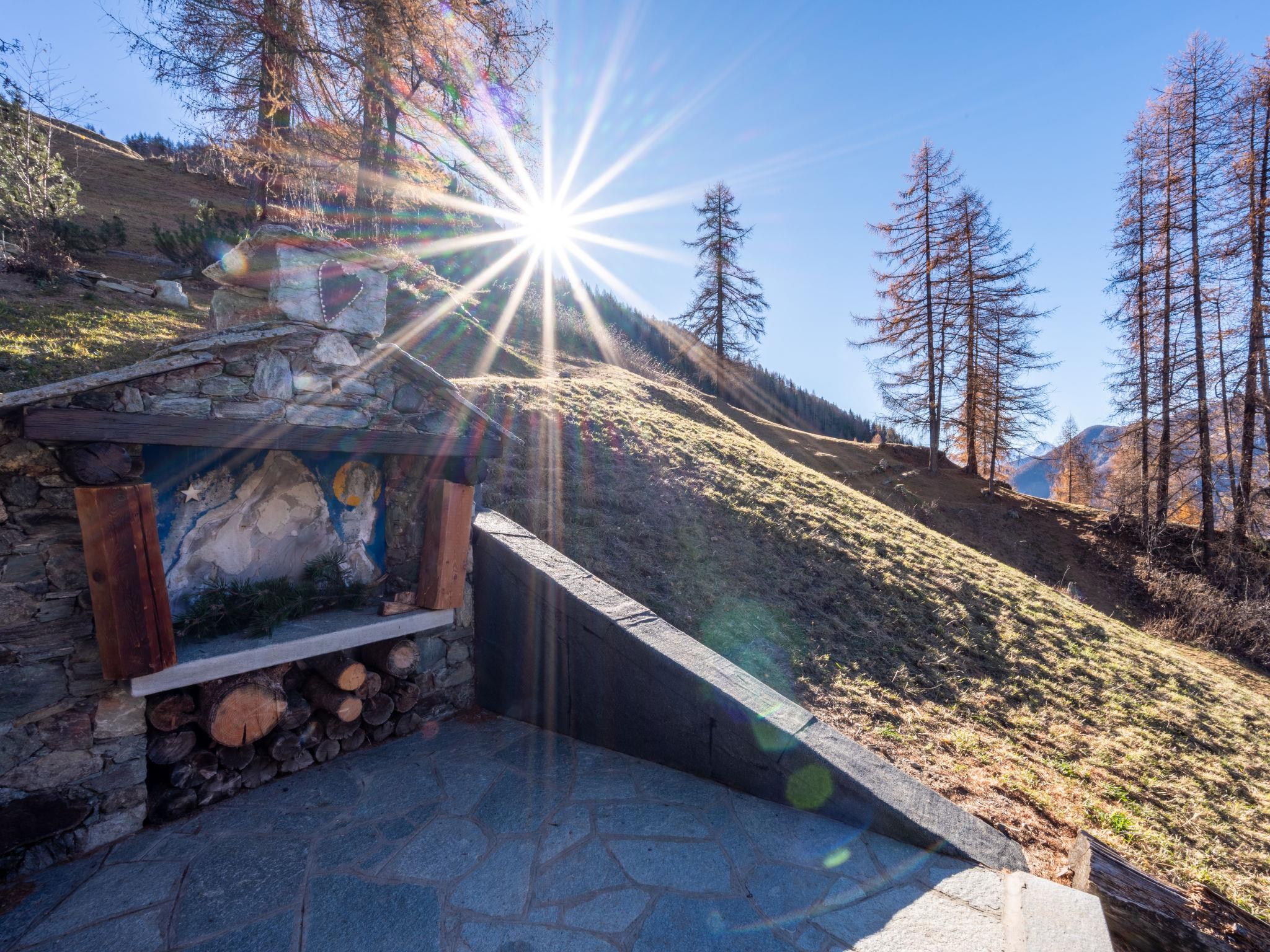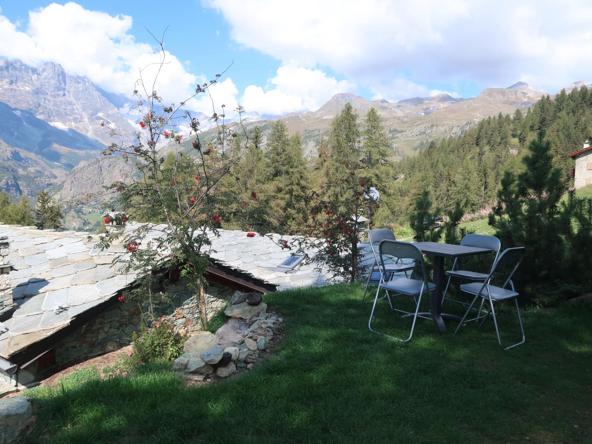Rustic chalet "Ancienne Bergerie", 1'900 m a.s.l., from the 17th century, renovated in 2015. 5 km from the centre of Valtournenche, 15 km from the centre of Breuil Cervinia, 25 km from the centre of Chatillon/Saint Vincent, in a secluded position on a slope. For shared use: property, terraced garden (not fenced), meadow. Motor access (200 m via unmade road). In Winter: please take snow chains. 200 m footpath to the house. Public parking 200 m. Supermarket 5 km, restaurant 3.2 km, bar 1.6 km, bus stop "Valtournenche" 5 km, railway station "Chatillon" 25 km, indoor swimming pool 8 km. Golf course (18 hole) 15 km, gondola lift 7 km, slopes 3.5 km. Hiking paths: Alta Via n°1 della Valle d´Aosta 50 m. In winter, snow boots, backpack and winter sports clothing are recommended.