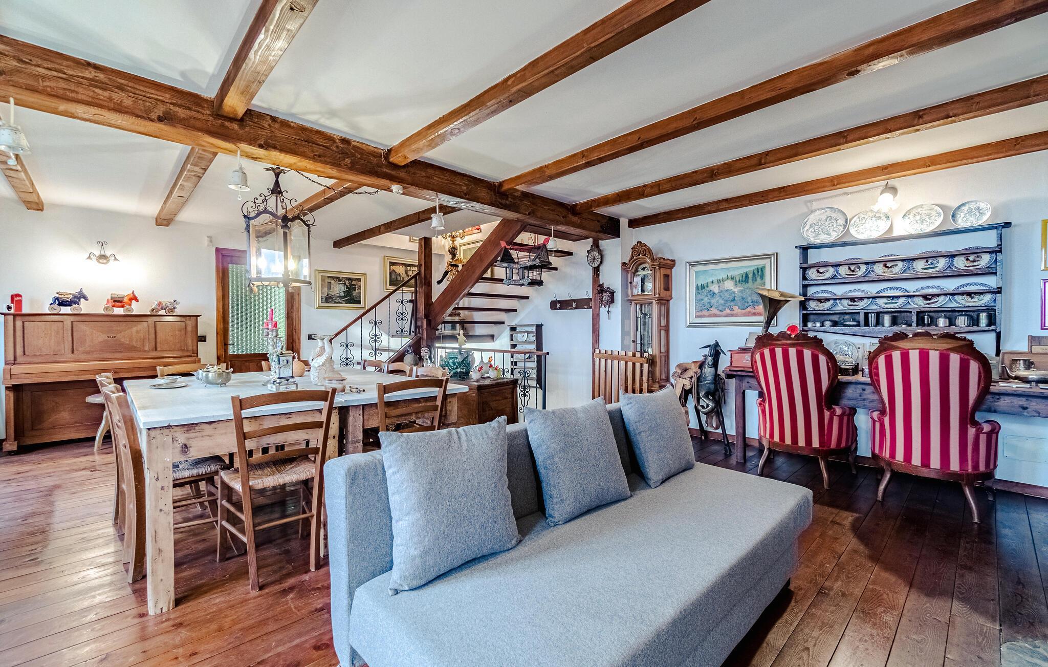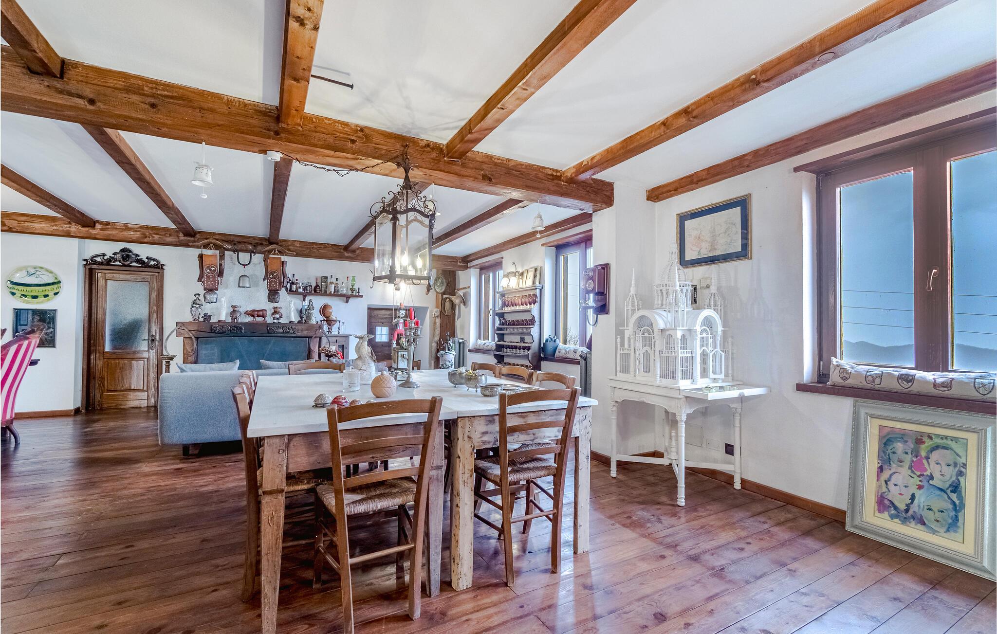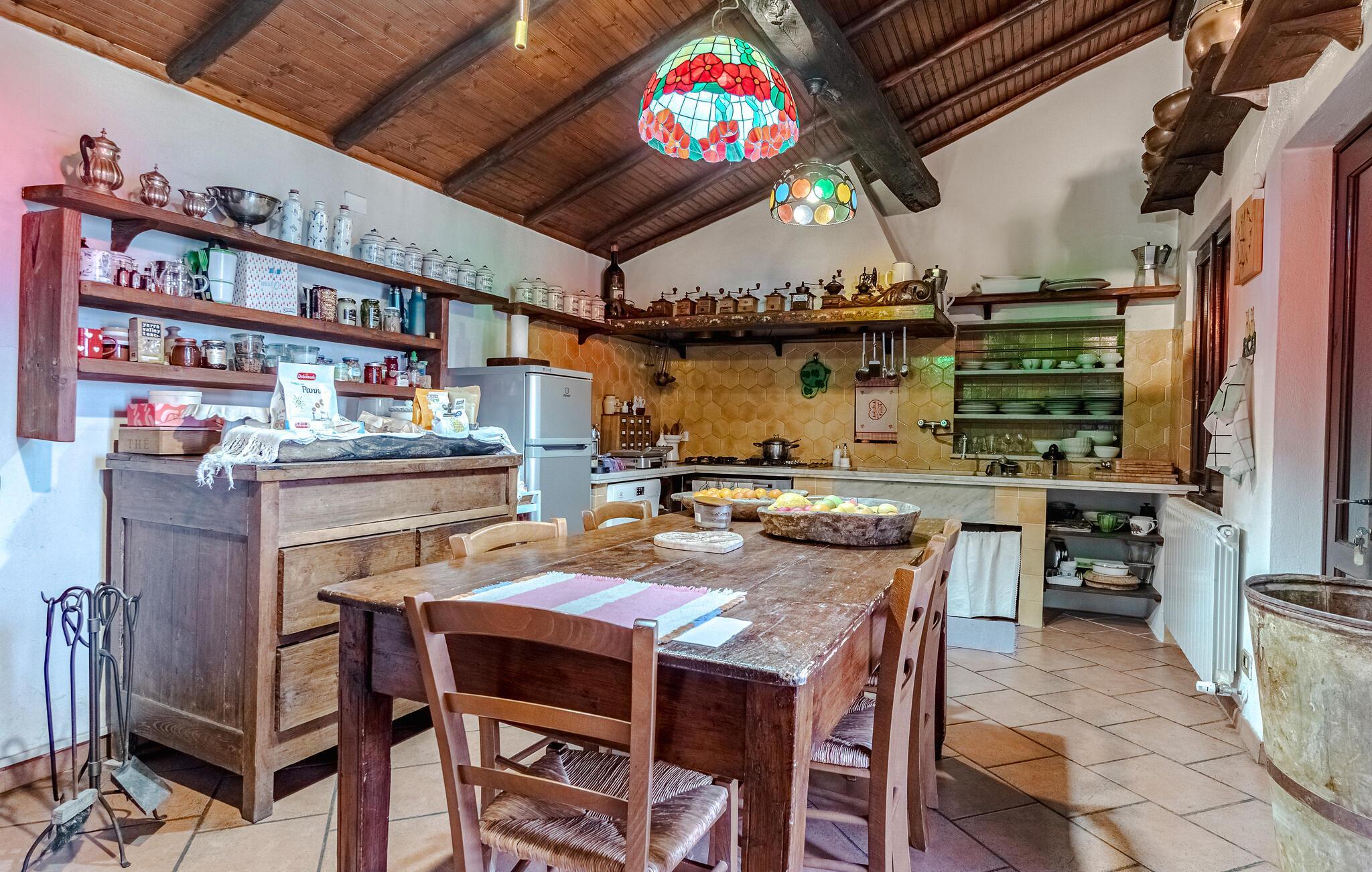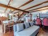 Dette rummelige og autentiske hus indbyder til afslapning med synlige bindingsværkstræk og en kærligt indrettet atmosfære. Den åbne pejs i stuen skaber en hyggelig stemning, mens det store, indbydende køkken med brændeovn, grill og professionel pålægsmaskine giver lyst til fælles madlavning. I den rummelige have med pool og terrasse kan I slappe af og nyde den vidunderlige udsigt helt ned til havet.