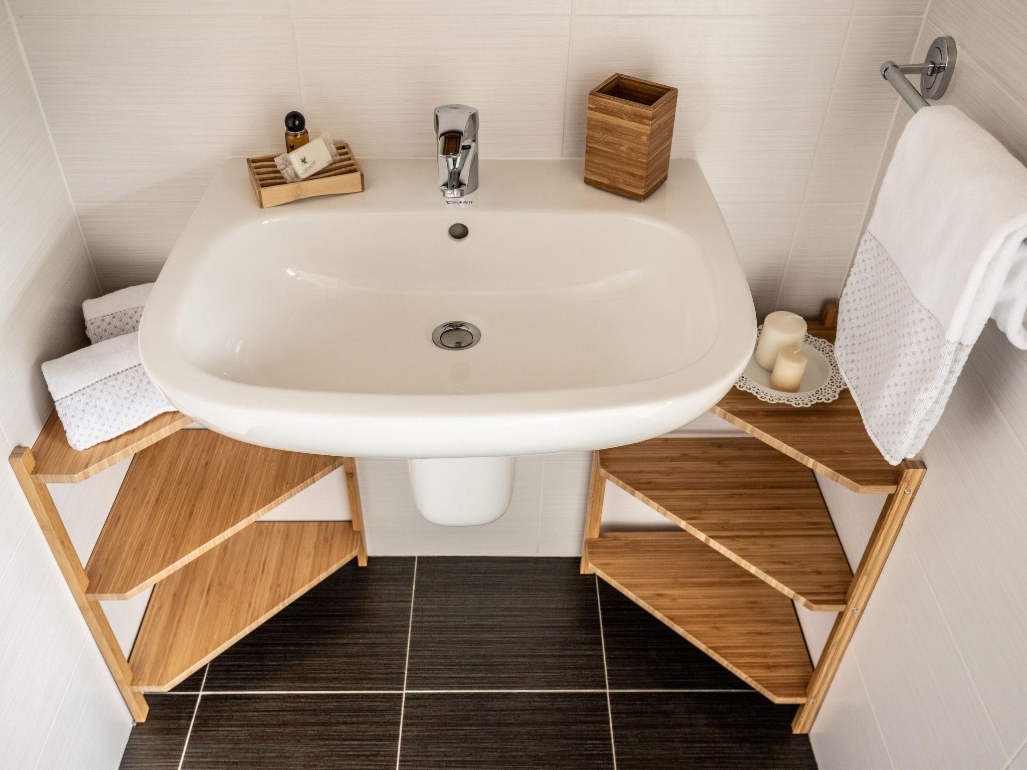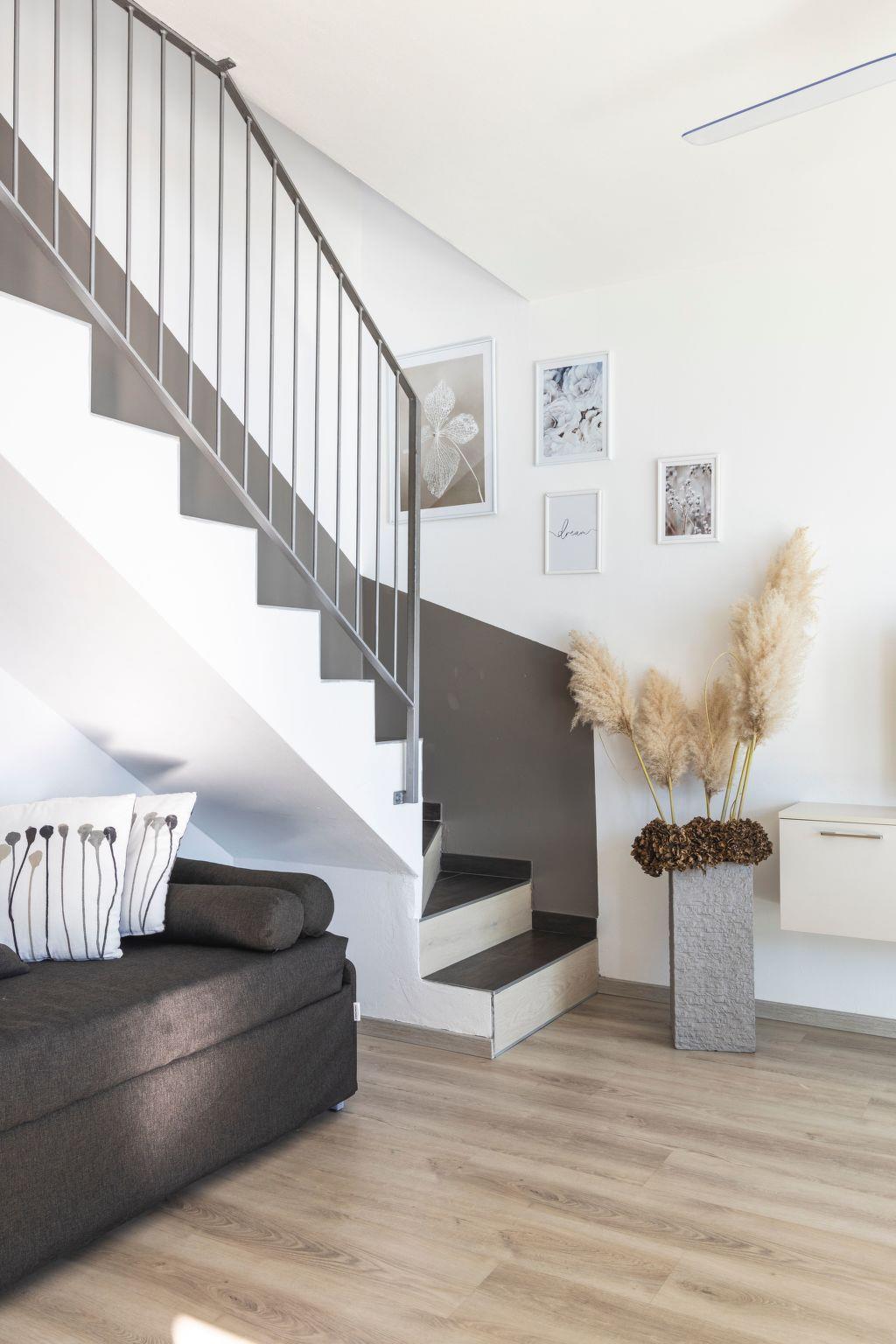 The apartment is located on the first floor of the building and spread over two levels. The ground floor has the daytime area with a big living room, an open kitchen and a dining space, with direct access to a sunny terrace overlooking the garden and the pool further down. One of the two bathrooms is also on this floor. The night-time area is on the upper floor, where there are two beedrooms, one with a double bed and the other with a double bed and a single bed, as well as the second bathroom of the apartment. Owing to the comfortable double sofa bed in the living room, up to six adults can be accommodated.