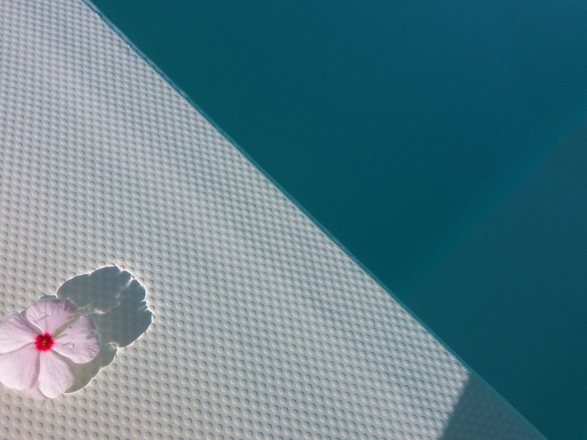 The swimming pool is surrounded by the solarium area, equipped with sunbeds and sun umbrellas.