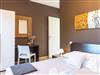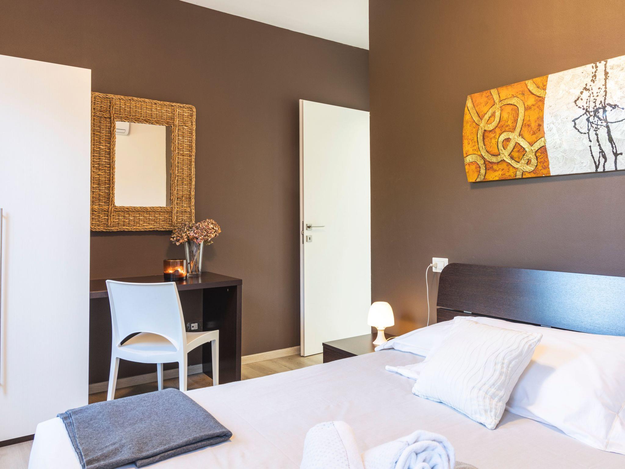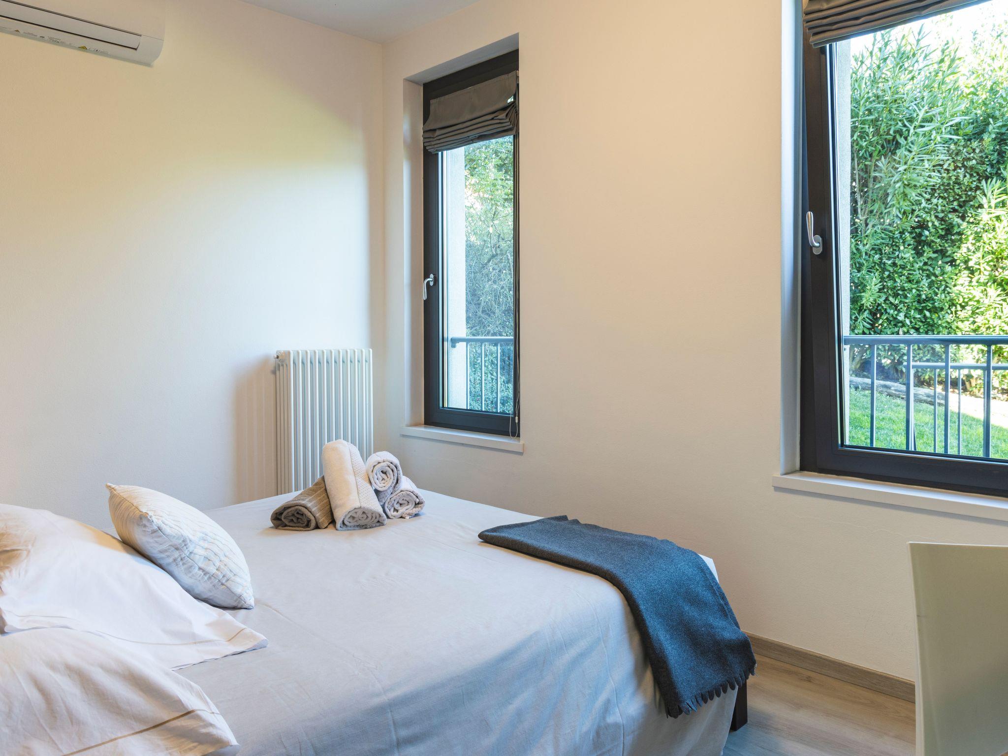 This is a ground-floor apartment with direct access to the garden and the pool. The big living room, with an open kitchen and a dining space, provides access to the roofed terrace with garden furniture, where you can drink a cocktail with friends, enjoy meals or simply relax and enjoy the view of the picturesque landscape. To the rear there is the night-time area with a double bedroom, a twin bedroom and a bathroom with a shower, bidet and WC. Both bedrooms are decorated with stylish and modern elegance, as is the whole apartment, and feature striking wall decorations. Owing to the comfortable single sofa bed in the living room, up to five adults can be accommodated.