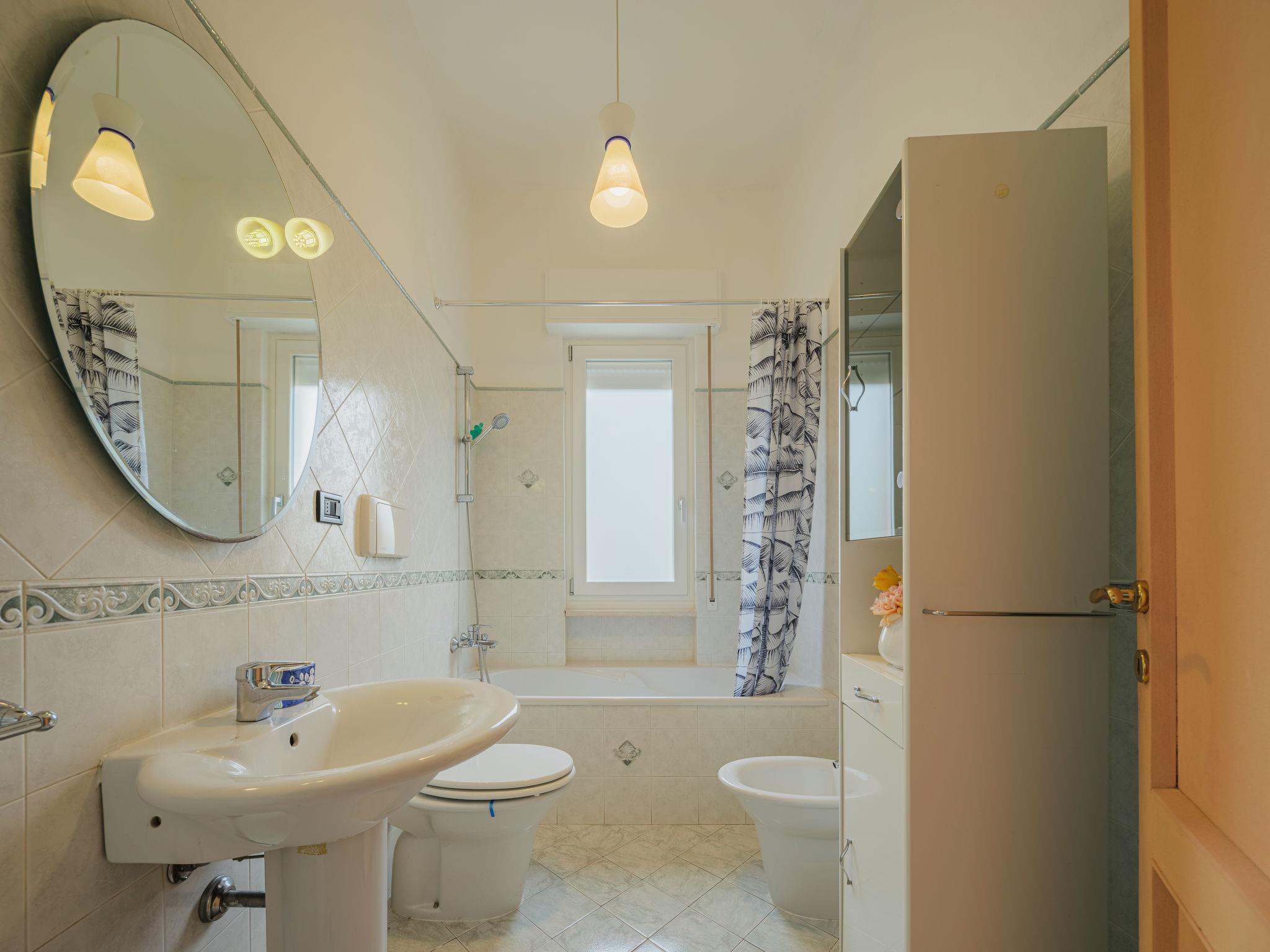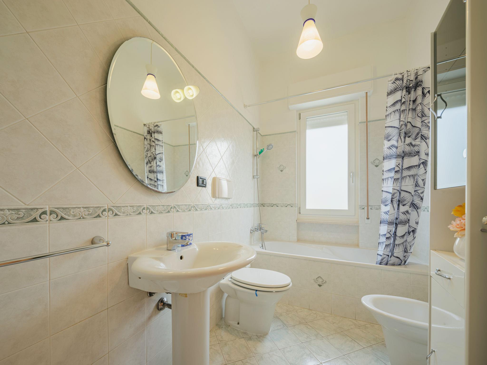 "Villa Margherita", 4-room semi-detached house 120 m2 on 2 levels, on the ground floor. Very comfortable and tasteful furnishings: large living/dining room with TV (flat screen). Exit to the balcony. Small kitchen (4 hot plates, oven, dishwasher, toaster, kettle, freezer, electric coffee machine) with dining table. Exit to the garden, to the balcony. Shower/WC. Upper floor: 2 large double bedrooms. 1 small room with 1 bed. Bath/bidet/WC. Gas heating. Heating available only from 01.11. to 15.04. Terrace, large garden. Terrace furniture, deck chairs (2), sitting area. Facilities: washing machine, iron, mosquito net. Internet (WiFi, free). IT046033C2QELLS98A