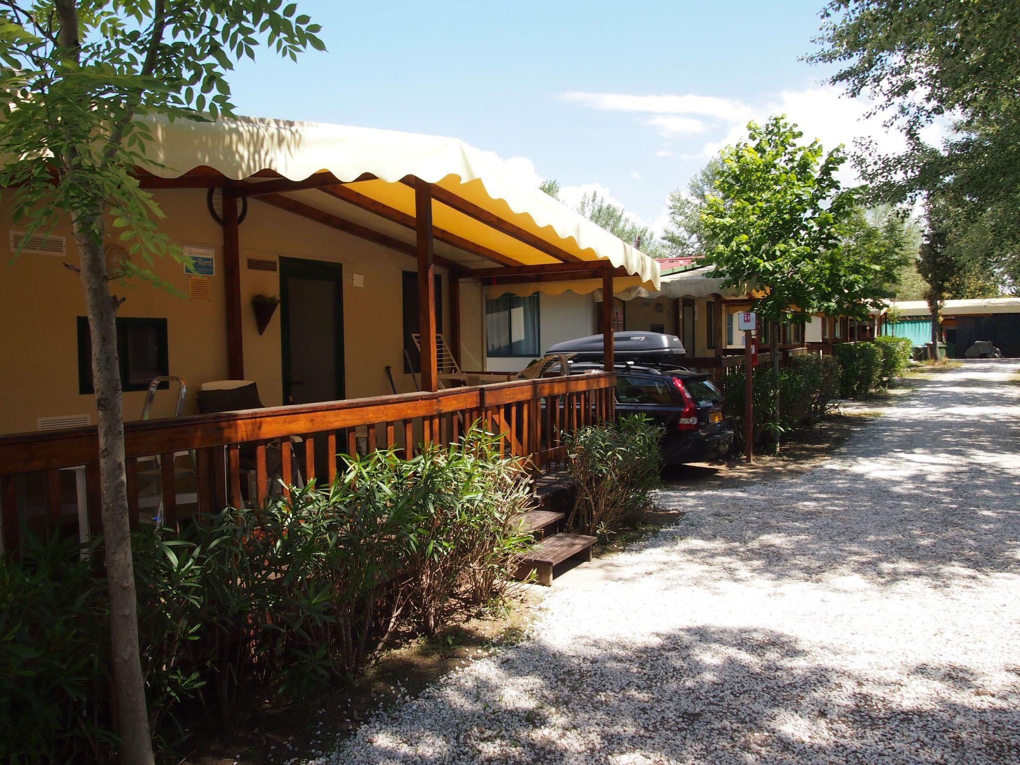 Outside there is a large, roofed and furnished veranda measuring 7 x 2m.Next to the mobile home there is a free private parking space.From the campsite there is a shuttle bus to the seaside, only in the main season There is also a large children’s playground with six large trampolines, a football pitch, climbing frames and a shared swimming pool.There are also a restaurant, a supermarket, a shop with camping gear and bike and mountain bike rental.The campsite has a capacity of around 400 places and there is a reception where Italian, German, Dutch and English are spoken.