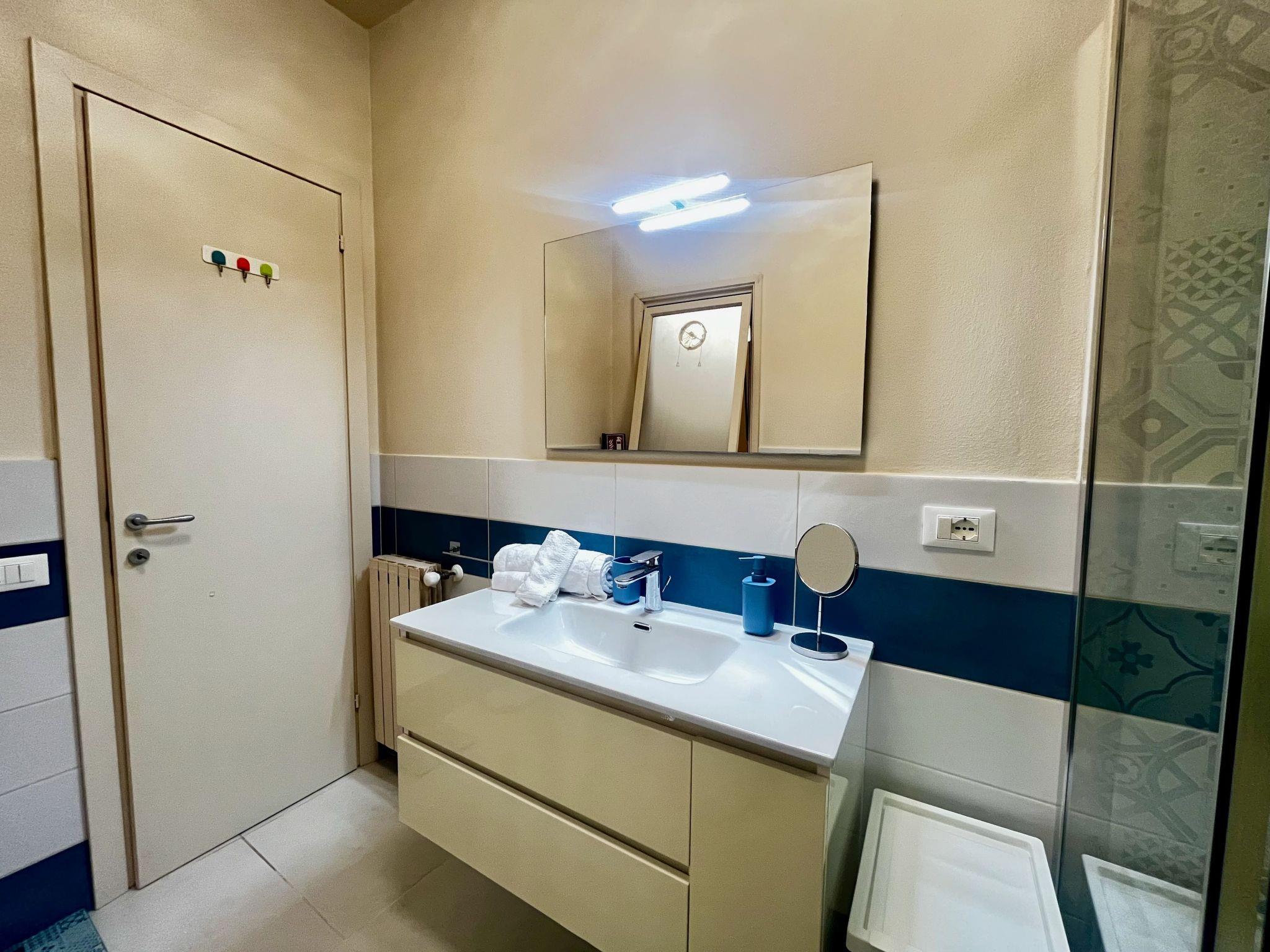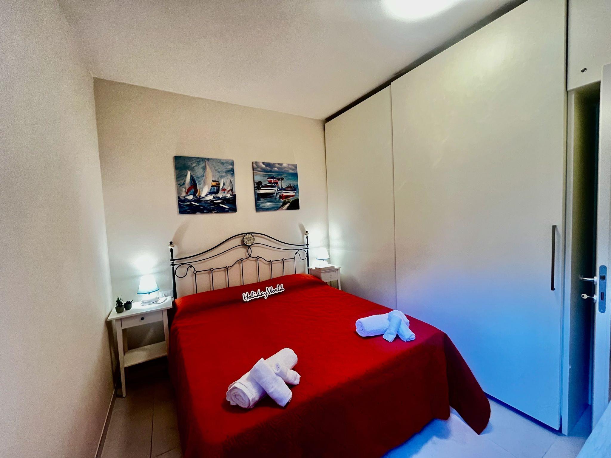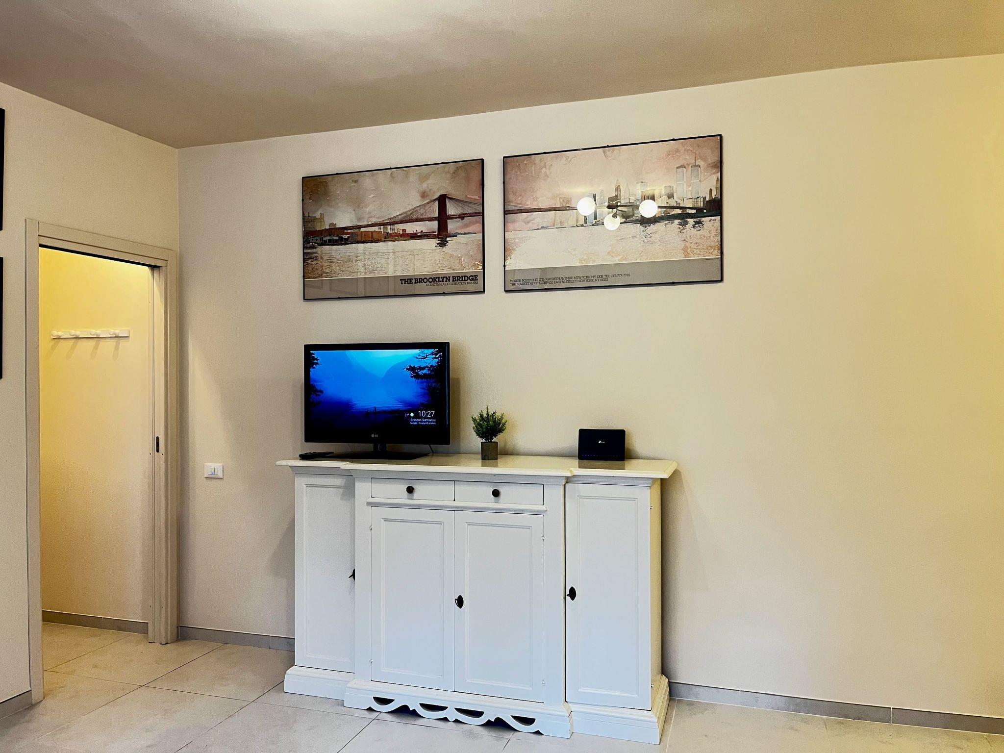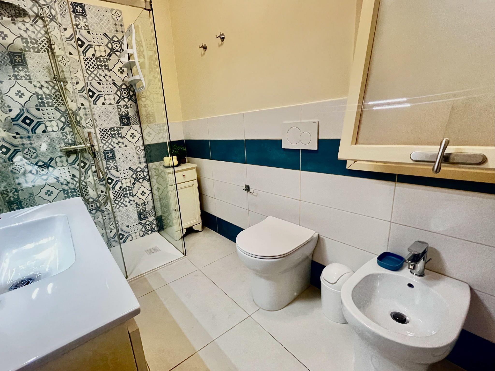 The flat consists of an entrance corridor, living room with two armchair beds and smart TV, equipped kitchenette with access to the small service terrace, double bedroom complete with large built-in wardrobe, windowed bathroom with shower and laundry room. Equipped with wifi, independent heating system and inverter air conditioning with split in the bedroom and living room, the flat is suitable for all seasons of the year.