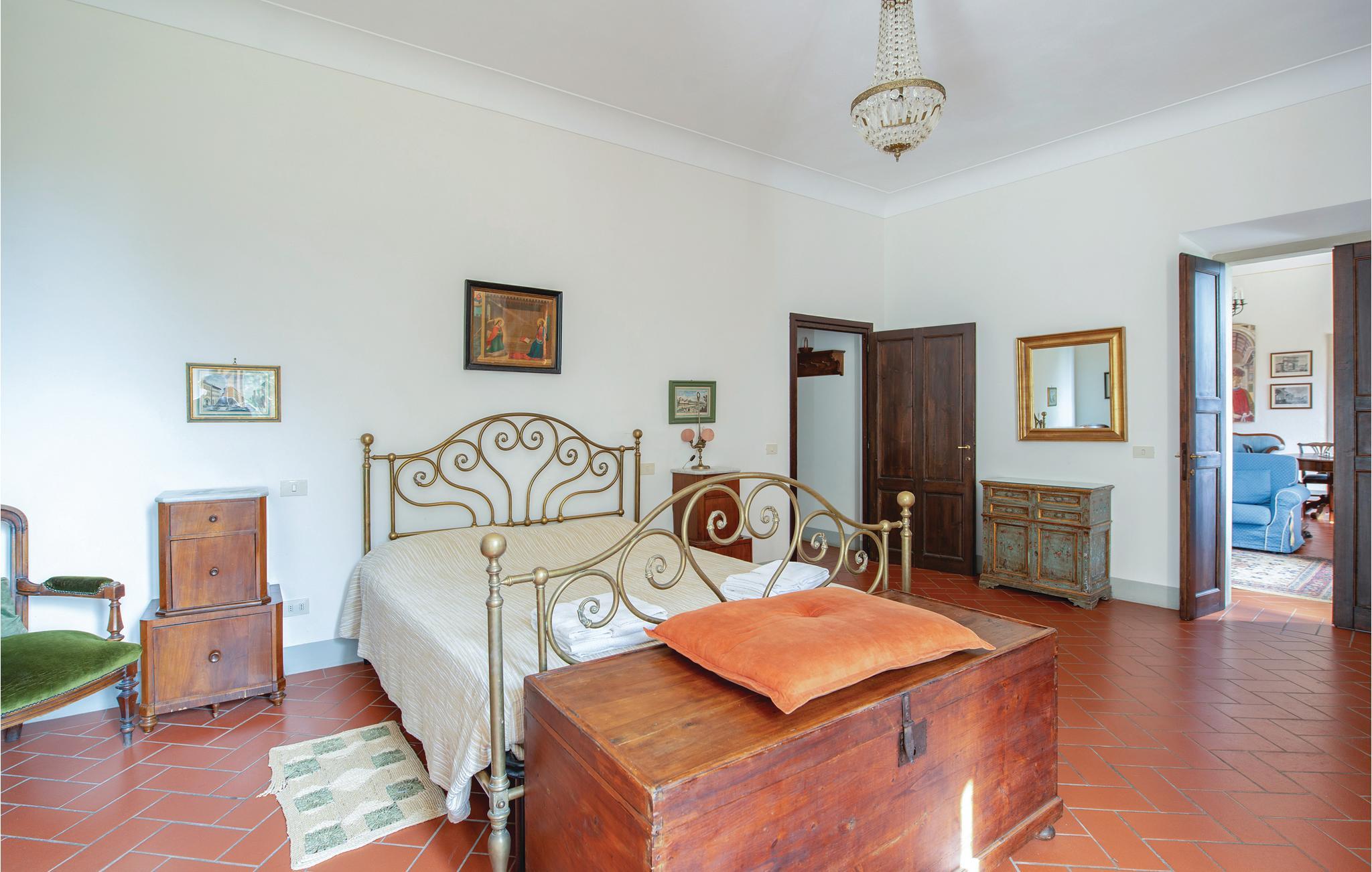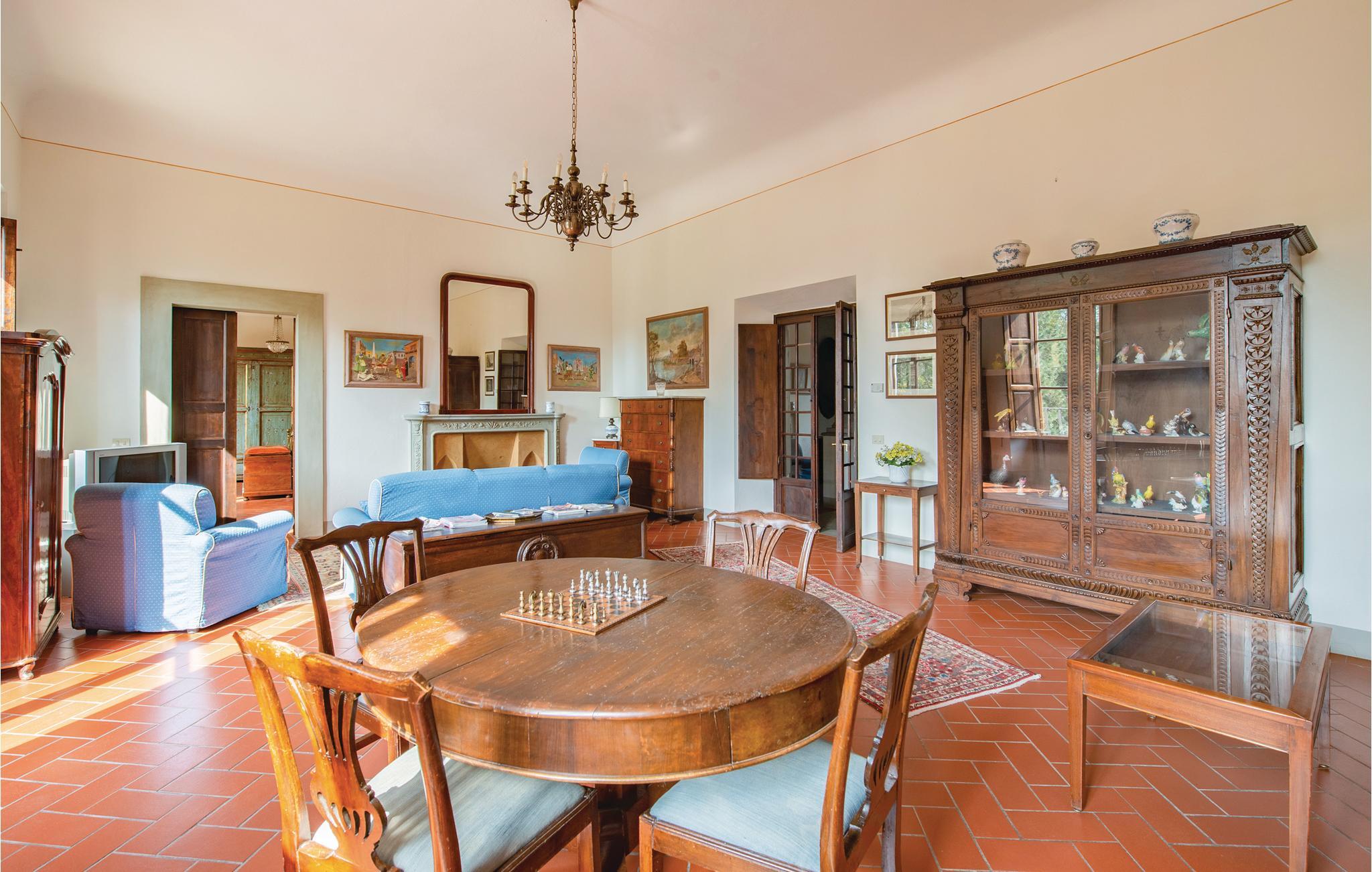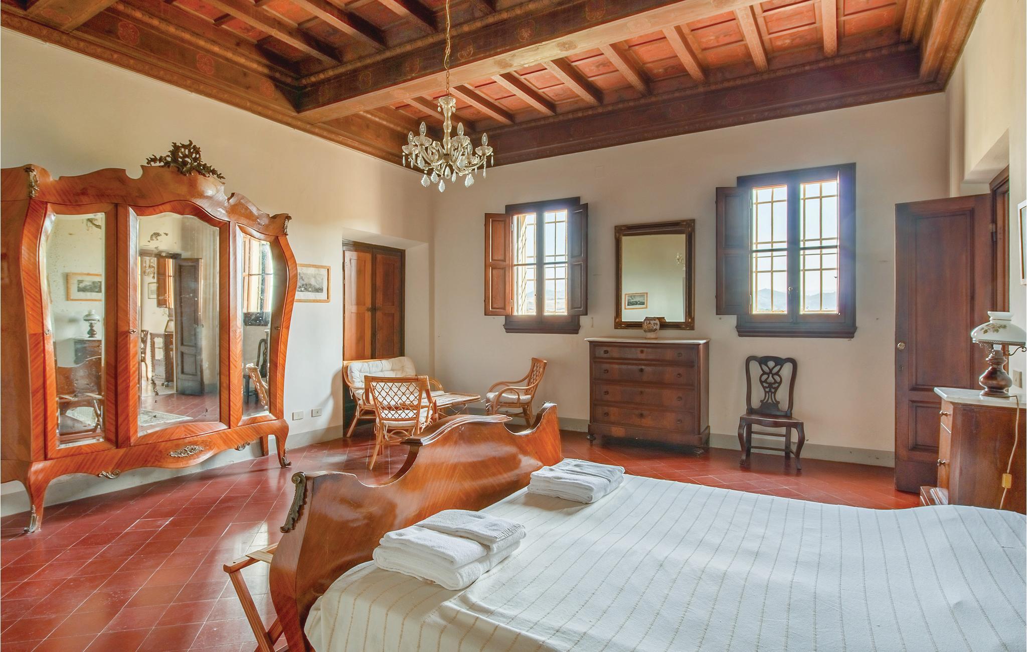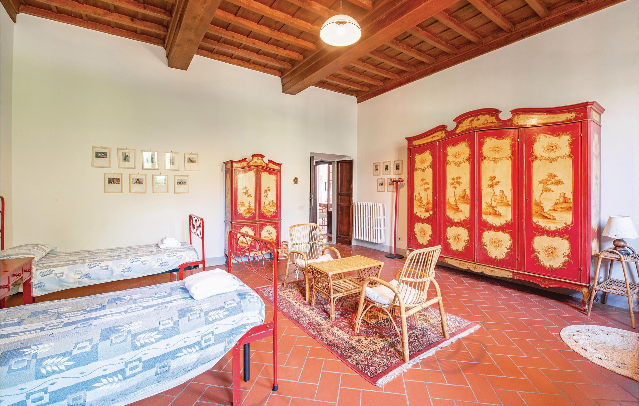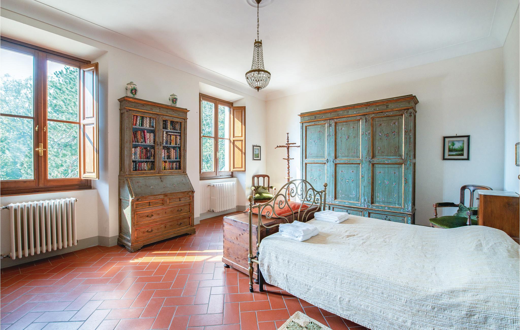 Dette herrehus er fra det 18. århundrede, nu forvandlet til en skøn ferievilla, der er omgivet af en stor indhegnet park (ca. 10.000 m²) og med privat pool, og ligger højt ca. 3 km fra landsbyen Vicchio. Villaen strækker sig over to etager, er meget rummelig og har bevaret sin oprindelig charme med kassettelofter og antikke møbler, men byder samtidig på alle former for moderne komfort. Her er god plads til to eller flere familier med børn, eller grupper af venner, der gerne vil holde ferie sammen. De yngste gæster kan se frem til en stor legeplads, mens de voksne kan se frem til at sidde under skyggen af århundredgamle træer med en god bog. Poolen indbyder både store og små til forfriskende vandleg og svømmeture. Pergolaen med stort bord og stole, indbyder til udendørs måltider med panoramaudsigt over Mugello-bakkerne. Her er utallige udflugtsmuligheder i den smukke natur både til fods og på cykel. Tag fx til Bilancinosøen (ca. 25 km), hvor I kann fiske, sejle kano, windsurfe og bare tage en svømmetur. Firenze ca. 40 km, og I kan tage toget fra Vicchiobanegår (3 km) til Siena, Lucca og Pisa. To babysenge. Parker på grunden. Viceværten bor på den gård der ligger på villaens bagside. Bemærk: Ankomst kun mellem 15-17.