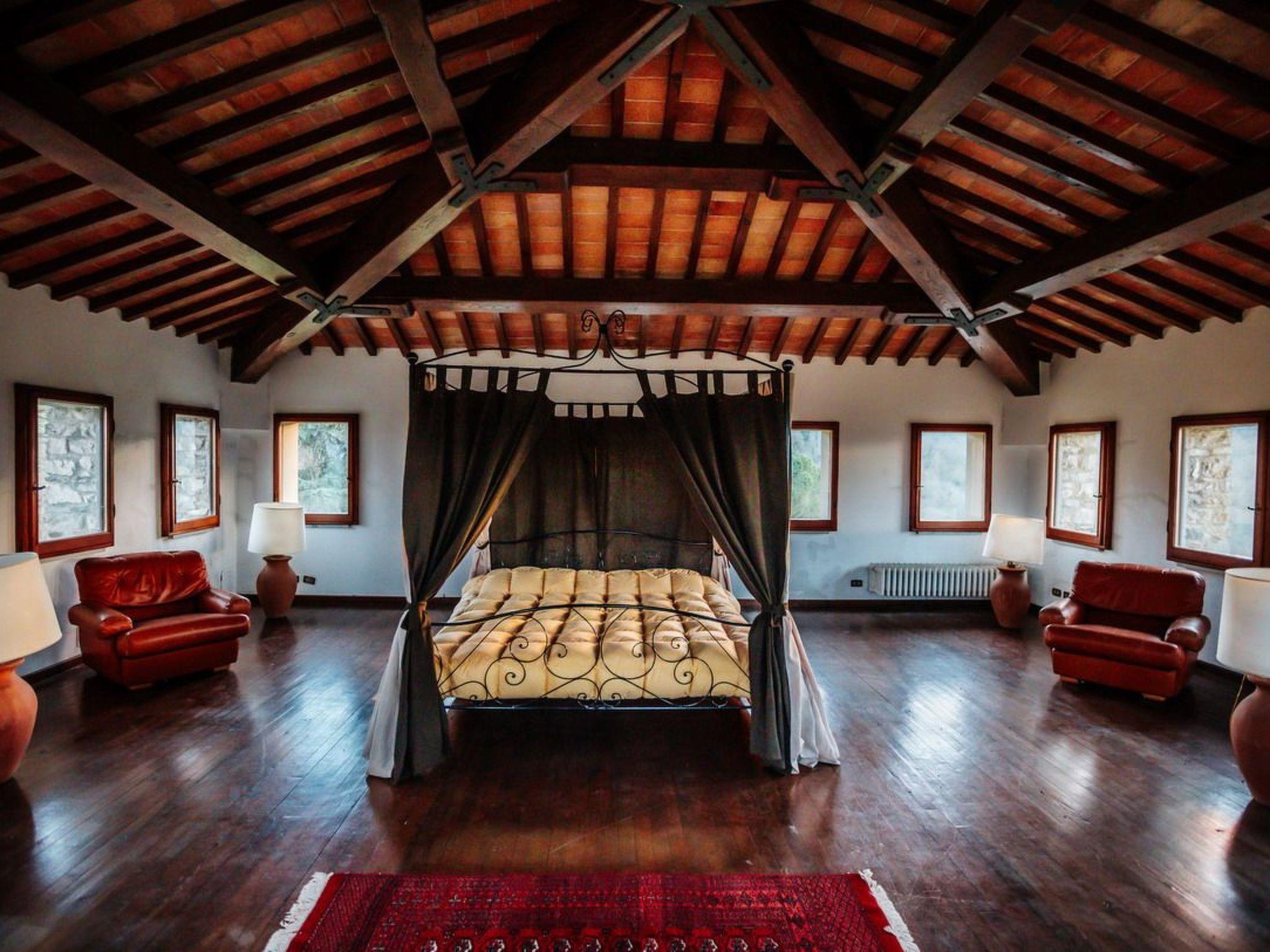 This magnificent old house has dense forest in front of it and spectacular views to the valley above all from the top of the tower where guest can sleep in the canopy bed. Outside a wonderful garden with a 12 x 6 swimming pool, a fabulous patio for “dining al fresco” during the summer and one gazebo. Inside the villa maintains all the antique features beacuse the rooms are decorated according to the traditional style with terracotta floors, and wooden beams ceilings. The fixtures and fittings are of excellent standard and the furnishing are really tasteful. Villa Torre Uliveto is ideal for 4/5 families or a large group of friends who want to enjoy each other’s company in perfect privacy. The villa is superbly located for exploring the very best of Tuscany. Lucca, Pistoia, Chianti Rufina, Chianti Classico and Casentino National Park are less than one hour driving and the center of Firenze is easily reachable in 35 minutes by train from San Piero a Sieve which is only 10 km. Villa Torre Uliveto is in the countryside of the area called Mugello where there are a lots of attractions like Bilancino Lake (20 km), Mugello Circuit (very famous for Motorcycle Grand Prix), the Fashion Outlet Mc Arthur Glen and several interesting medieval towns like Scarperia, Barberino, Vicchio and Borgo San Lorenzo.On request it is possible to rent Vespa or Fiat 500, make an experience in Mugello circuit and have a private chef at home. Pool is open from 1st of May until 2nd of October.