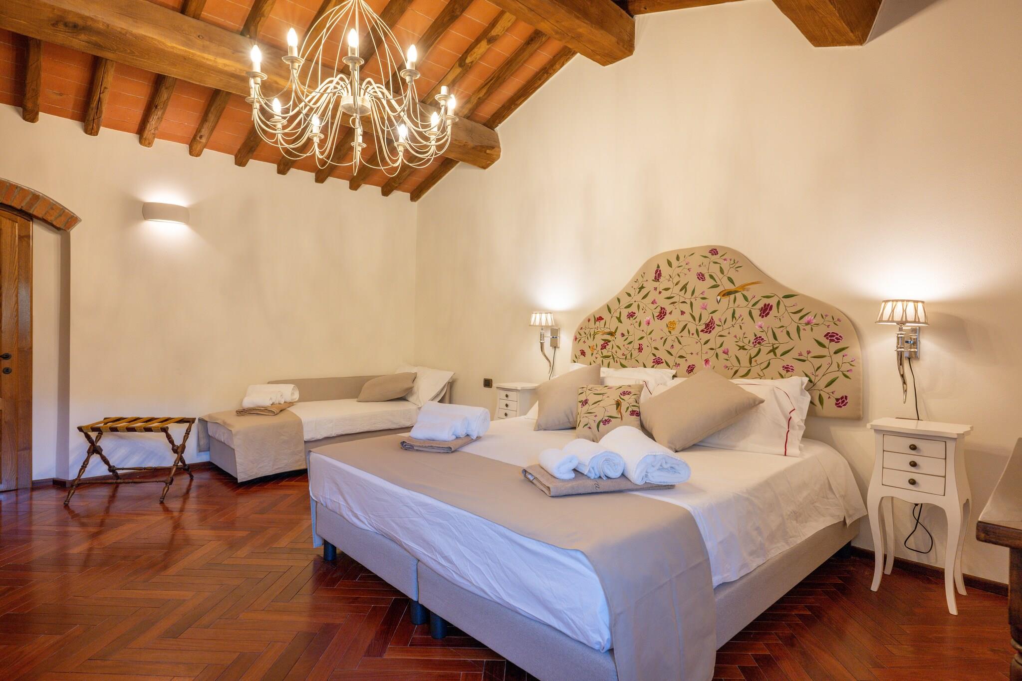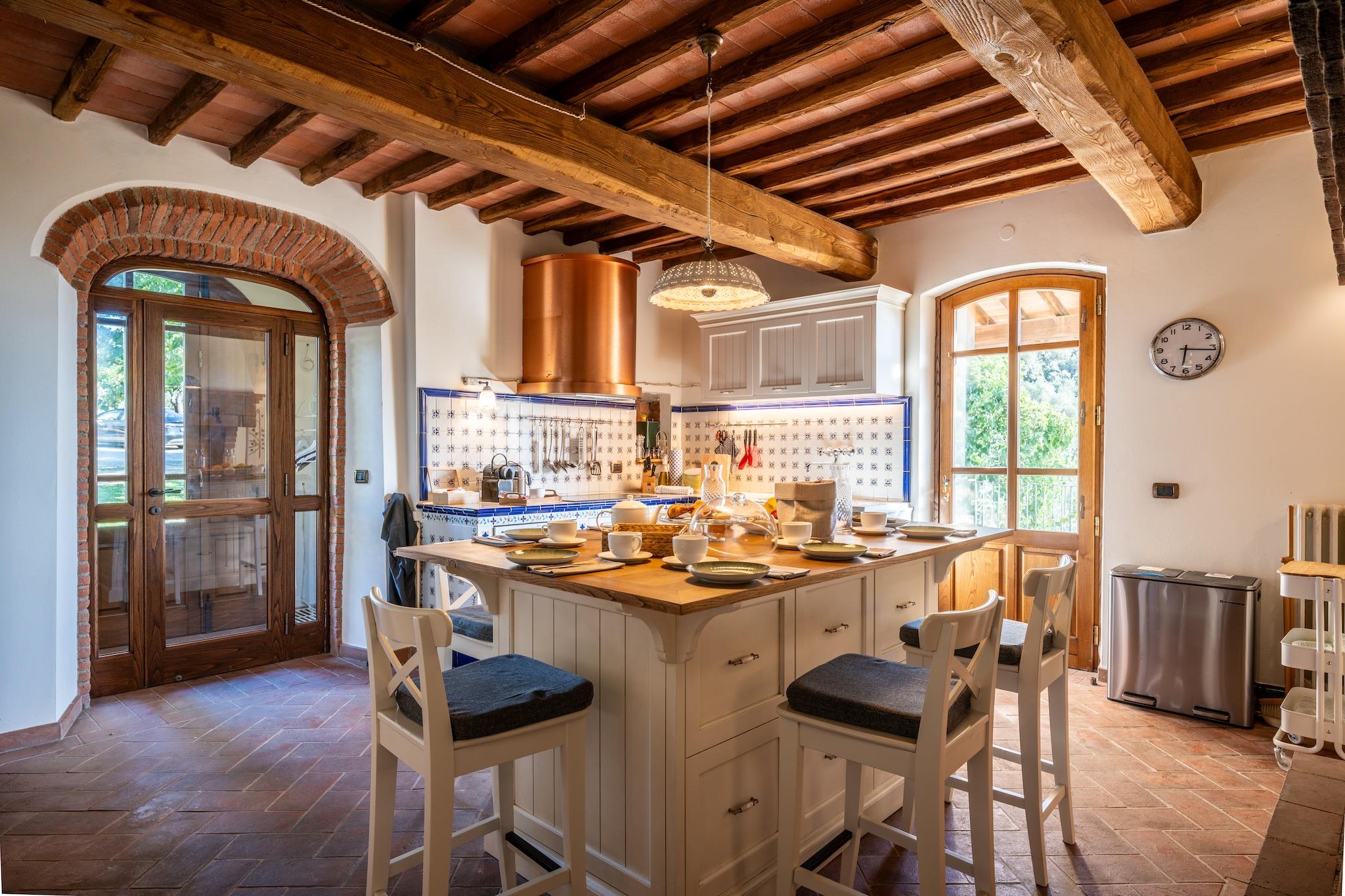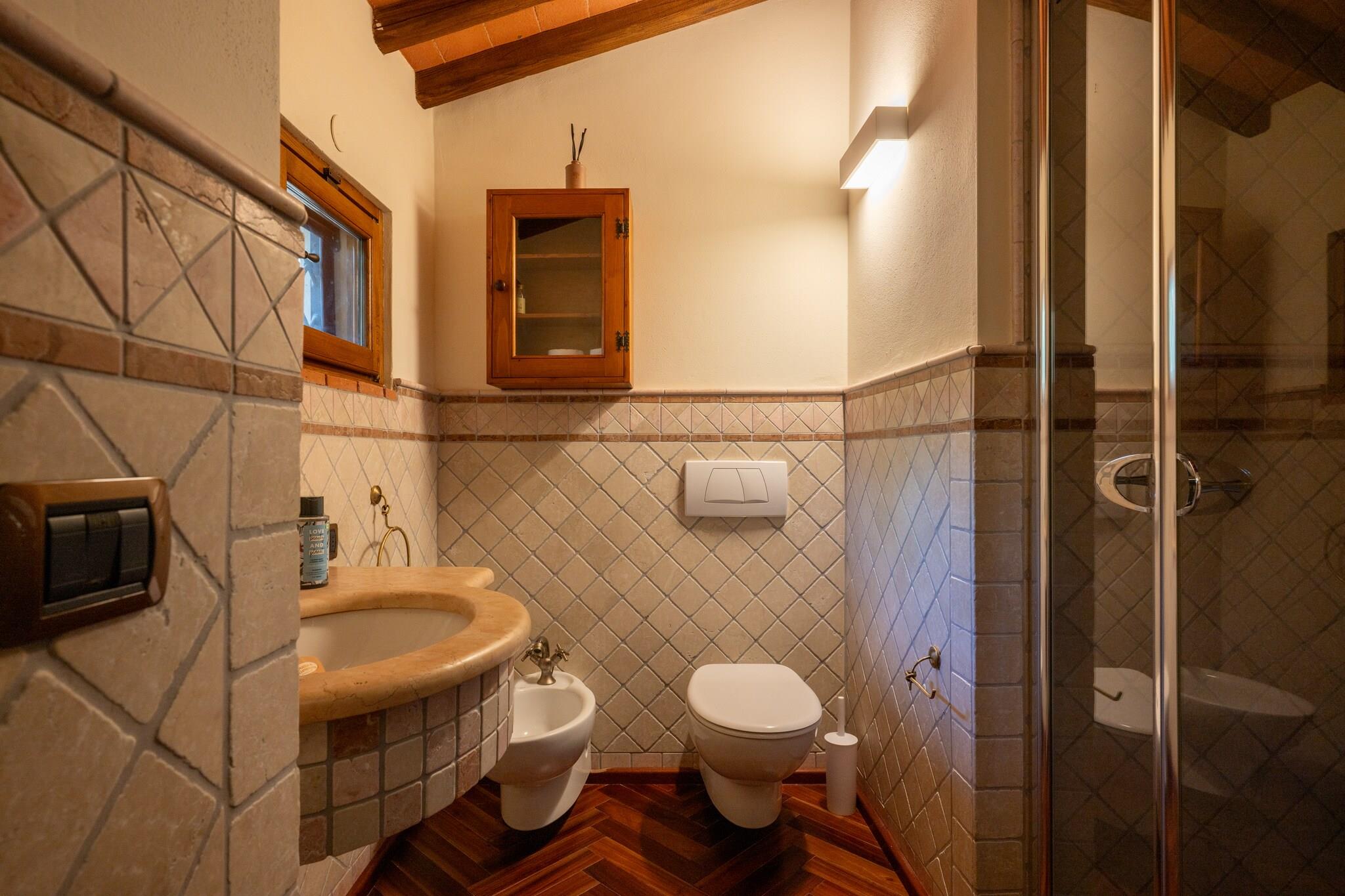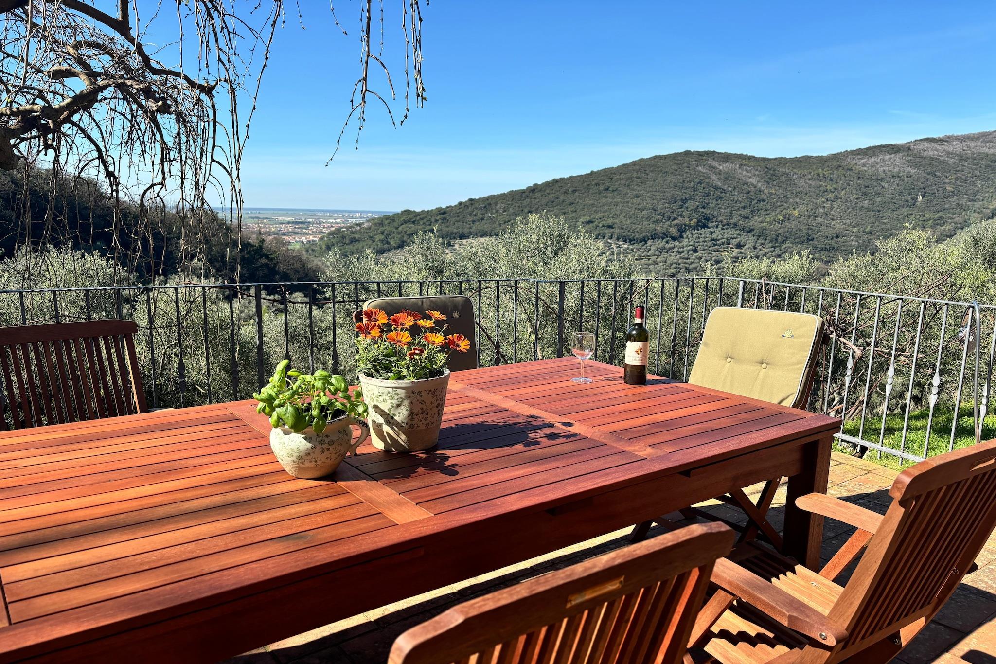 Tenuta del Serra - Luksuriøs toscansk villa midt i olivenlunde Oplev freden og skønheden i det toscanske landskab. Tenuta del Serra er en smuk, nyrenoveret ferievilla beliggende i hjertet af Toscana, midt i frodige olivenlunde. Her vil du opleve det ægte Italien: stilfuldt, smagfuldt og i fuldstændig harmoni med naturen. Villaen har plads til 8 gæster (en 9. seng er tilgængelig efter anmodning) og kombinerer traditionel toscansk arkitektur med moderne bekvemmeligheder. Et nyindrettet hjem med karakter, kærligt vedligeholdt ned til mindste detalje. Indenfor finder du en indbydende spisestue, en hyggelig stue og en autentisk "cantina" (vinrum), hvor du kan opdage og købe lokale vine. Det rummelige køkken er fuldt udstyret - med ovn, komfur, mikrobølgeovn, køleskab, opvaskemaskine og kaffemaskine - og inviterer dig til at lave mad, drikke og nyde sammen. Fra køkkenet træder du direkte ud på den udendørs terrasse, hvor en betagende udsigt venter. Alle soveværelser er rummelige, stilfuldt møblerede og har aircondition. Hvert værelse har sit eget moderne badeværelse med bruser, håndvask, toilet og bidet - privatliv og komfort garanteret. Udenfor venter den private pool med soldæk på dig. Omgivet af græs, komfortable liggestole og skyggen fra gamle oliventræer er det det perfekte sted at slappe af. Pergolaen og loungeområdet tilbyder kølende skygge på varme dage, og grillen og lysthuset er perfekte til lange sommeraftener under stjernerne. Den store olivenlund inviterer dig til at slentre rundt på grunden, og forskellige vandre- og mountainbike-stier omgiver villaen. Den maleriske by Vicopisano med sine snoede gader og middelalderlige tårne ligger kun en kort afstand væk. Firenze, Lucca, Pisa og Siena er også let tilgængelige. Tenuta del Serra er mere end bare et feriehus: det er et sted at slappe af, være sammen og opleve Toscana, når det er bedst.