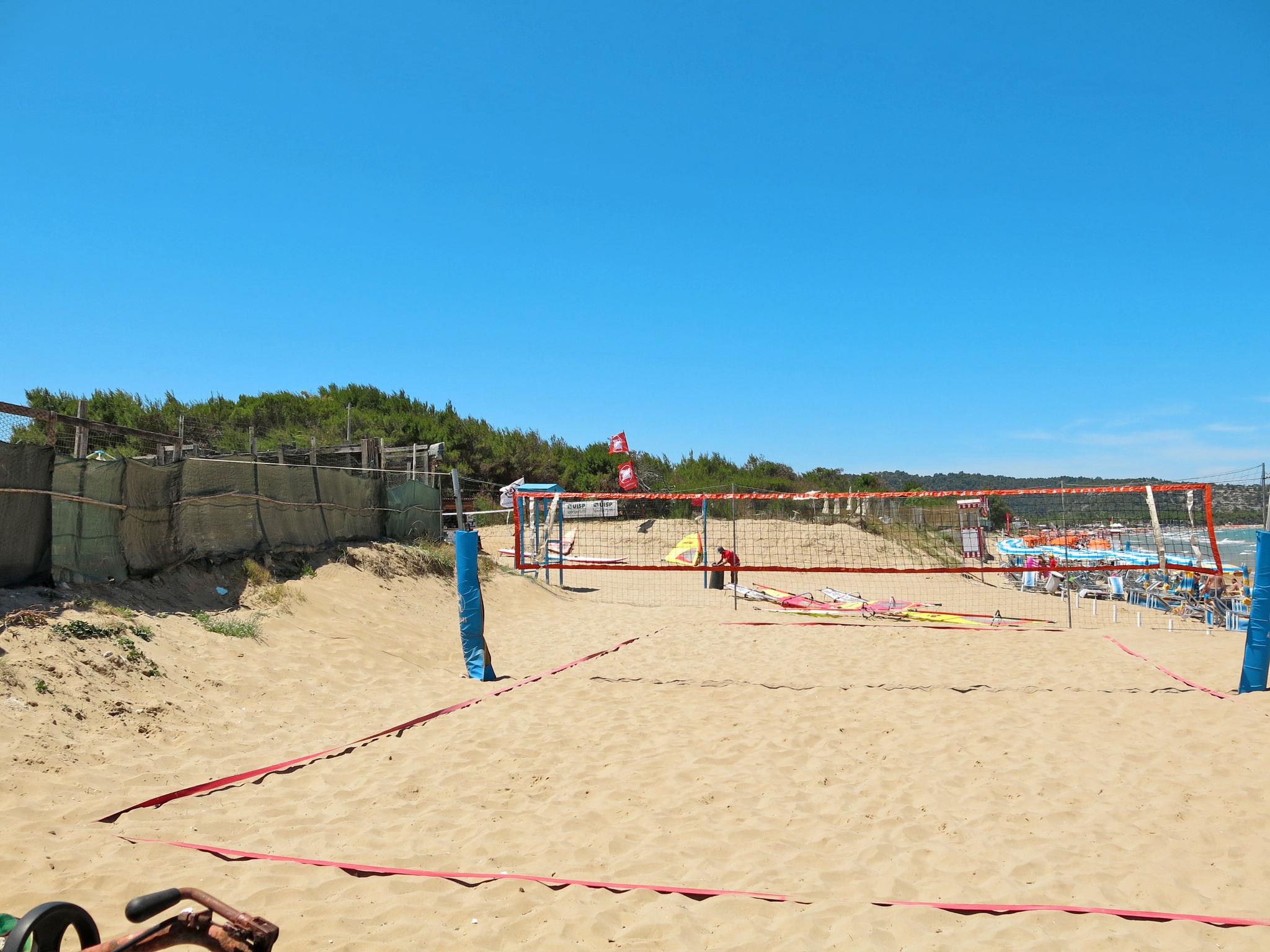 Gargano: Child friendly resort "Villaggio San Pablo". 35 houses in the resort. 70 apartments in the residence. 6 km from the centre of Vieste, 150 m from the sea, 150 m from the beach. For shared use: property 10'000 m2 (fenced), garden with plants and trees, swimming pool (15 x 6 m, depth 100 - 180 cm, seasonal availability: 23.May. - 26.Sep.). WC in the pool area, children's pool, outdoor shower, hot tub, tennis (25.Apr. - 26.Sep.), table tennis, boccia, beach volleyball, barbecue, children's playground. In the complex: reception, restaurant, bar, lounge with TV, WiFi, fitness room, washing machine (for shared use, extra). Linen change (suppl. charge extra). Towel change (suppl. charge extra). Room cleaning on request (extra). Breakfast full board possible on request (extra). Parking (limited number of spaces). Supermarket 100 m, bus stop "San Pablo" 10 m, railway station "Foggia" 100 km, ferry "Vieste (Tremiti & Grotte Marine)" 6 km, sandy beach "Scialmarino" 150 m. Nearby attractions: Peschici 17 km, Baia delle Zagare 34 km, Monte Sant'Angelo 62 km. Hiking paths: Foresta Umbra 20 km. Please note: car recommended. Entertainment in the season. Suitable for families (extra). 24hr guard. Obligation to wear bathing caps.