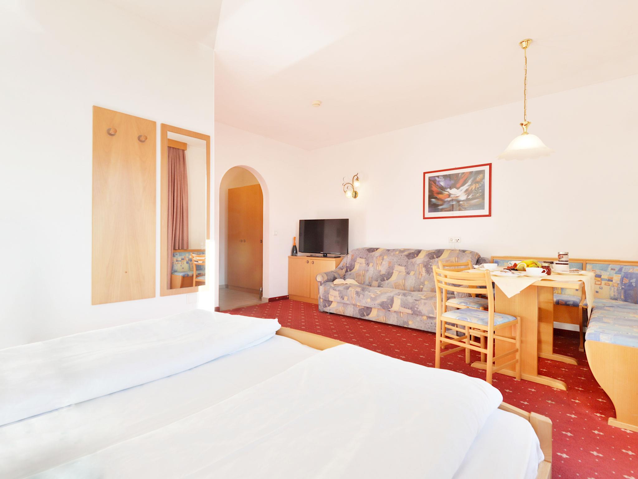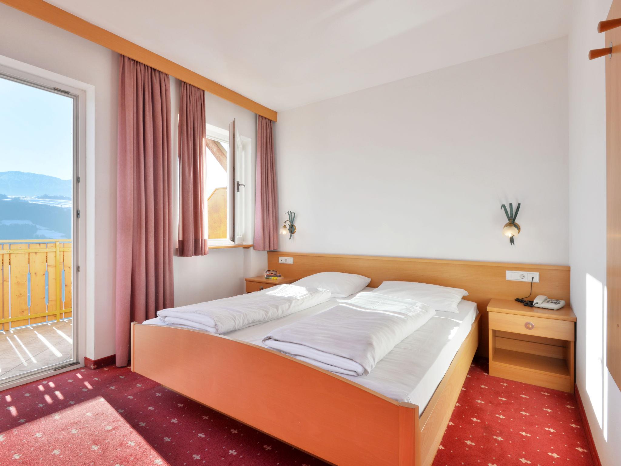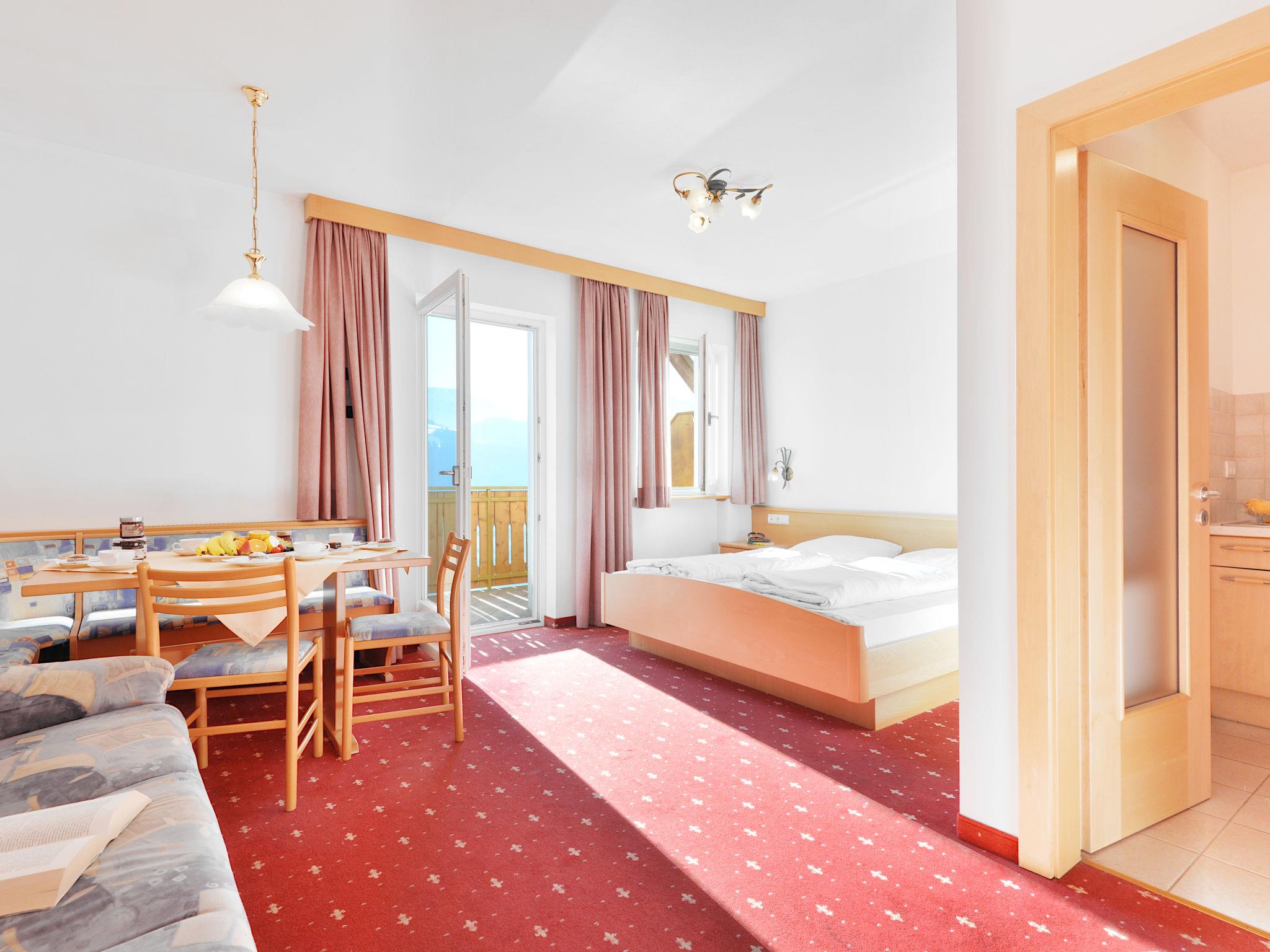 "Classic 303", 1-room apartment 32 m2 on 2nd floor. Bright, practical and cosy furnishings: living/sleeping room with 1 double bed, dining nook and satellite TV. Exit to the balcony. Small kitchen (dishwasher, 4 ceramic glass hob hotplates, toaster, kettle, microwave, electric coffee machine). Shower/WC. Heating. Carpet. Balcony. Balcony furniture. Marvellous panoramic view of the mountains and the valley. Facilities: safe, children's high chair, baby cot (extra). Internet (WiFi, free). Please note: non-smokers only. Maximum 1 pet/ dog allowed. No mandatory extra charges to be paid on-site except for local tax. Bedlinen, towels, final cleaning and all energy costs are included. IT021114B4YTADM49K