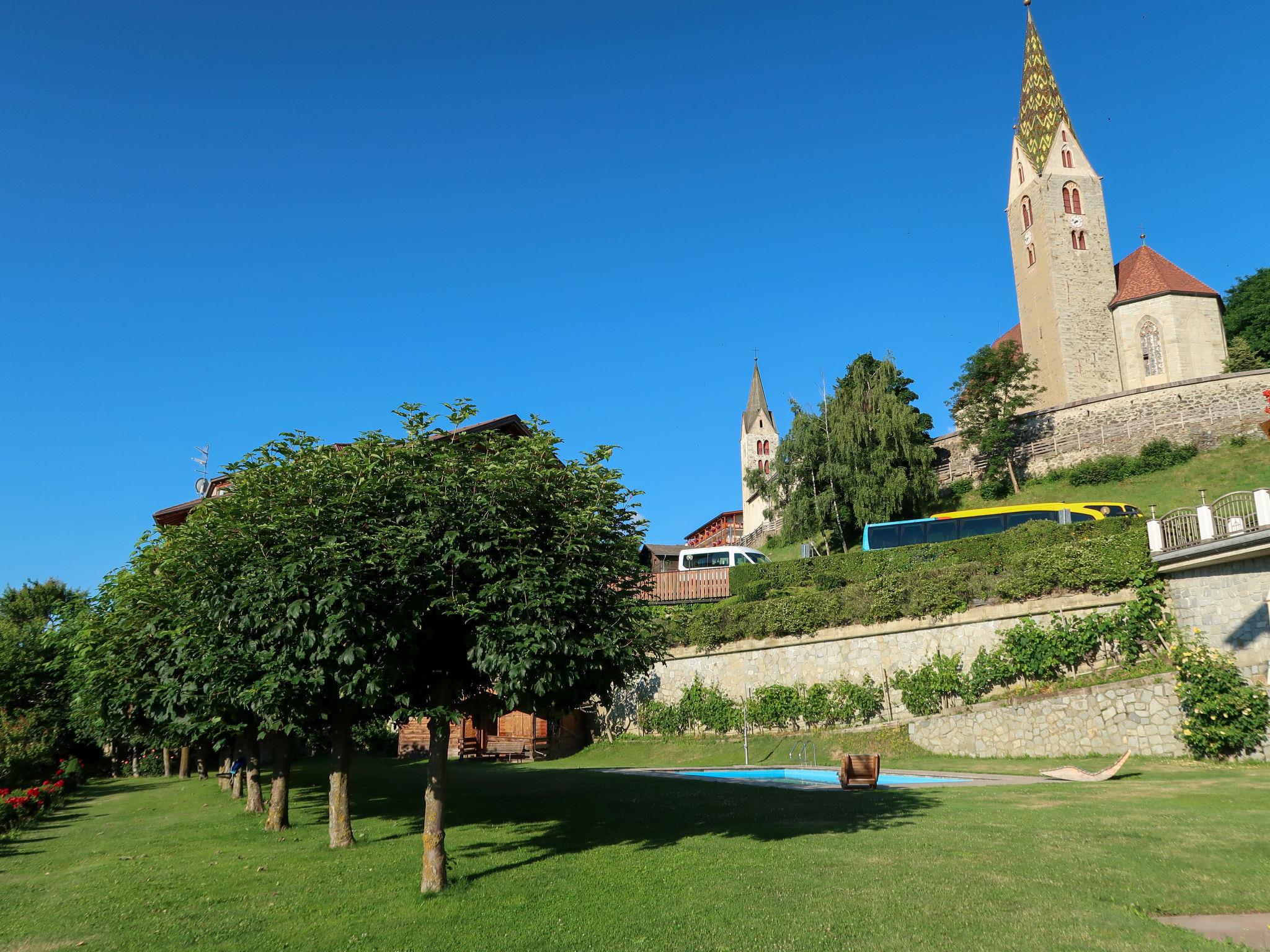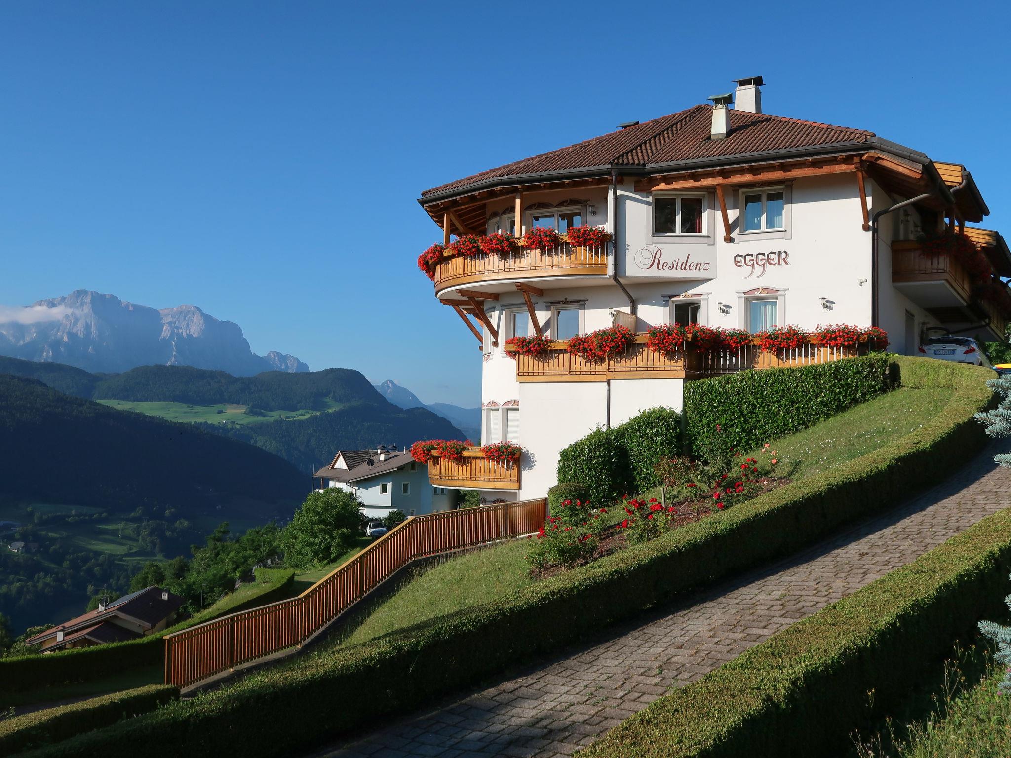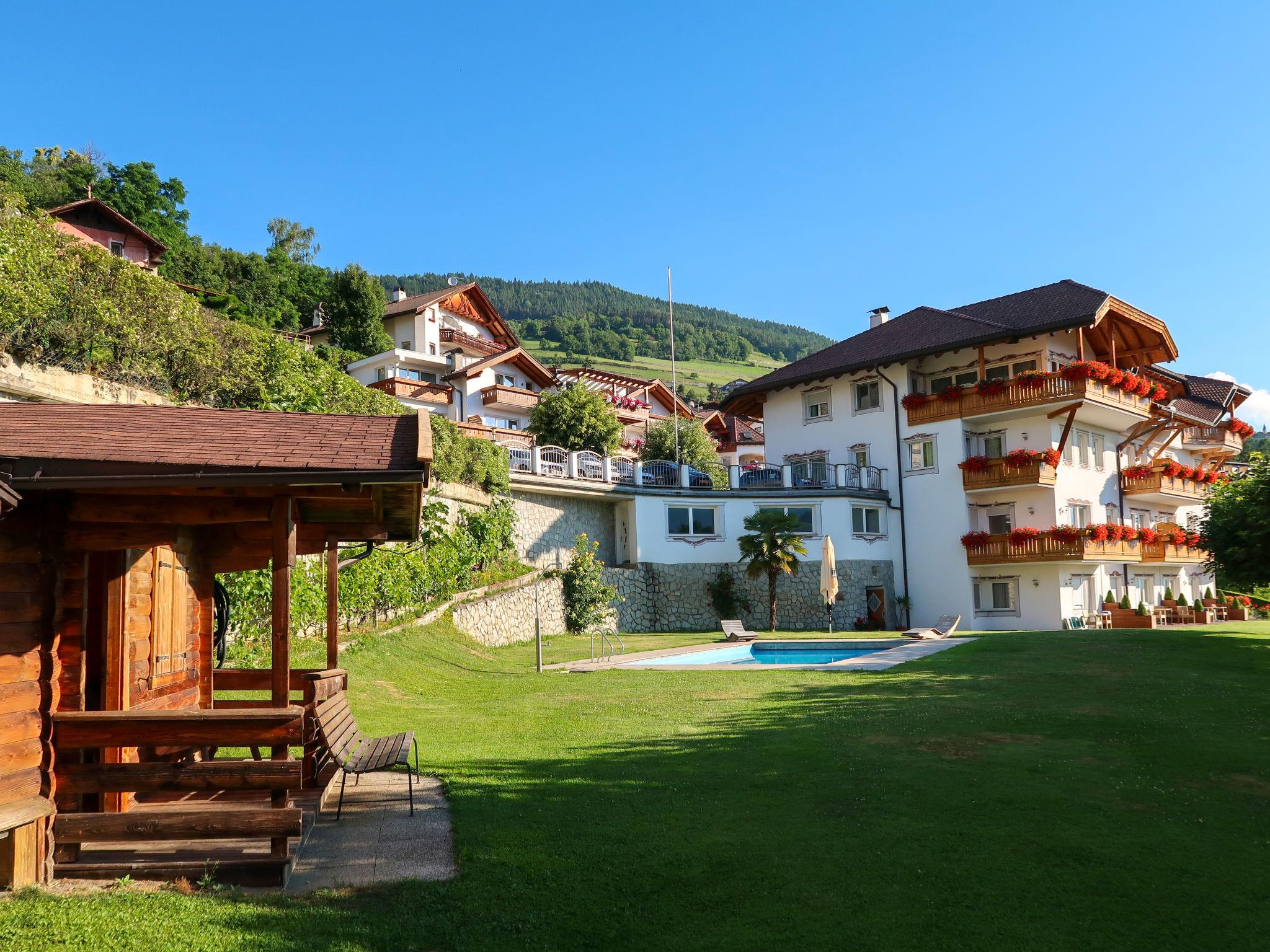 Aparthotel "Dependance Egger Apartments&Suites", 880 m a.s.l., 4 storeys. 13 apartments in the residence. 100 m from the centre of Villanders/Villandro, 6 km from the centre of Klausen/Chiusa, 30 km from the centre of Bozen/Bolzano, on a slope. For shared use: property, beautiful, well-kept terraced garden (fenced) with lawn and trees, lawn for sunbathing, swimming pool (10 x 5 m, seasonal availability: 15.May. - 30.Sep.). Table tennis. In the complex: reception, bar, breakfast room, sauna (extra). Lift. Parking at the house on the premises, communal covered parking (extra). Supermarket 100 m, restaurant 500 m, bakery 100 m, bus stop "345 Klausen-Villanders-Vill.Alm" 50 m, railway station "Klausen/Chiusa" 8 km. Walking paths from the house 10 m, cycle lane 6 km. Nearby attractions: Brixen/Bressanone 17 km, Sterzing/Vipiteno 47 km, Ritten/Renòn 22 km, Lengmoos/Longomoso (earth pyramids) 17 km, Mountain-Biking 10 m. Well-known ski regions can easily be reached: St.Ulrich/Ortisei (Gröden/Val Gardena) 21 km, Seis/Siusi (Seiser Alm/Alpe di Siusi) 17 km, Plose 25 km. Hiking paths: Villanders/Villandro 10 m, Lajen/Laion (Grödner Tal/Val Gardena) 17 km, Seis/Siusi (Schlern/Sciliar) 17 km.