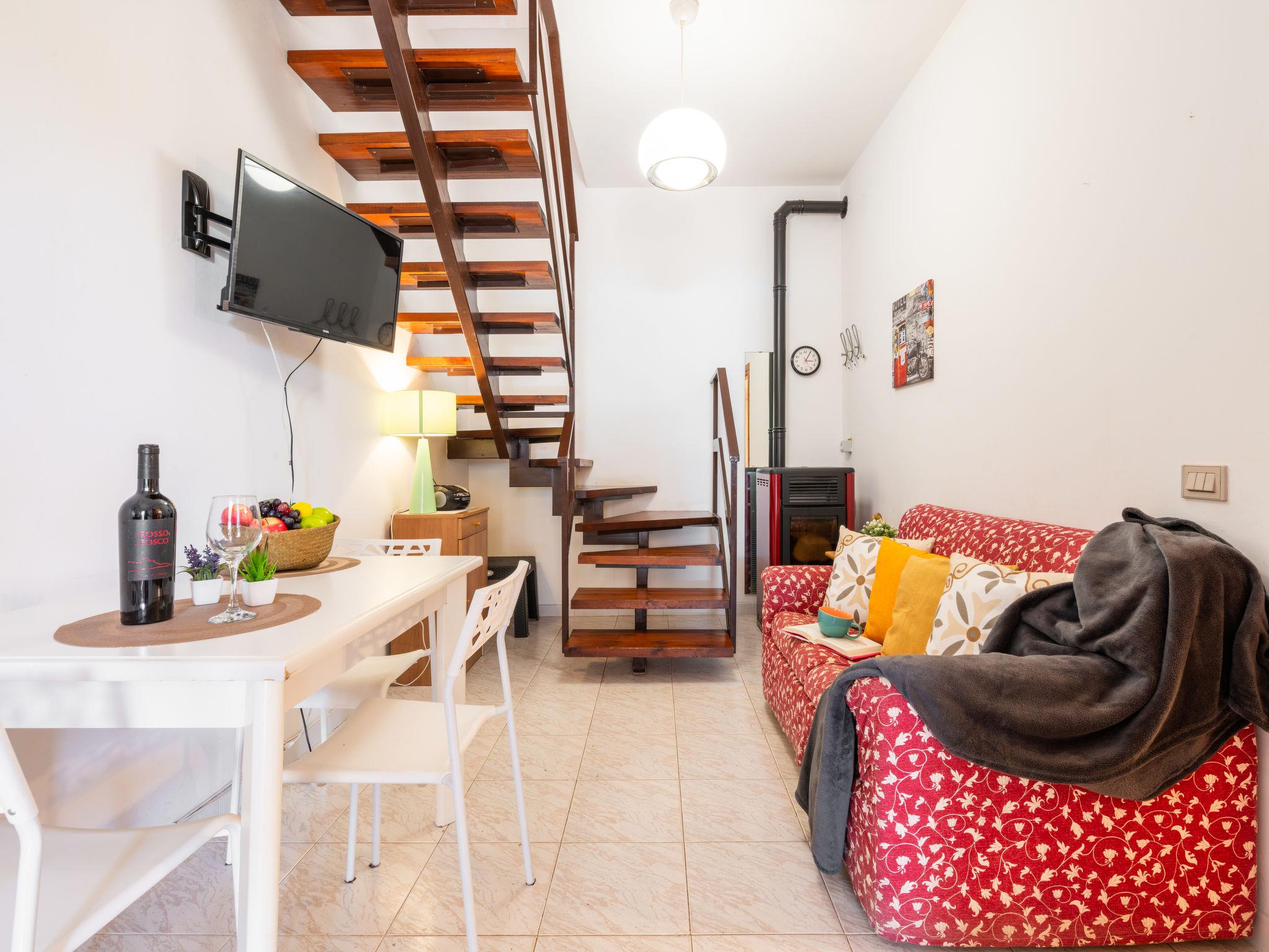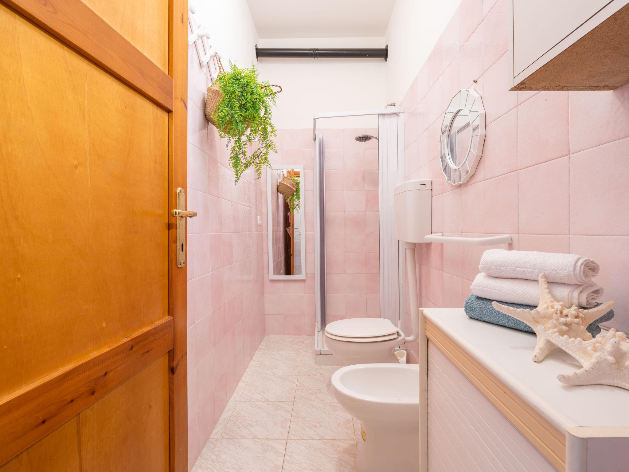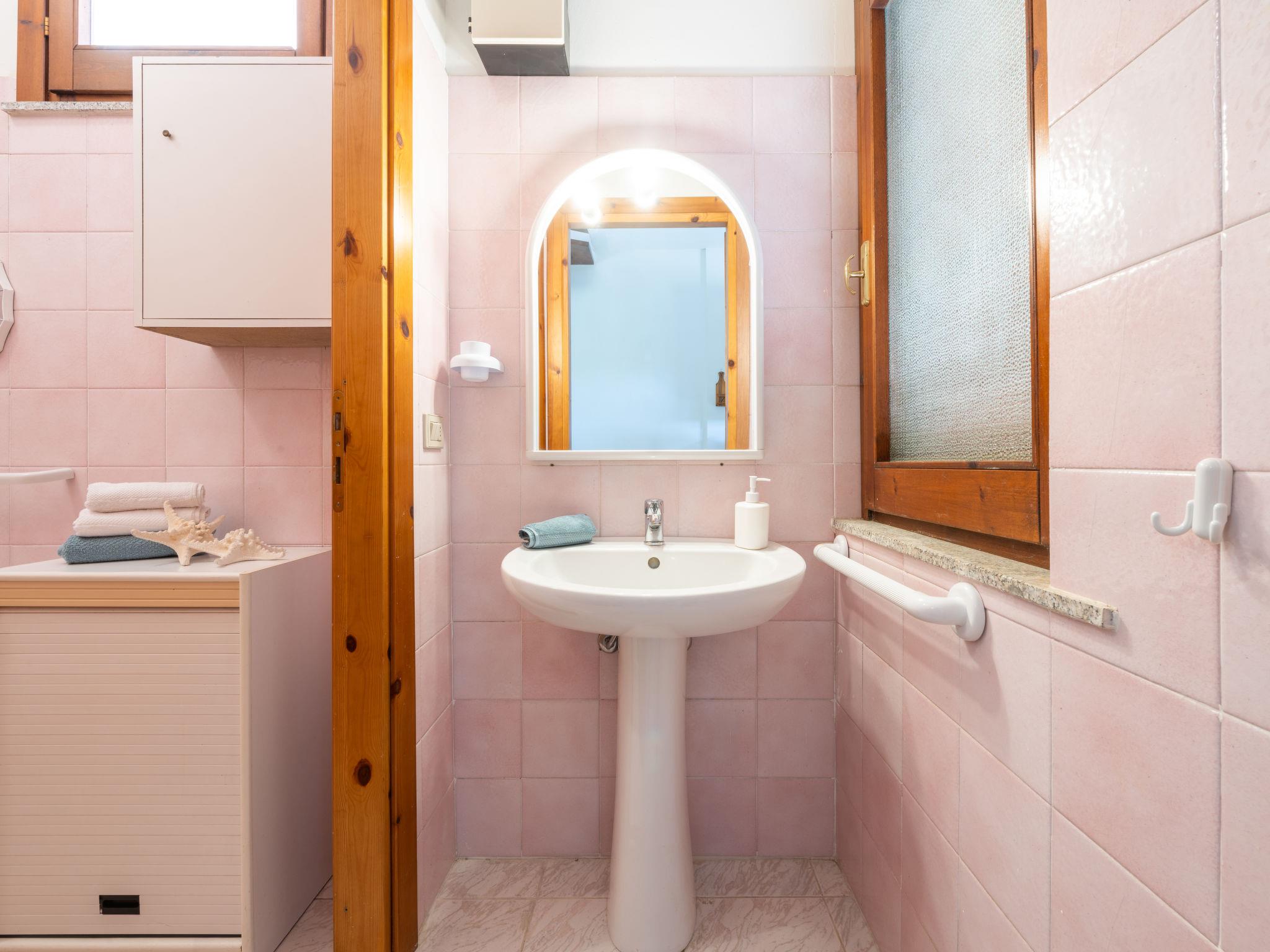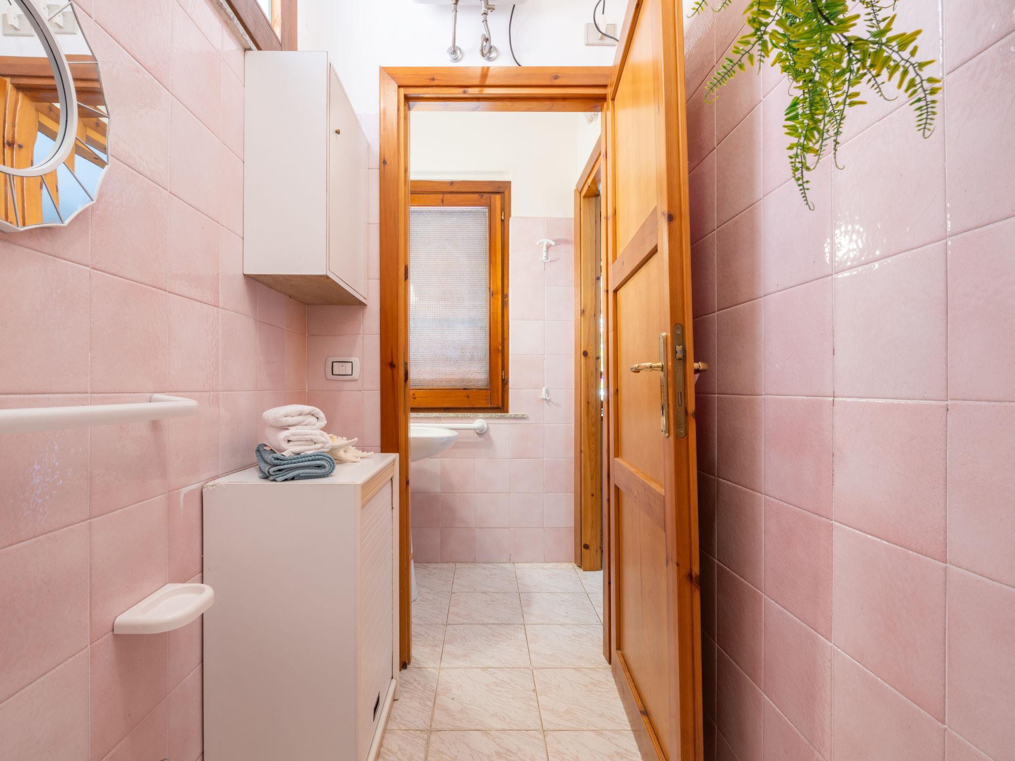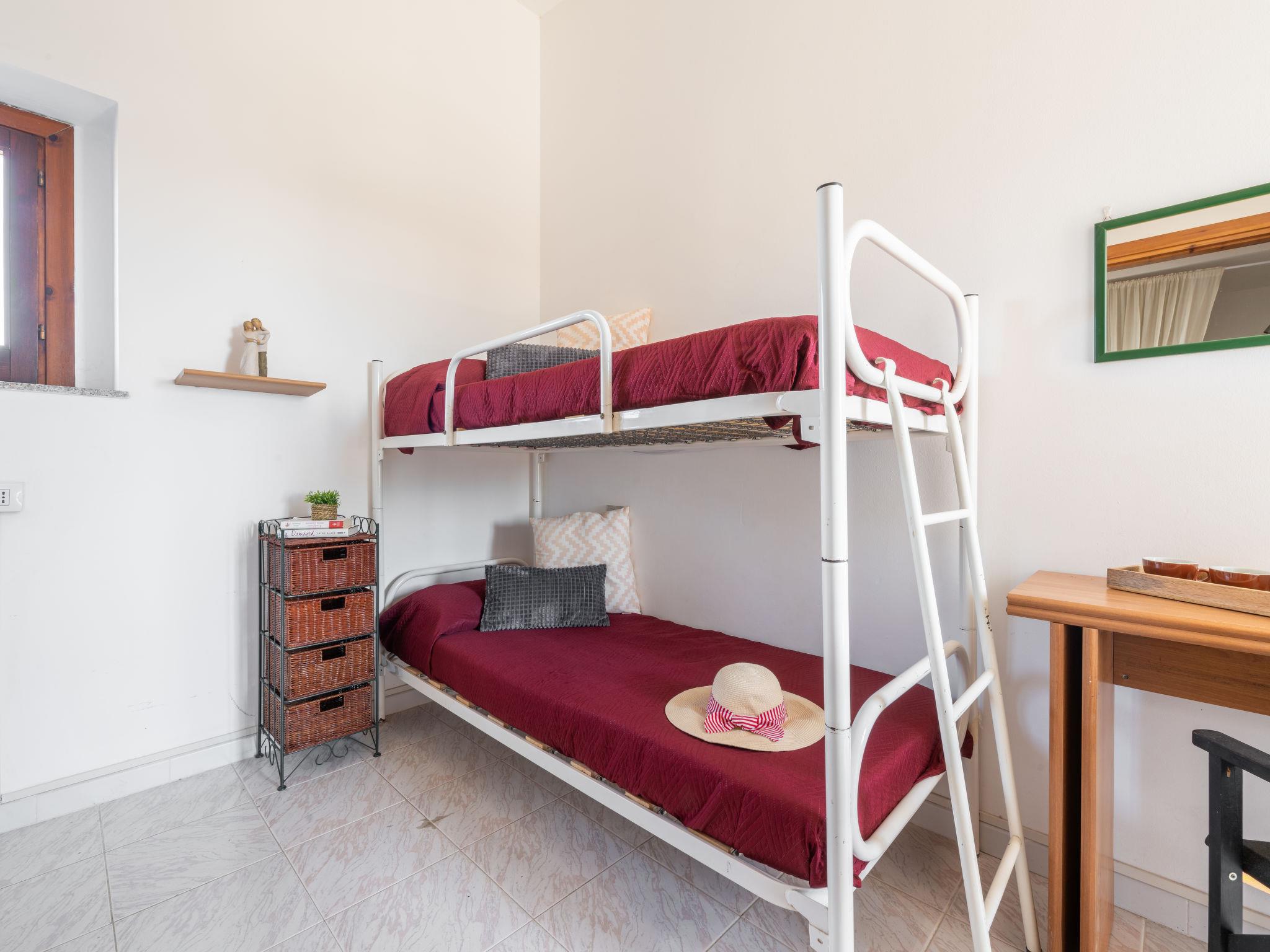 3-room terraced house 50 m2 on 2 levels. Simple and practical furnishings: small living/dining room with 1 sofabed (140 cm, length 190 cm), dining table and TV (flat screen). Exit to the veranda. Kitchenette (4 hot plates, oven, microwave, freezer, electric coffee machine). Shower/bidet/WC. Upper floor: (steep stair), 1 room with 1 double bed. Exit to the balcony. 1 room with 1 x 2 bunk beds. Exit to the balcony. Air-conditioning (extra). Terrace roofed, garden 30 m2. Terrace furniture, barbecue. View of the resort. Facilities: washing machine, iron, hair dryer. Garage (1 car). IT111105C2000T1664