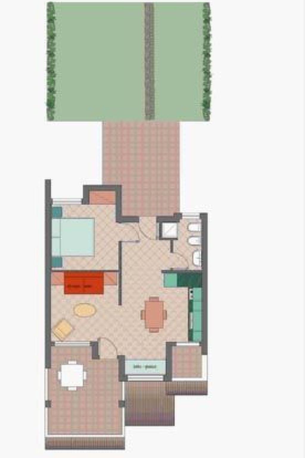 The residence is constituted by 14 apartments, recently built and accurately furnished, with a wide surrounding green area, and an ample parking. This apartment has a private garden; a porch and a terrace with view ofthe sea, with possibility of dining outdoor; a double room; a living-room with a sofa–double bed and another sofa-single bed, an open kitchen with fridge, freezer, stove and a complete endowment (included cooking pots, frying pans, cutlery, iron, hair-dryer, satellite television); bathroom with shower.