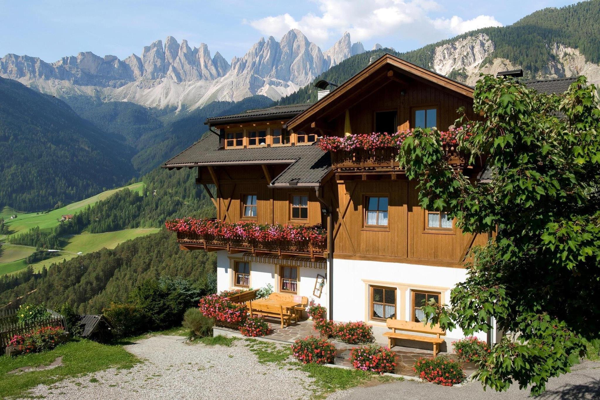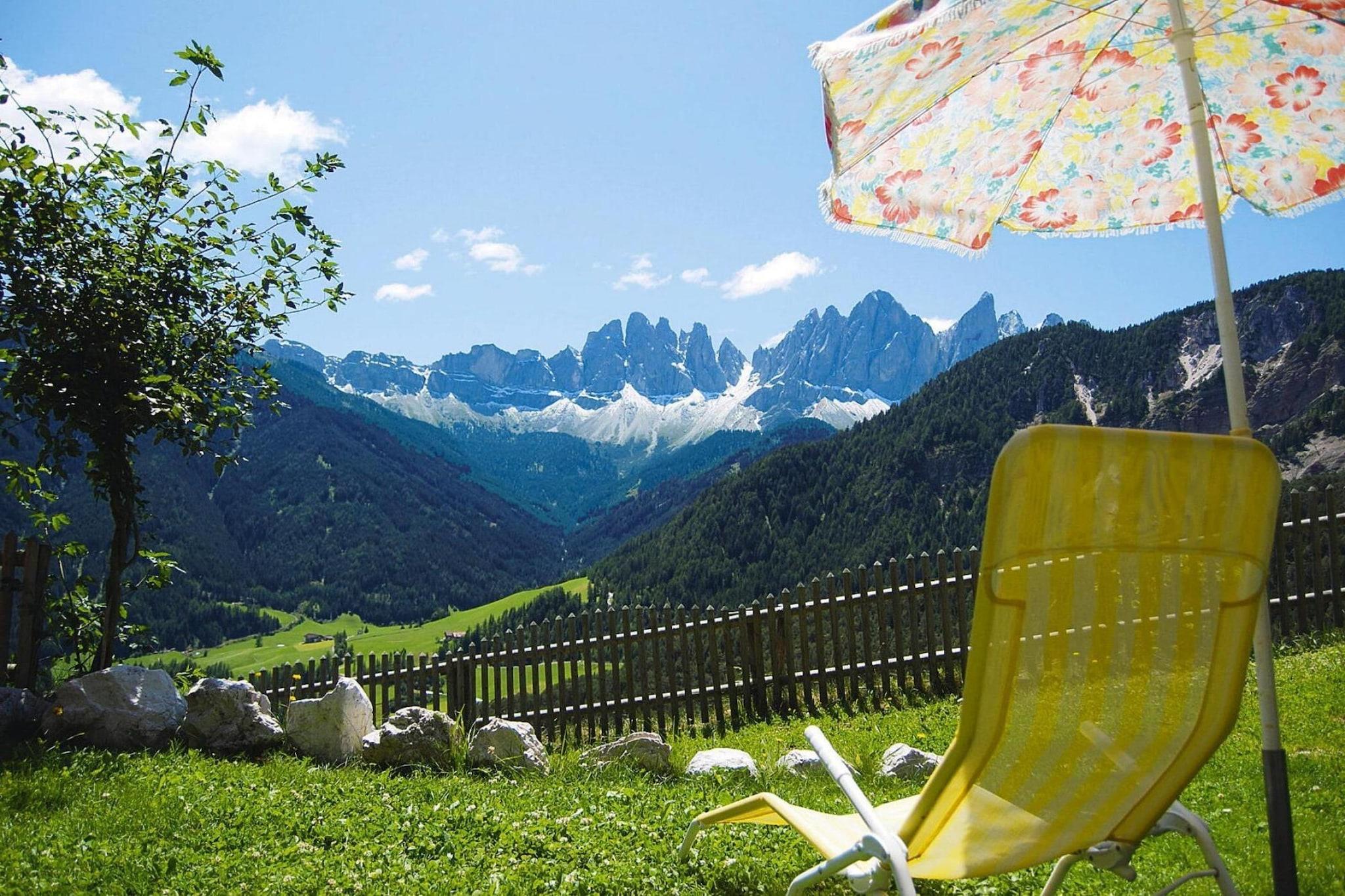 Bjerggård 1.500 meter over havets overflade mellem enge og skove på den solrige skråning af den smukke Villnöß-dal. En sand oase af ro midt i Dolomitterne, med en betagende udsigt over de mægtige Geisler-toppe. Fordyb dig i bjergene, nyd bjerggårdens idyl og tag del i et ægte udsnit af det sydtyrolske liv. I dette unikke naturlandskab kan du glemme hverdagen og fuldt ud nyde din velfortjente ferie. Vandrere vil finde et rigtigt Eldorado i naturreservatet Puez Geisler. Detaljer: Forbrugsbaserede energiomkostninger, sengelinned, håndklæder, slutrengøring WiFi-gæstekort med attraktive, inkluderende tjenester Aktiviteter i nærheden: Boligen ligger i umiddelbar nærhed af vandreparadiset "Zanser Alm", med talrige vandrestier, som også egner sig godt for familier. Fra midten af juni til slutningen af oktober er der en vandrebus, der kører dig til Würzjoch og Zanseralm (gratis med Dolomiti-kortet). Der er også en klatrehave for store og små og en høj rebbane. I nabokommunen Teis er der et interessant mineralmuseum, hvorfra der om sommeren arrangeres en ugentlig guidet mineralsøgning. Et besøg i de smukke byer Klausen, Brixen eller Bozen med alle deres seværdigheder er også en god mulighed. I nærheden af Niedermunthof er der en rideskole, hvor rideundervisning og guidede ture tilbydes kvalitet inden for turisme. Alle Alpernes 27 perler står tilsammen for blid, mobil rejse og opfylder høje kvalitetskriterier for en ubekymret, stressfri ferie med klimabeskyttelse og bæredygtighed. Fokus er på blød mobilitet: eventyrlige, miljøvenlige fritidsaktiviteter, trafik