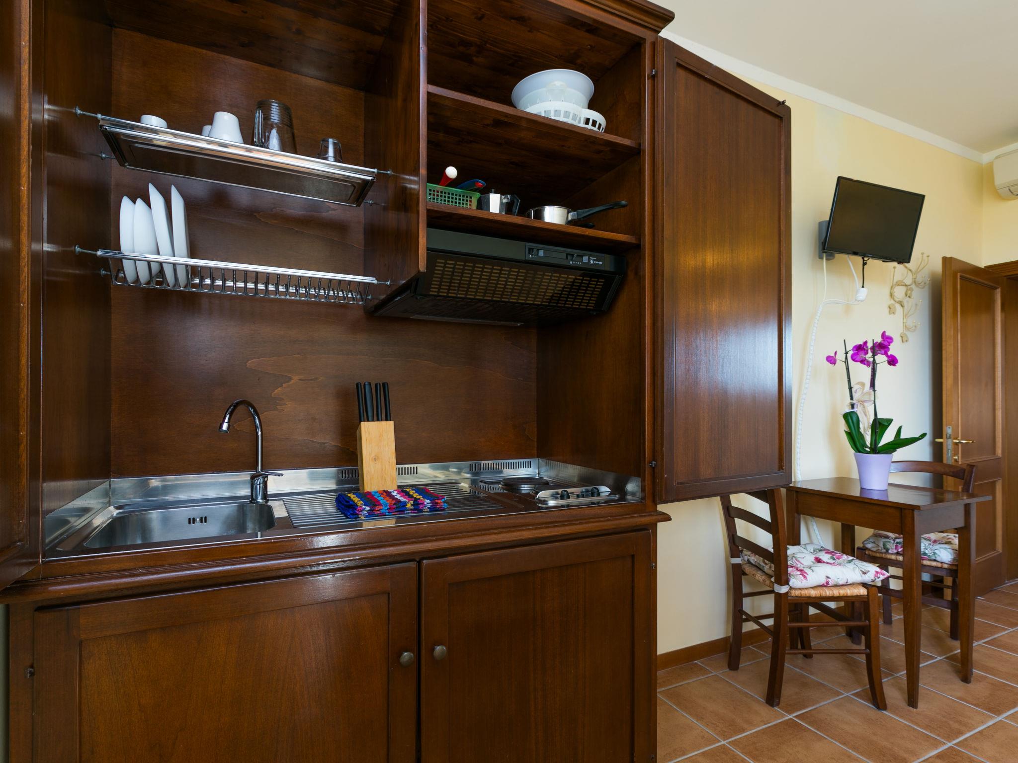 "Tipologia Mono", 1-room apartment 25 m2 on 1st floor. Practical and rustic furnishings: living/sleeping room with 1 double bed, satellite TV and air conditioning. Kitchenette (2 hot plates, kettle, freezer). Shower/bidet/WC. Facilities: children's high chair, baby cot for up to 2 year olds. Internet (WiFi, free). Please note: fridge without freezer. Maximum 1 pet/ dog allowed. The kitchenette is retractable (two plates, mini fridge, electric kettle). IT048011B5F4V5HA7K