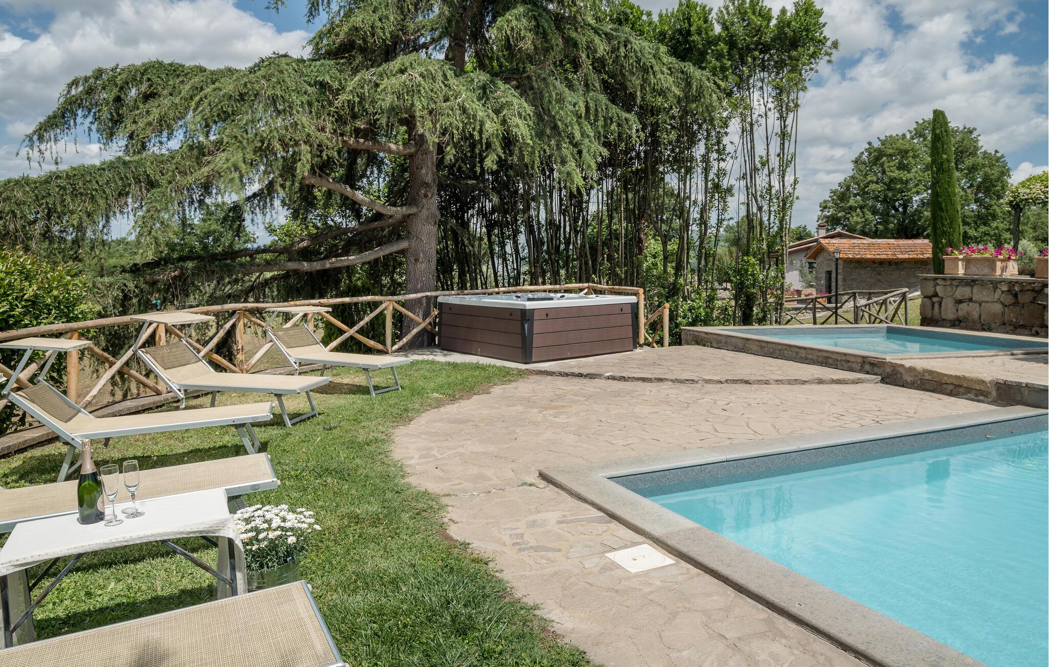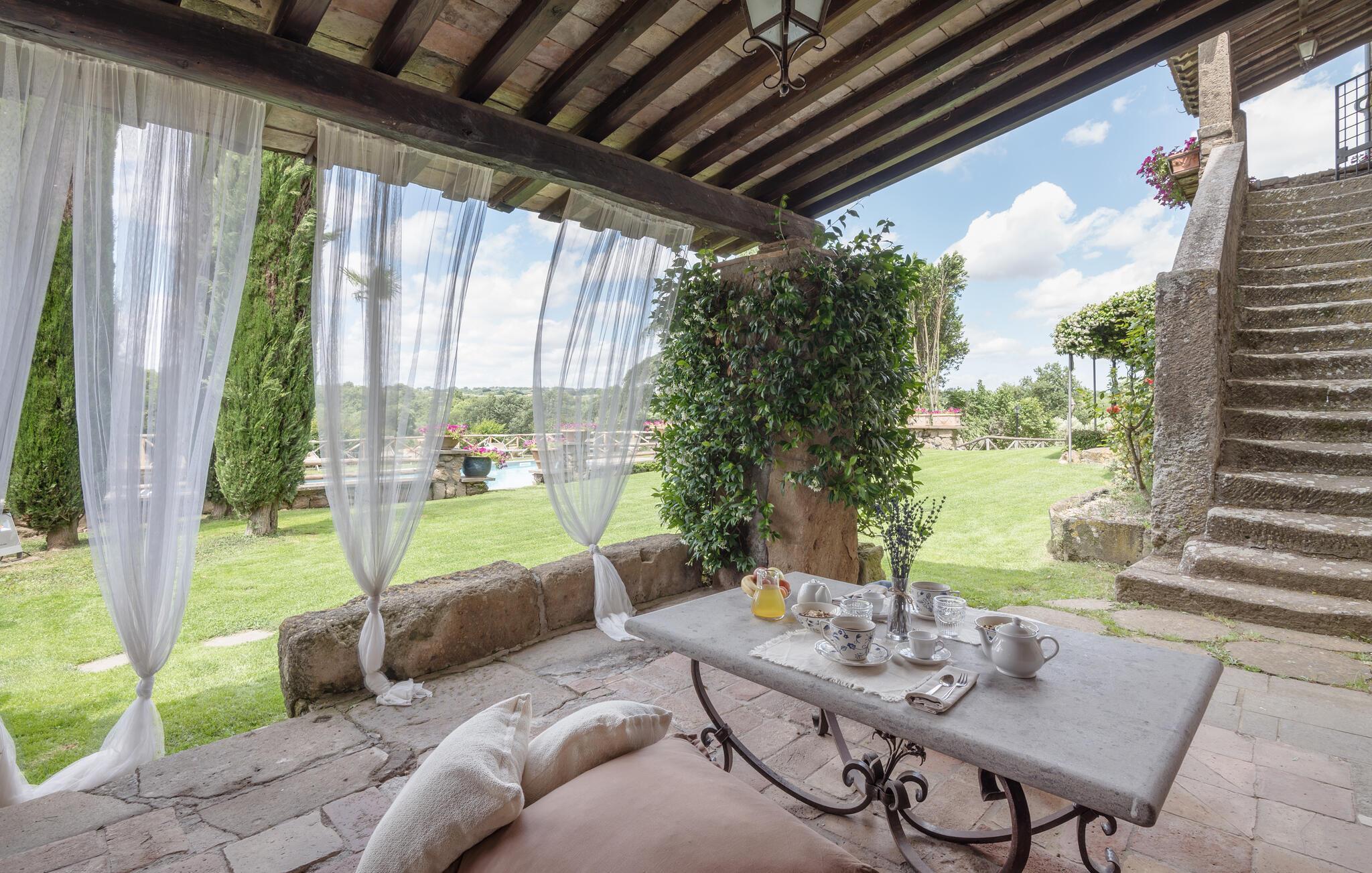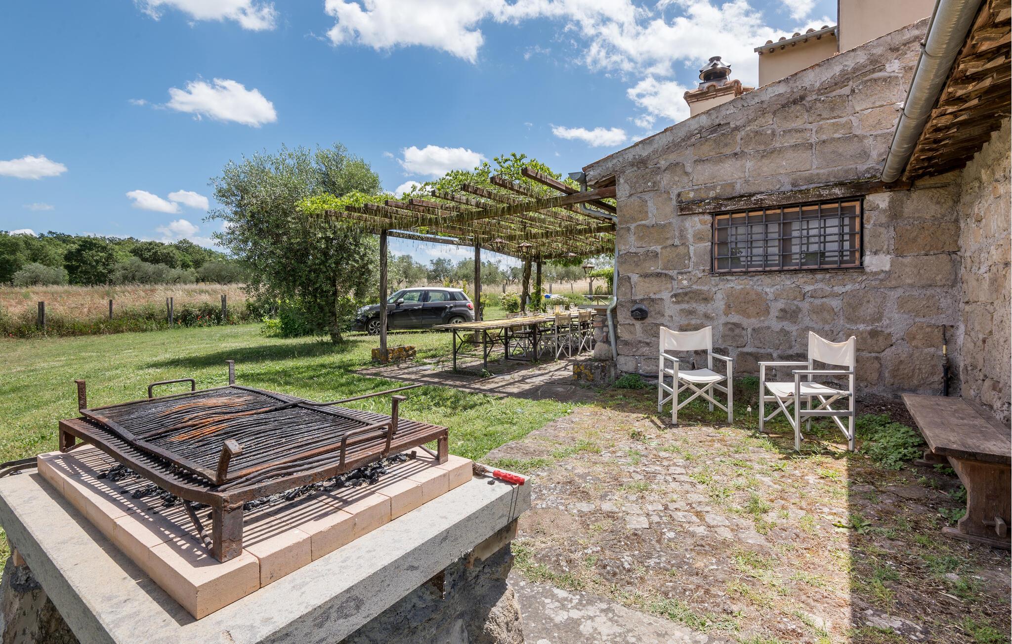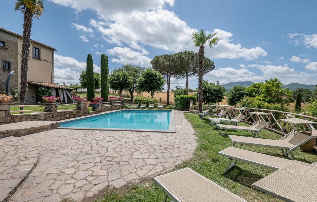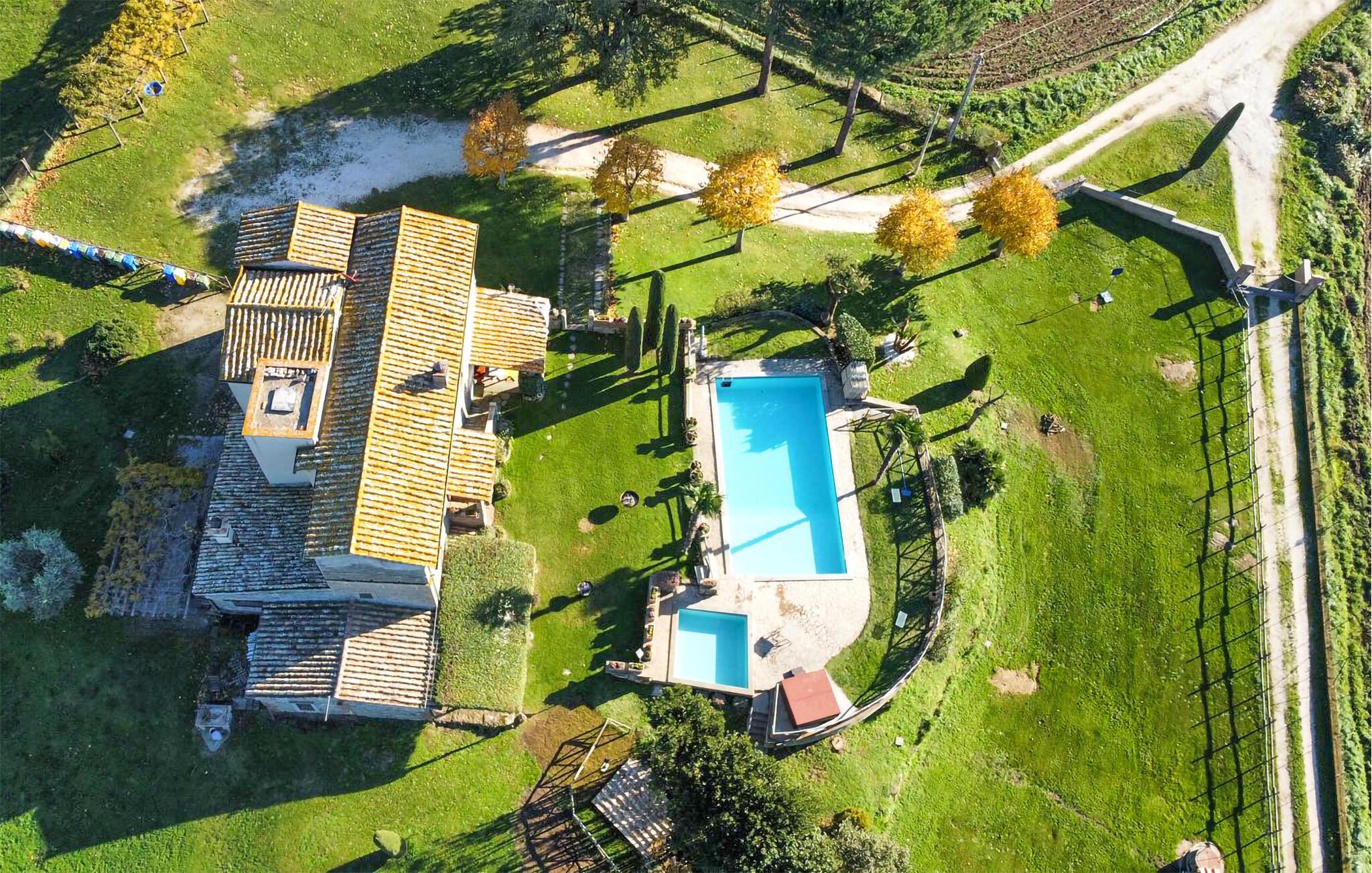 Huset ligger på en høj og er omgivet af en græsplæne, en frugtplantage og en olivenlund. Grunden er indhegnet. Der er swimmingpool og et børnebassin (4 x 4 m, maks. dybde 1.20 m). Hvis I har lyst, kan I besøge en etruskisk gravplads. Stue med klaver, bibliotek med adgang til haven, spisestue med adgang til haven (lysthus med bord og stråtag), spisekøkken bag huset med overdækket terrasse, hvor I også kan spise. Tilkørsel gennem automatisk indkørselsport.