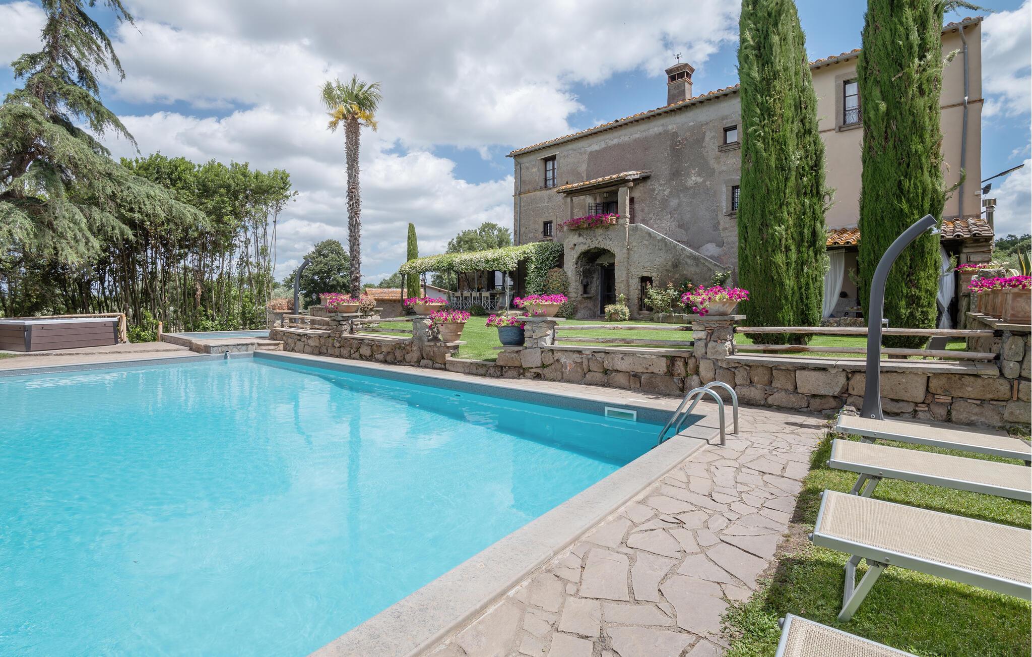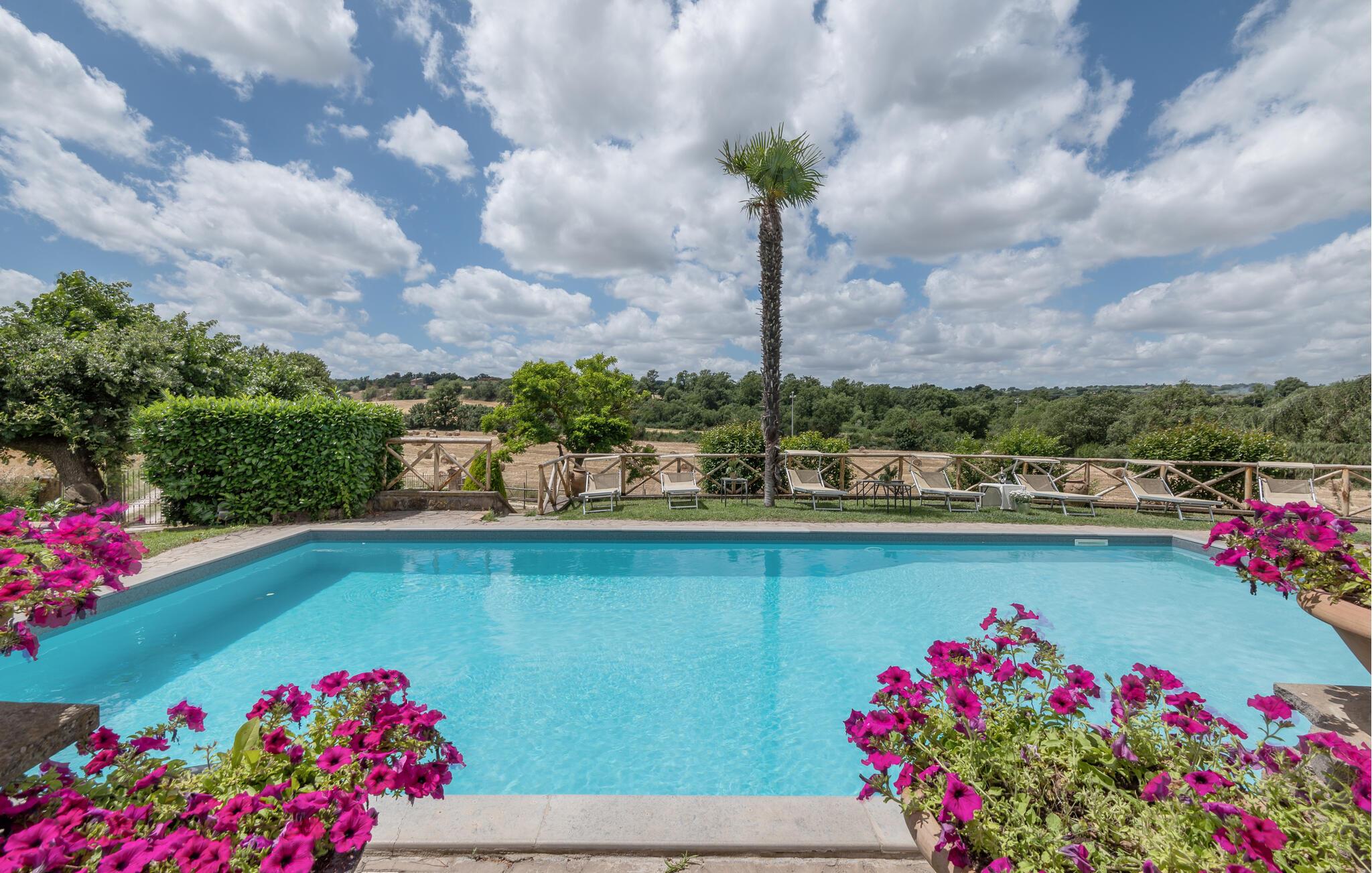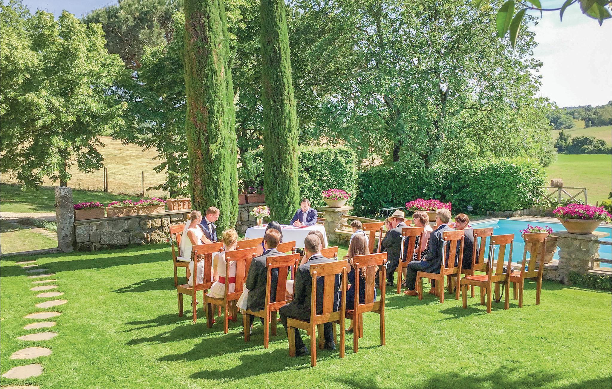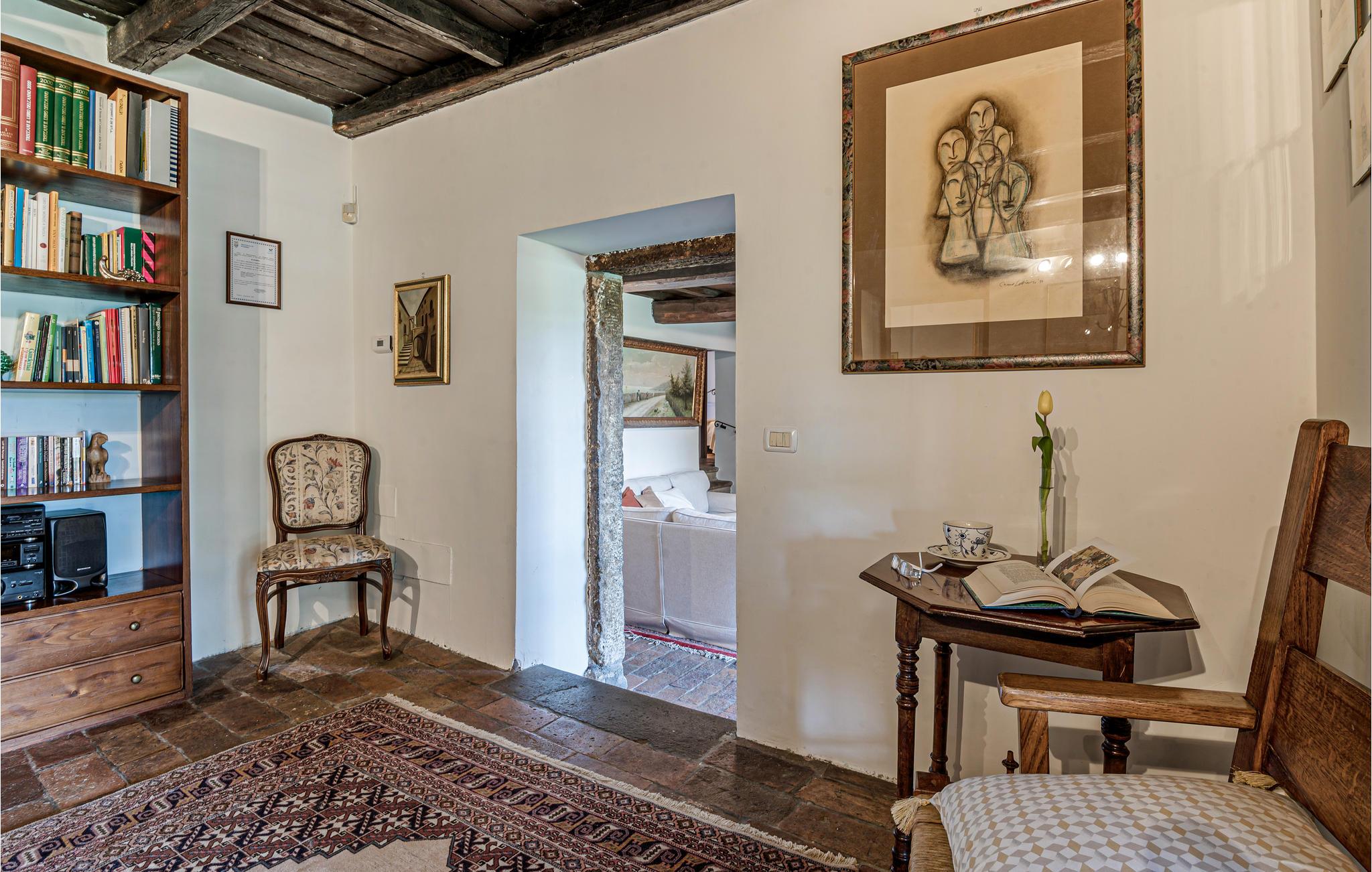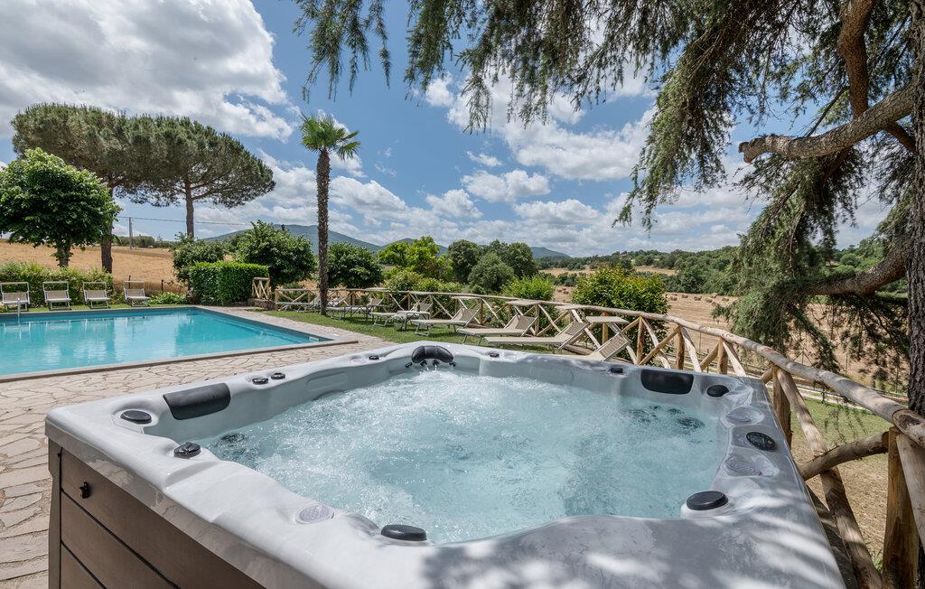 Huset ligger på en høj og er omgivet af en græsplæne, en frugtplantage og en olivenlund. Grunden er indhegnet. Der er swimmingpool og et børnebassin (4 x 4 m, maks. dybde 1.20 m). Hvis I har lyst, kan I besøge en etruskisk gravplads. Stue med klaver, bibliotek med adgang til haven, spisestue med adgang til haven (lysthus med bord og stråtag), spisekøkken bag huset med overdækket terrasse, hvor I også kan spise. Tilkørsel gennem automatisk indkørselsport.