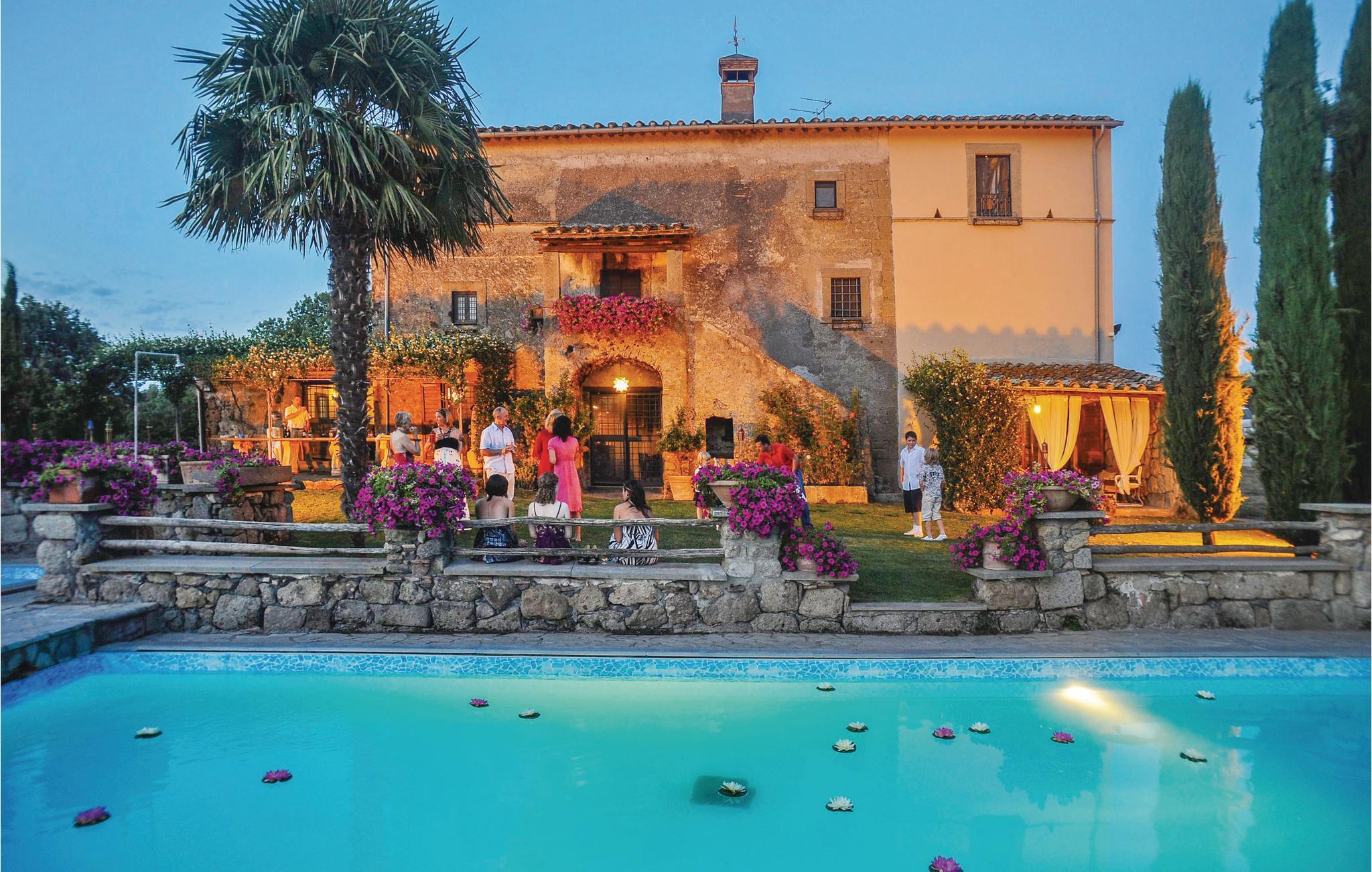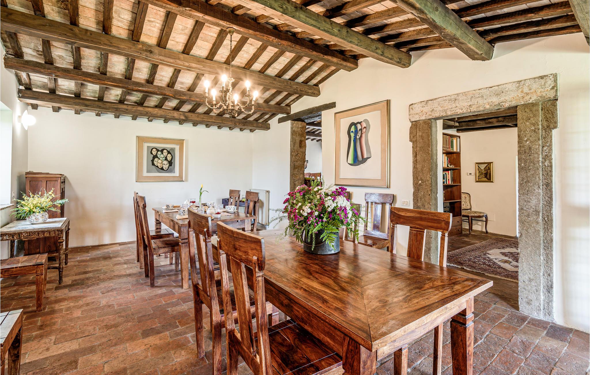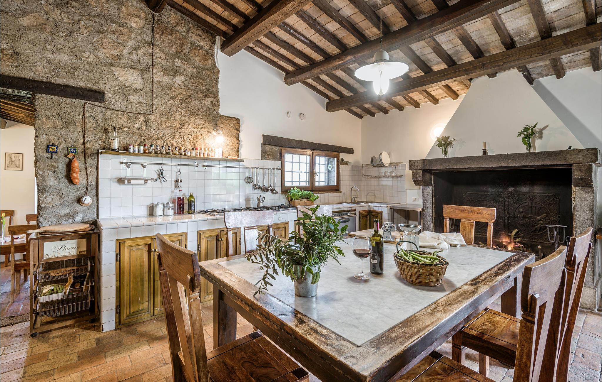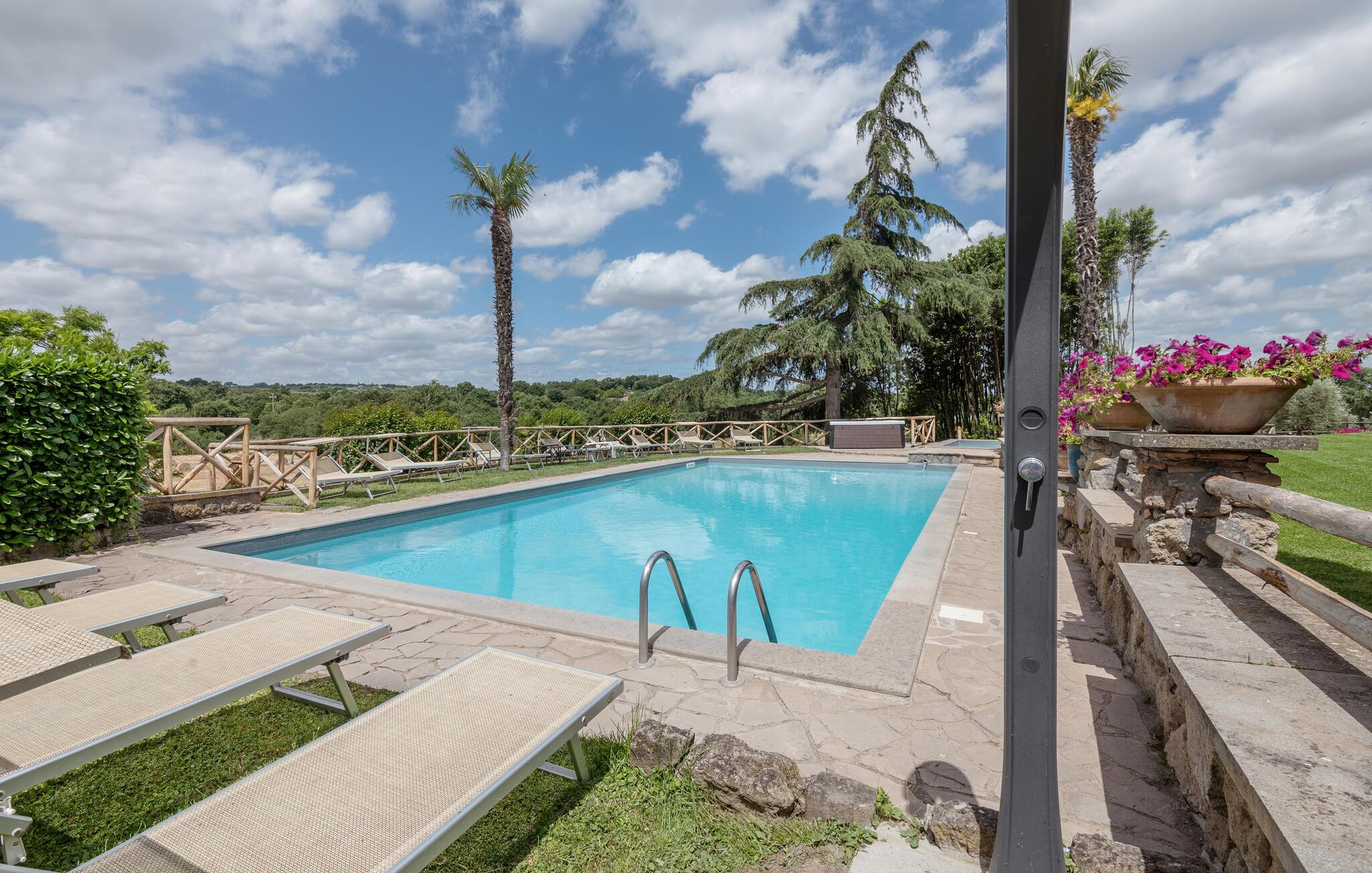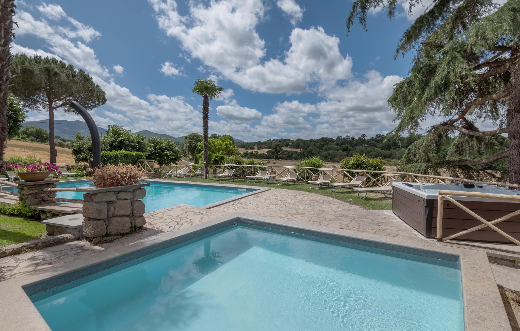 Huset ligger på en høj og er omgivet af en græsplæne, en frugtplantage og en olivenlund. Grunden er indhegnet. Der er swimmingpool og et børnebassin (4 x 4 m, maks. dybde 1.20 m). Hvis I har lyst, kan I besøge en etruskisk gravplads. Stue med klaver, bibliotek med adgang til haven, spisestue med adgang til haven (lysthus med bord og stråtag), spisekøkken bag huset med overdækket terrasse, hvor I også kan spise. Tilkørsel gennem automatisk indkørselsport.