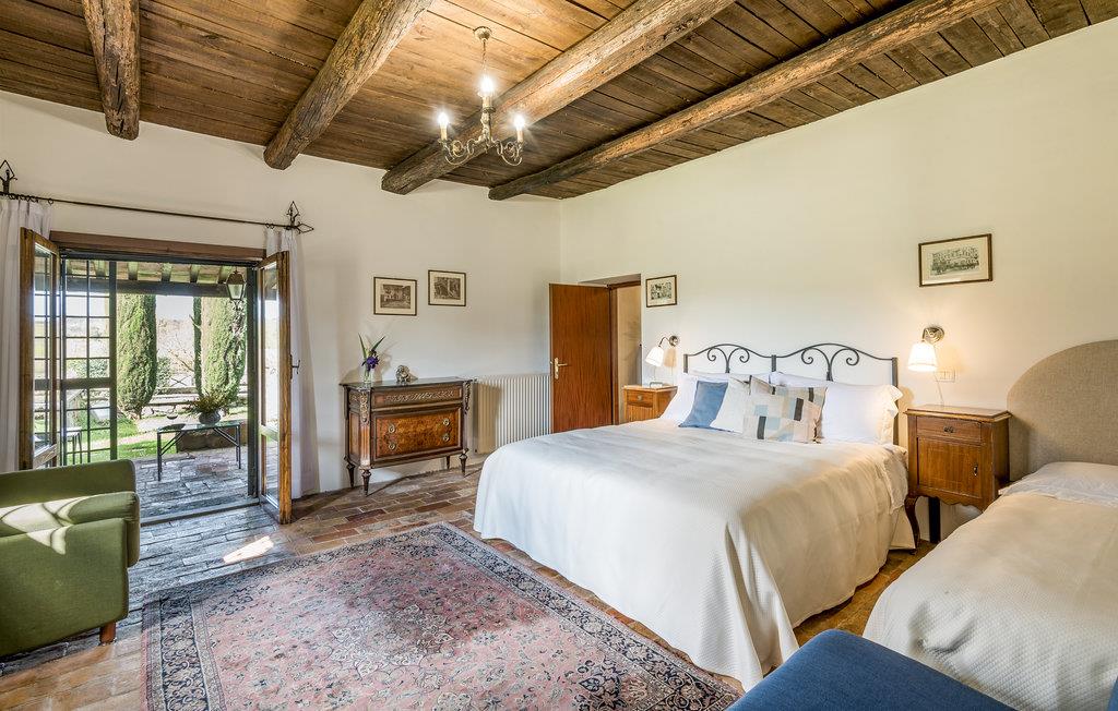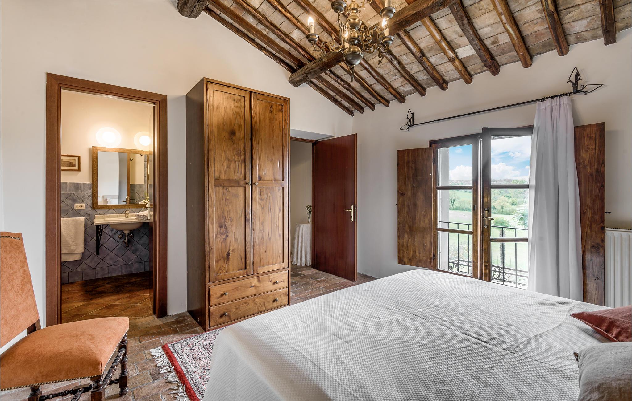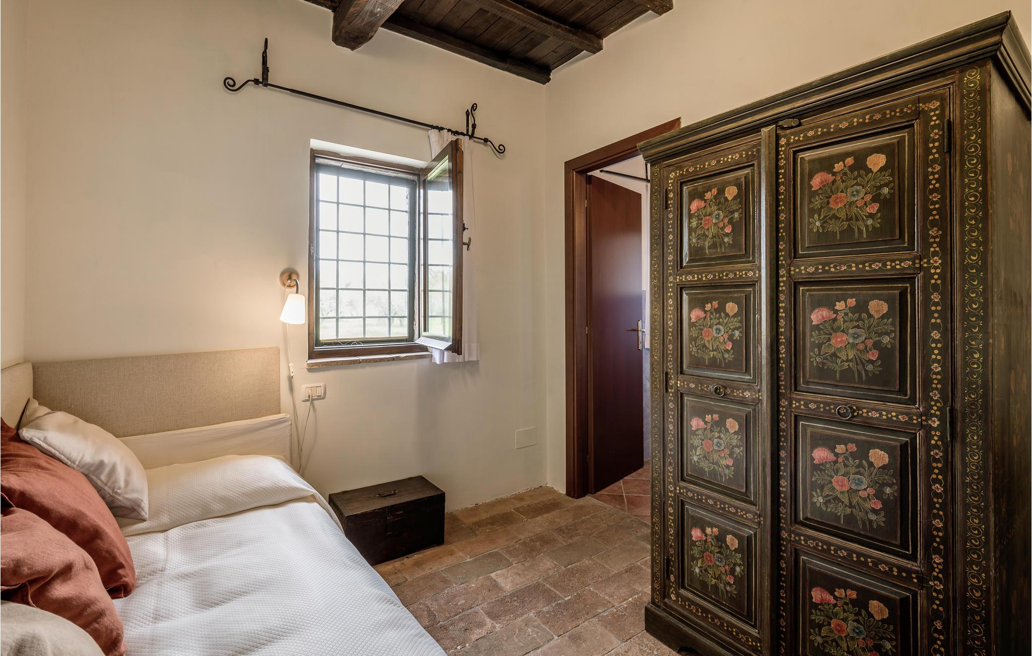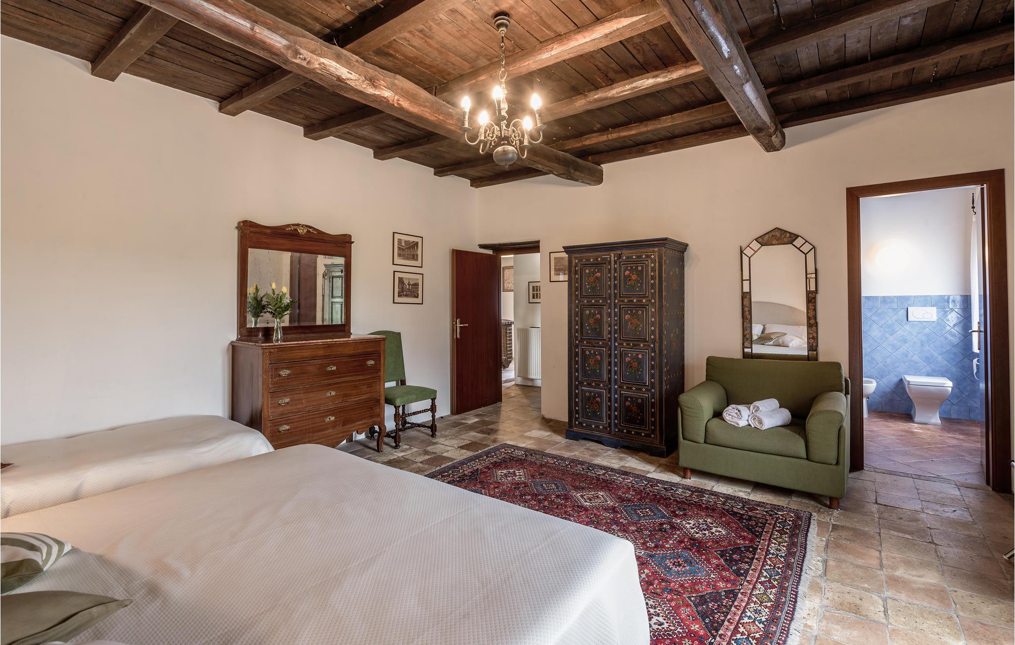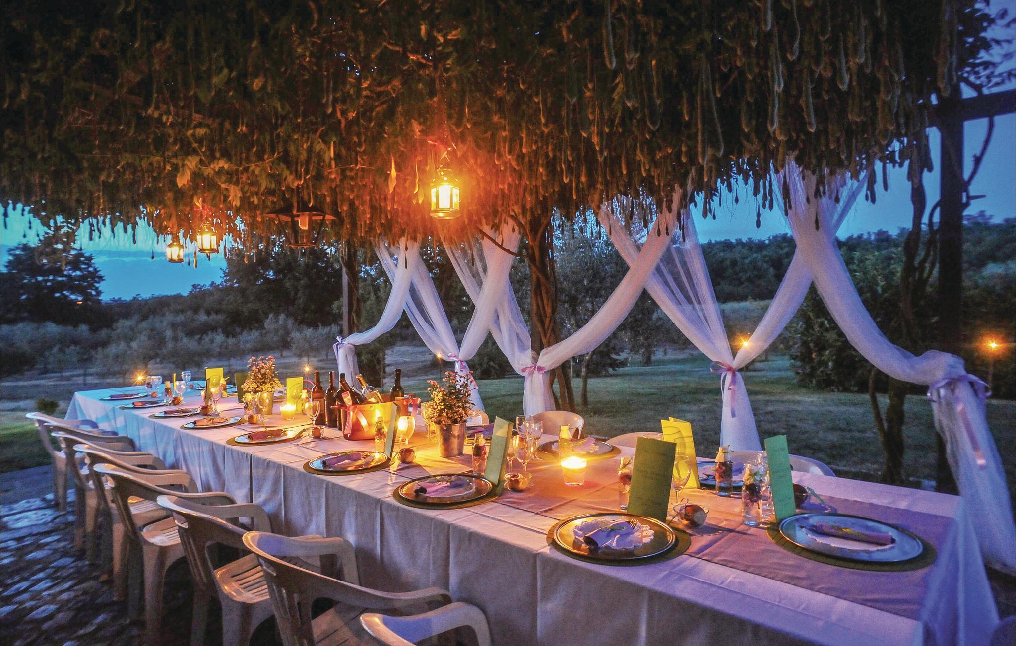 Huset ligger på en høj og er omgivet af en græsplæne, en frugtplantage og en olivenlund. Grunden er indhegnet. Der er swimmingpool og et børnebassin (4 x 4 m, maks. dybde 1.20 m). Hvis I har lyst, kan I besøge en etruskisk gravplads. Stue med klaver, bibliotek med adgang til haven, spisestue med adgang til haven (lysthus med bord og stråtag), spisekøkken bag huset med overdækket terrasse, hvor I også kan spise. Tilkørsel gennem automatisk indkørselsport.