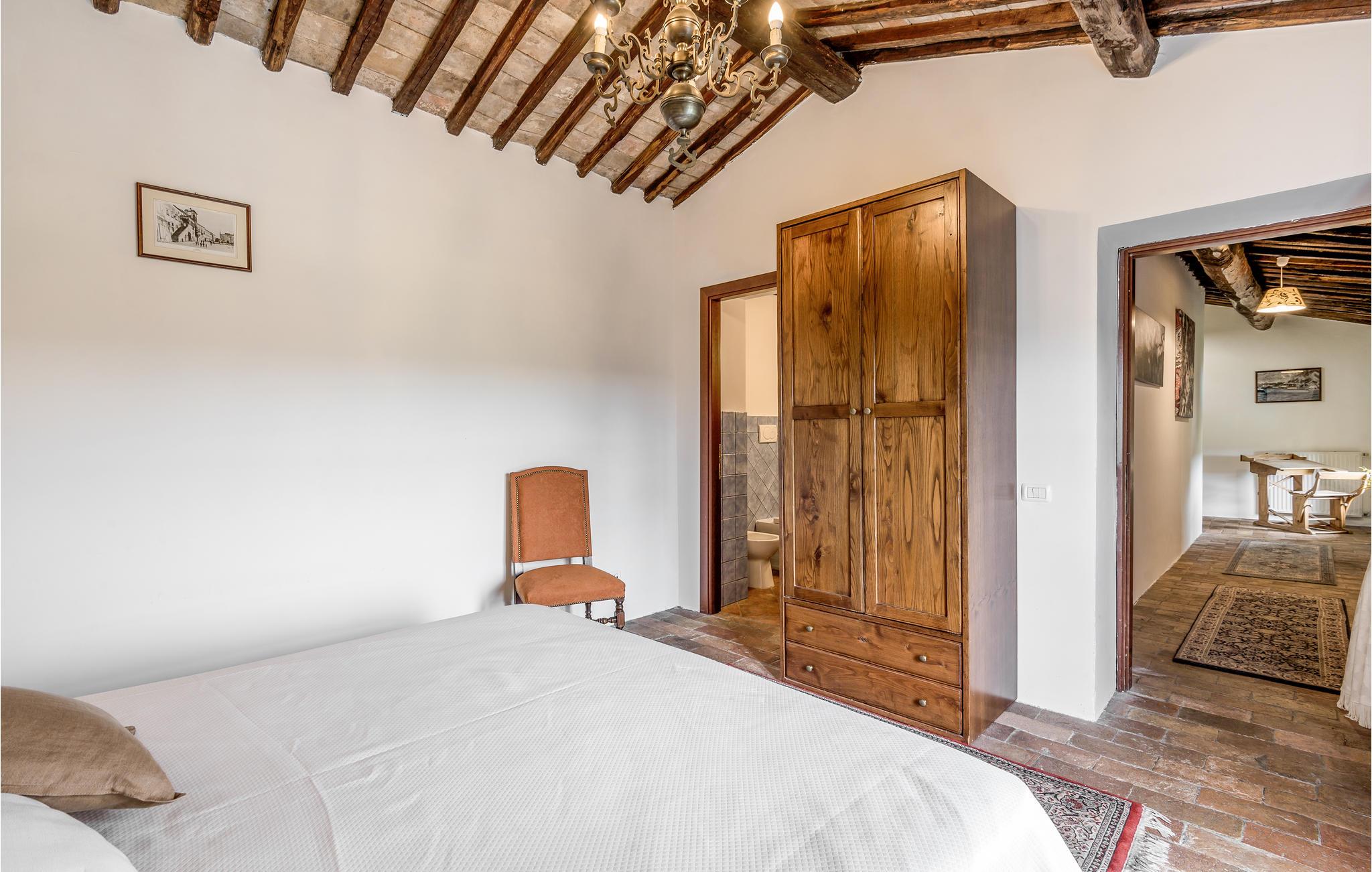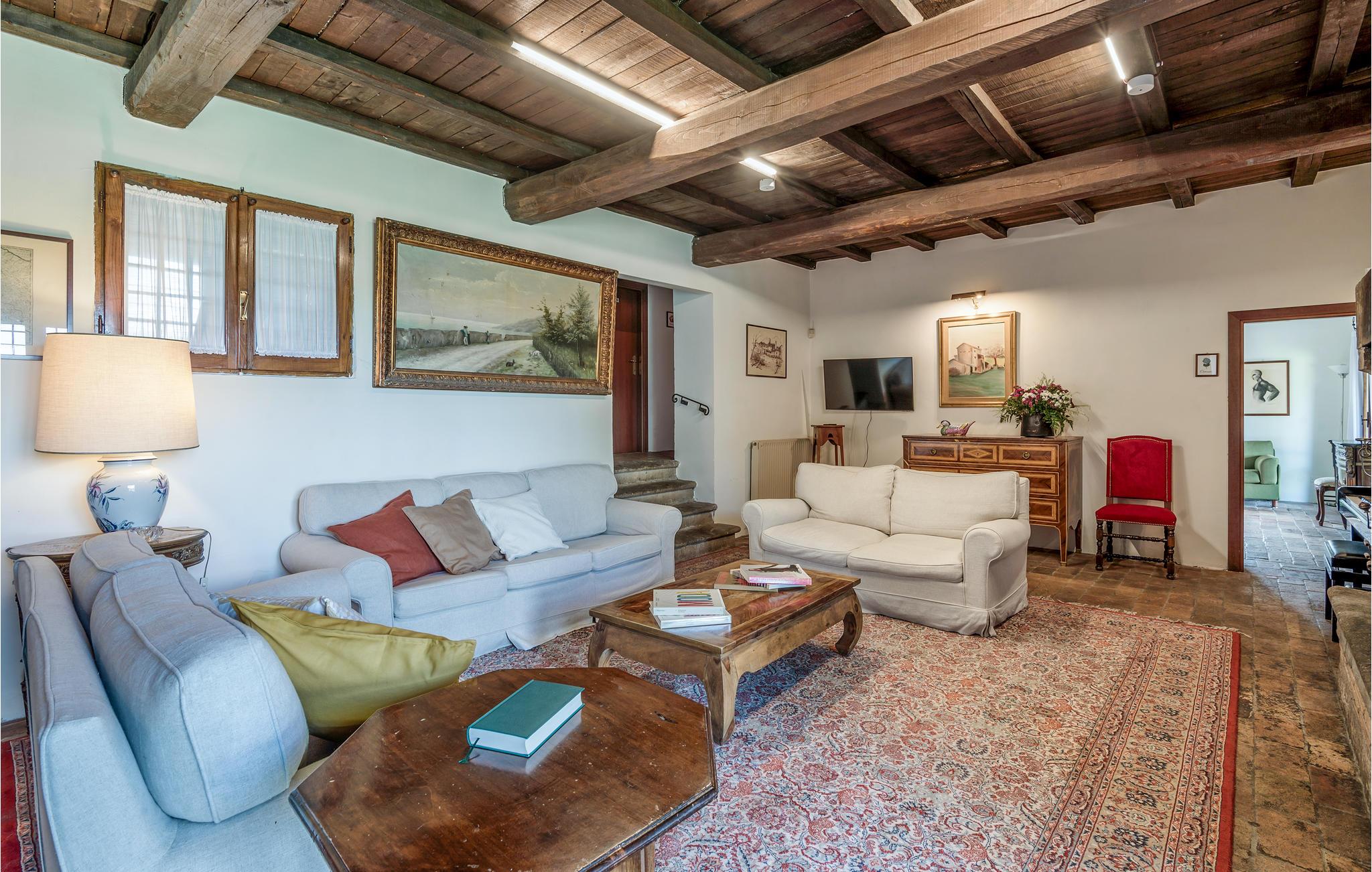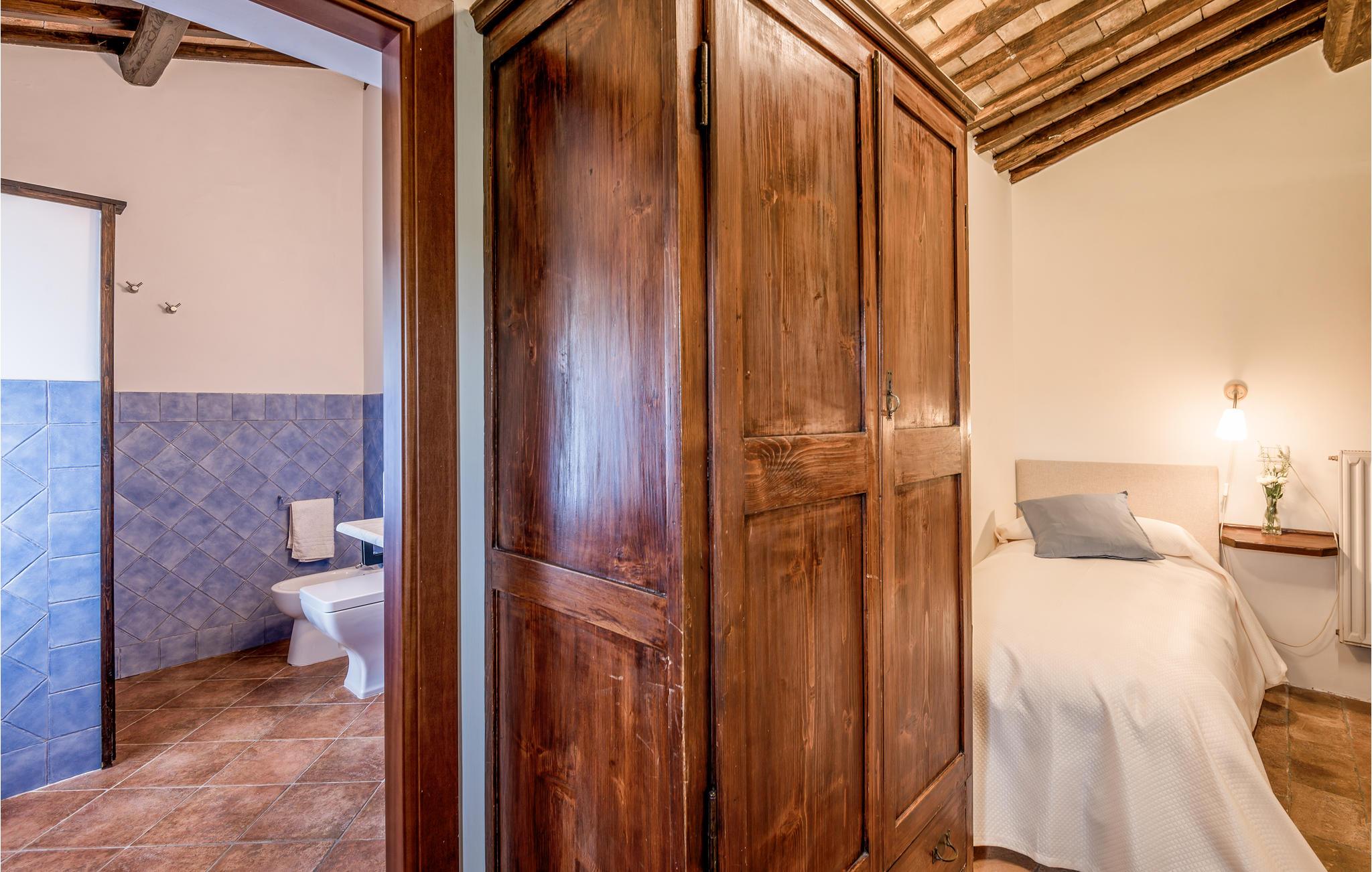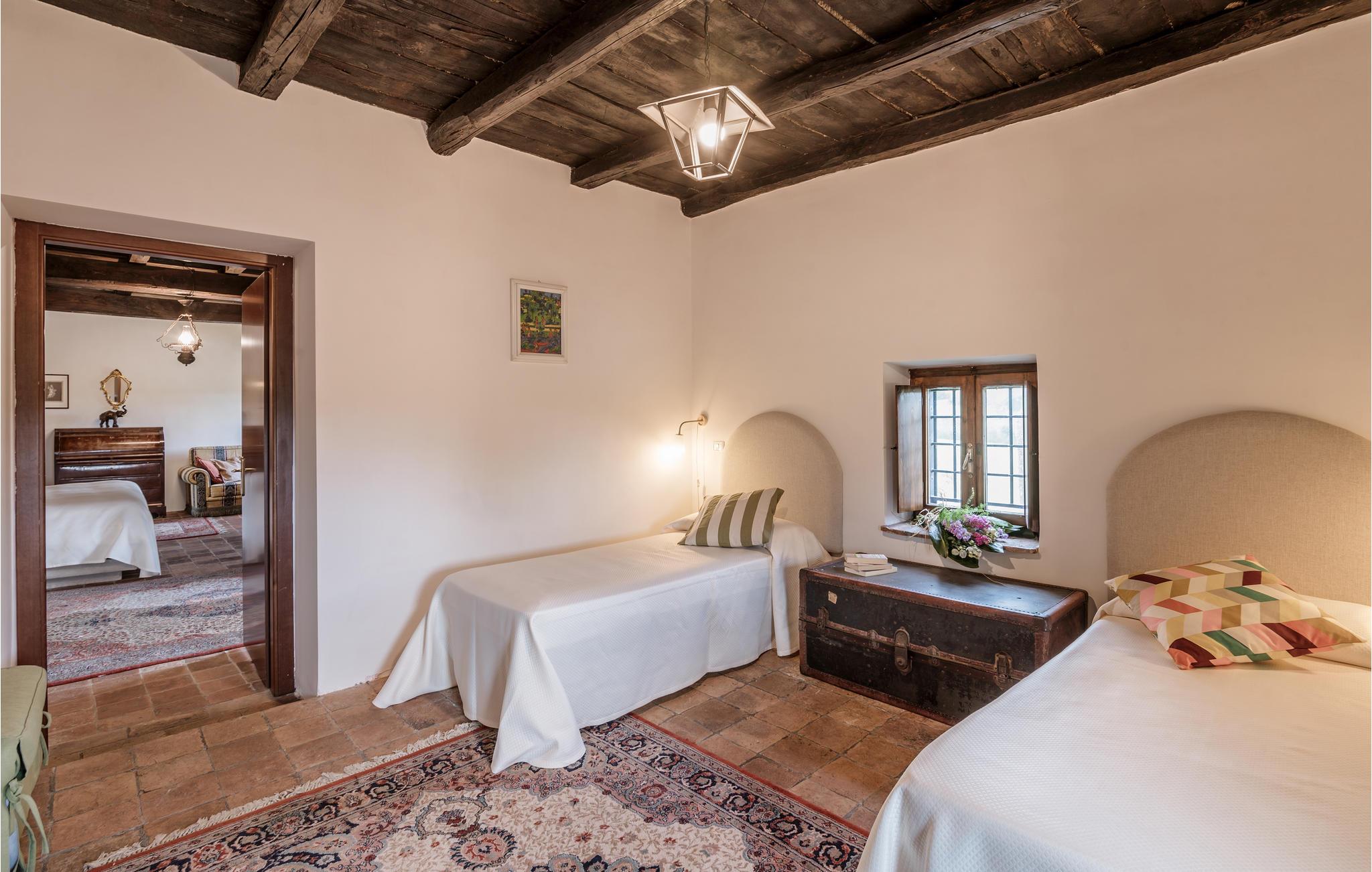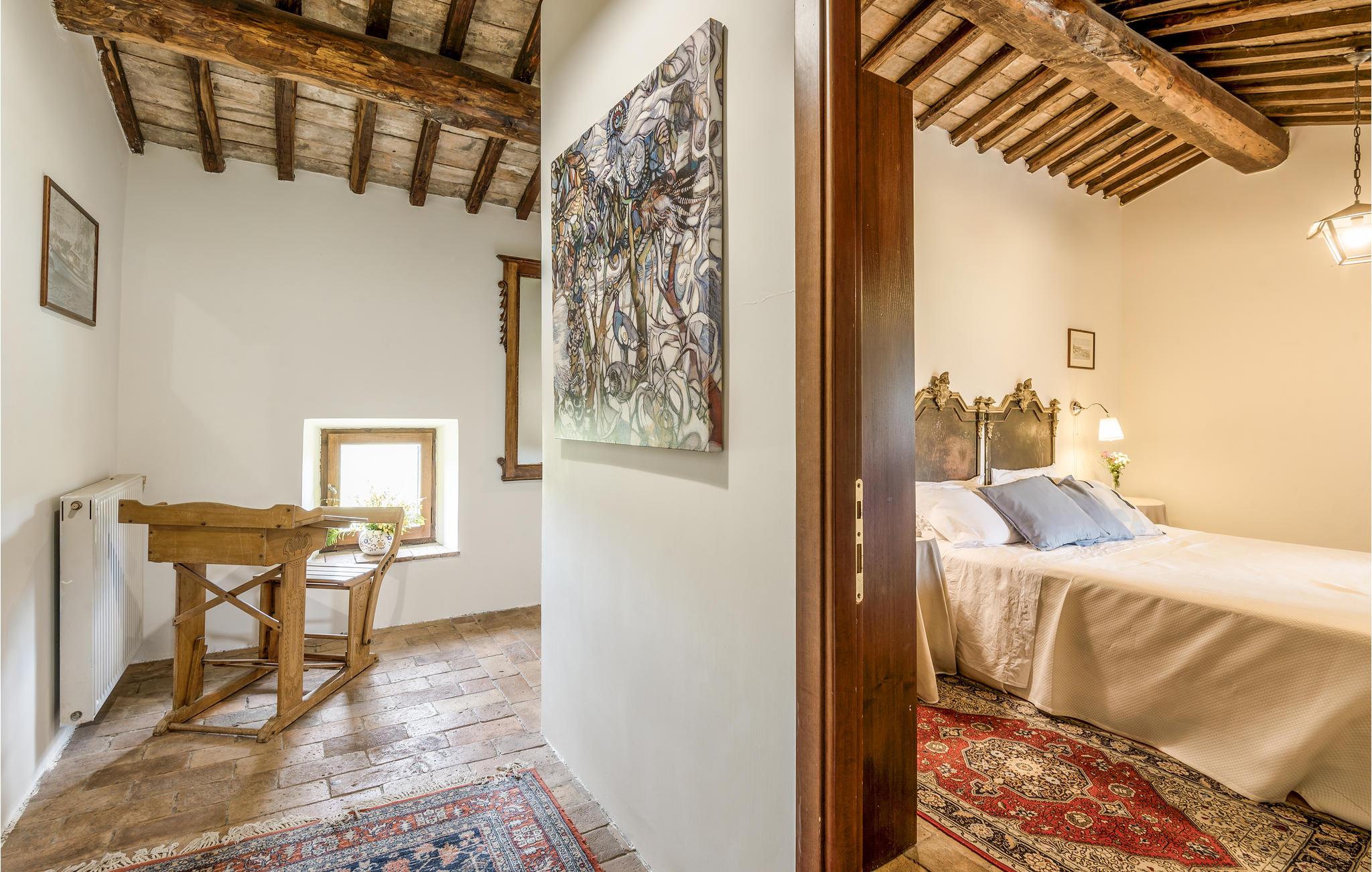 Huset ligger på en høj og er omgivet af en græsplæne, en frugtplantage og en olivenlund. Grunden er indhegnet. Der er swimmingpool og et børnebassin (4 x 4 m, maks. dybde 1.20 m). Hvis I har lyst, kan I besøge en etruskisk gravplads. Stue med klaver, bibliotek med adgang til haven, spisestue med adgang til haven (lysthus med bord og stråtag), spisekøkken bag huset med overdækket terrasse, hvor I også kan spise. Tilkørsel gennem automatisk indkørselsport.