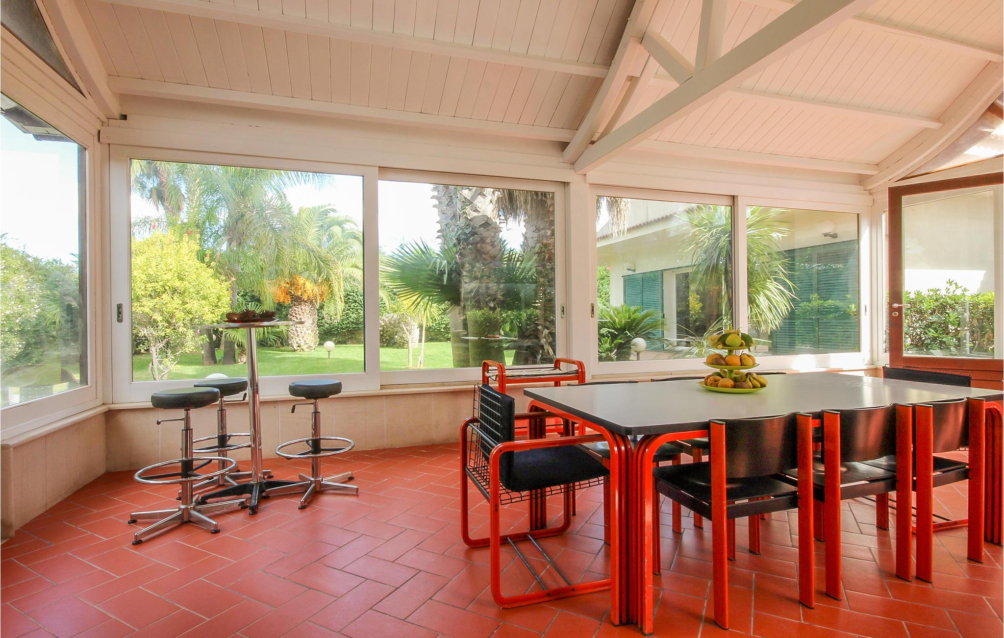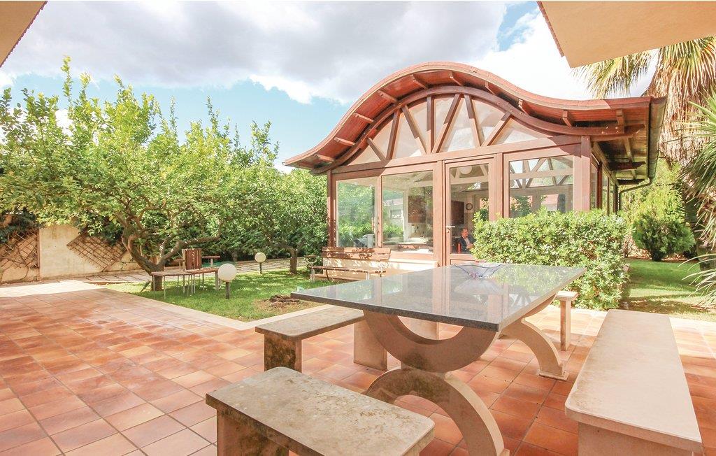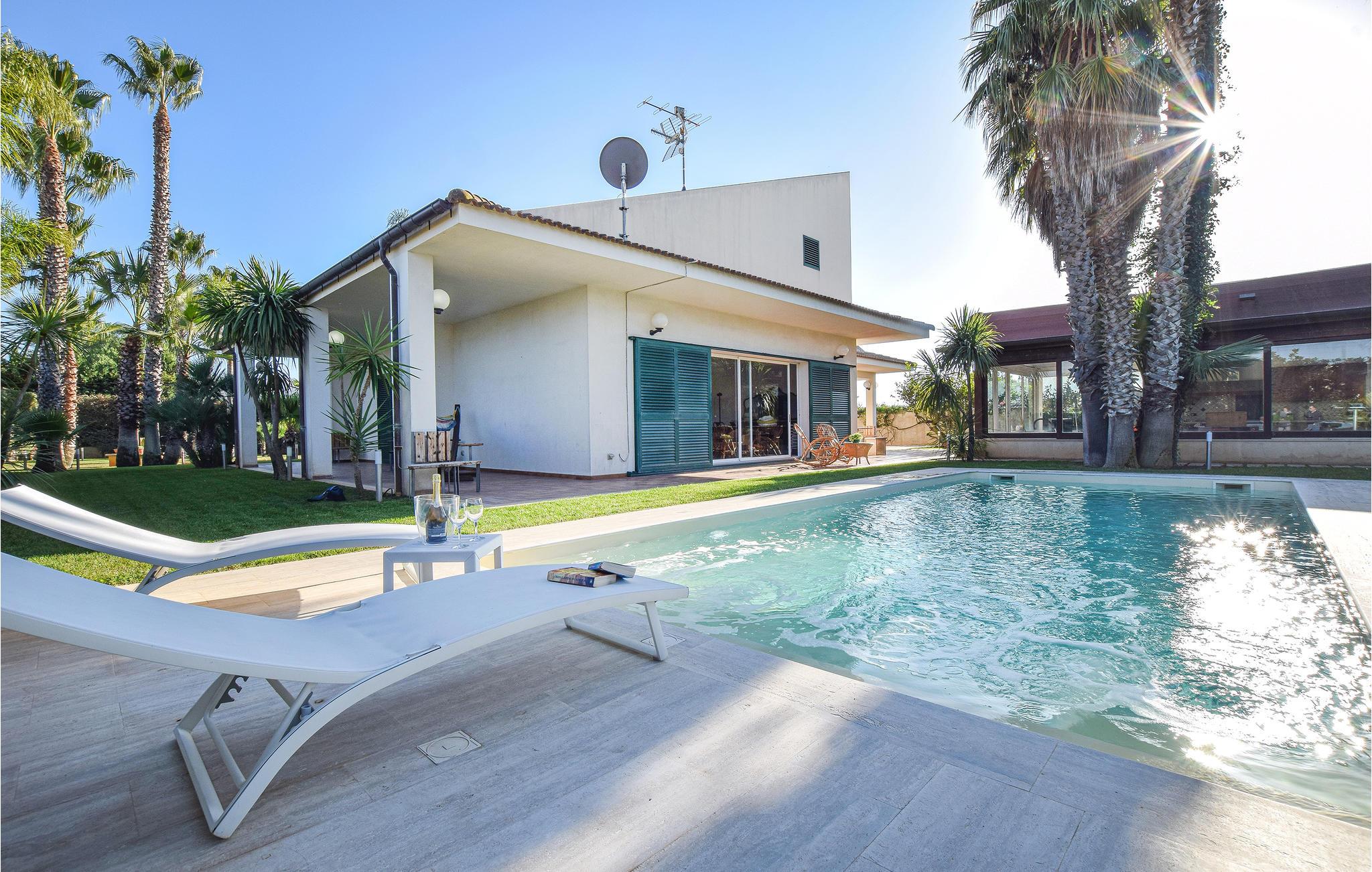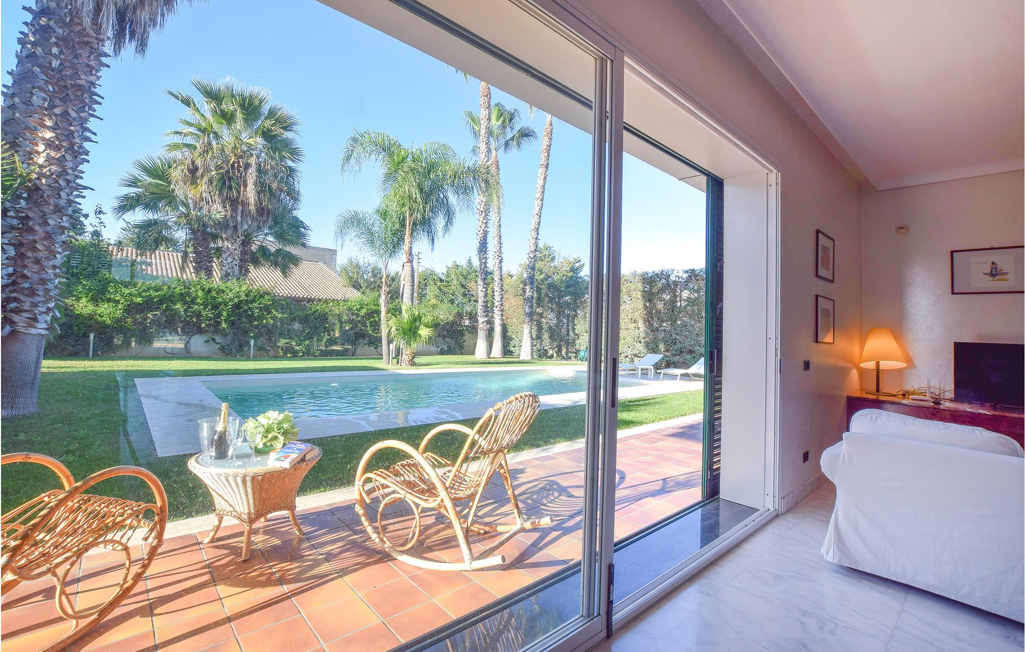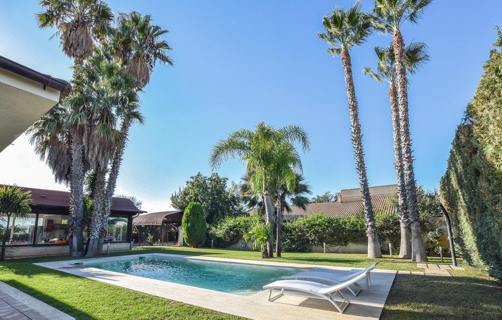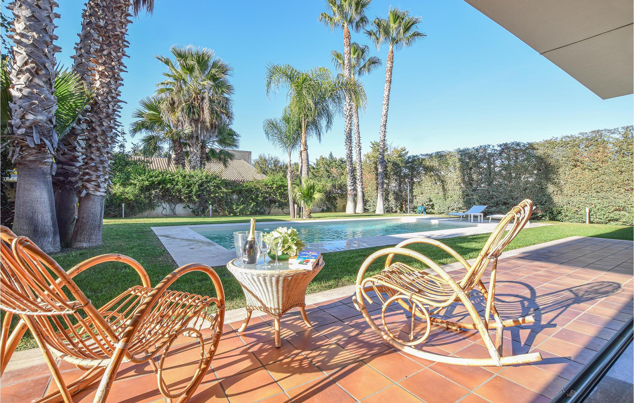 Dette feriehus har privat pool og ligger på en stor naturgrund med velplejede grønne plæner, palmer, buske, appelsin- og mandarintræer. Huset ligger kun 1,5 km fra Comiso, nær talrige fremragende seværdigheder og en smuk natur. Rummelig og lys stue (ca. 120 m²) med marmorgulve, store vinduer med udsigt over haven med swimmingpool. Lille anneks med køkken, professionel grill og stort spisebord. På verandaen står fitnessudstyr. Lille poolhus med wc og brusebad. Ideelt udgangspunkt til ture: de skønne UNESCO barrokbyer: Ragusa superiore (20 km), Ragusa Ibla, Modica, Scicli og Noto nås nemt og hurtigt. Der er 15 km til sydøst-Siciliens skønne sandstrande. 22 km til fiskerbyen Scoglitti med lille marina og badestrande.