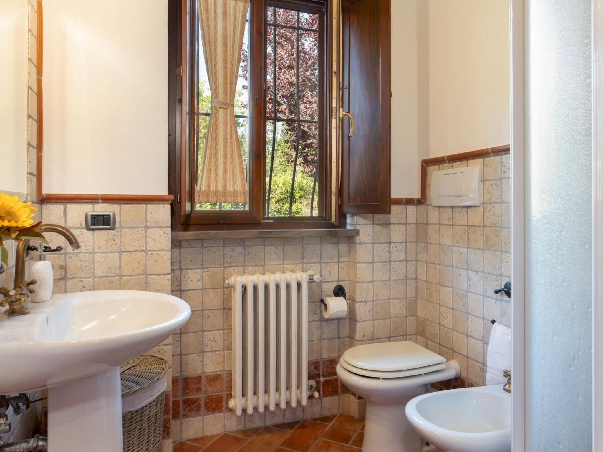 A separate laundry room is located in the garden, close to the house. The enclosed pool area is located approximately 20 metres from the house, on a lower level, and is reached via a flight of 12 stone steps. The rectangular-shaped pool measures 10 x 5 m with a depth varying from 1.20 to 1.60 m; it is lined with PVC, equipped with a chlorine purification system, an internal staircase for access and a cold-water shower. The solarium, tiled with ceramic tiles, is equipped with sun loungers, deckchairs and parasols. The pool is open from the first Saturday in May to the last Saturday in September.