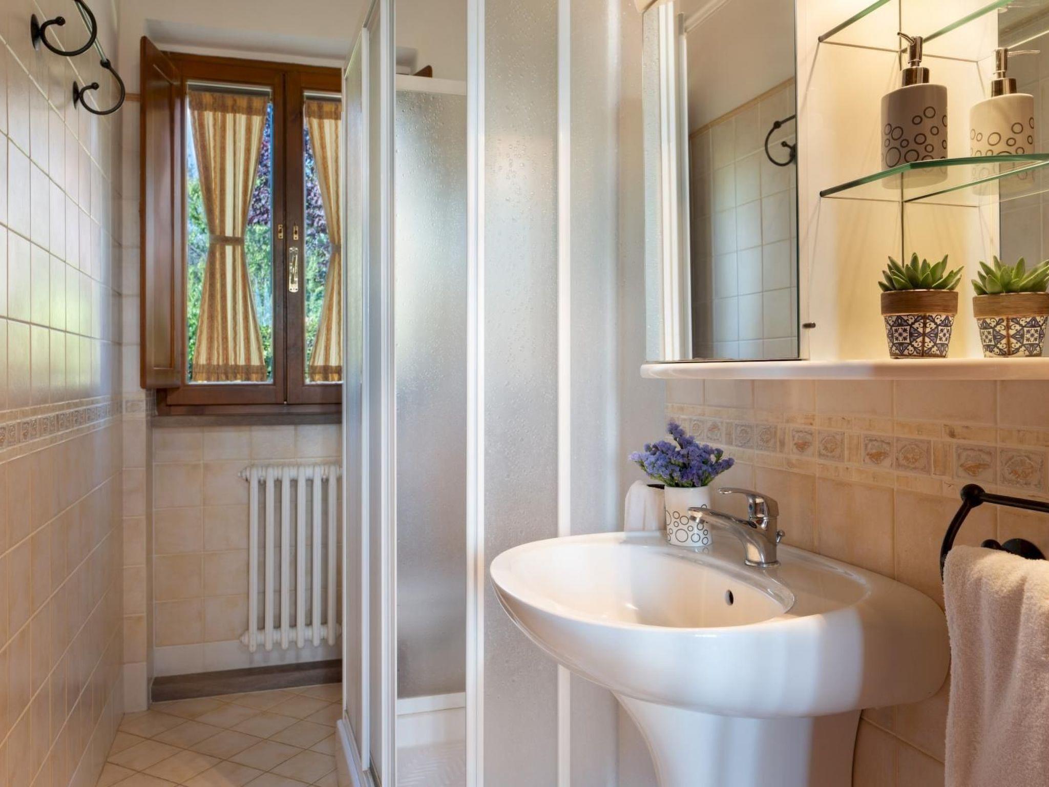 Guests can gather for meals and moments of relaxation, and enjoy al fresco dining under the shaded porch with the most breathtaking views of Tuscany. The villa is surrounded by 2000 square metres of well-kept garden, planted with shrubs and flowering plants. A few steps away, the enclosed pool area is on a lower level, surrounded by a tiled solarium and equipped with sun loungers and parasols.
