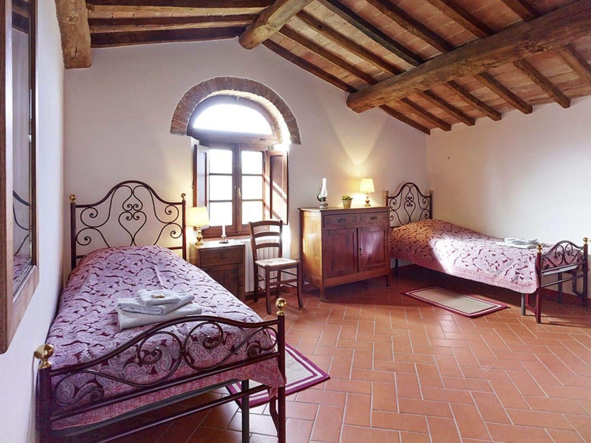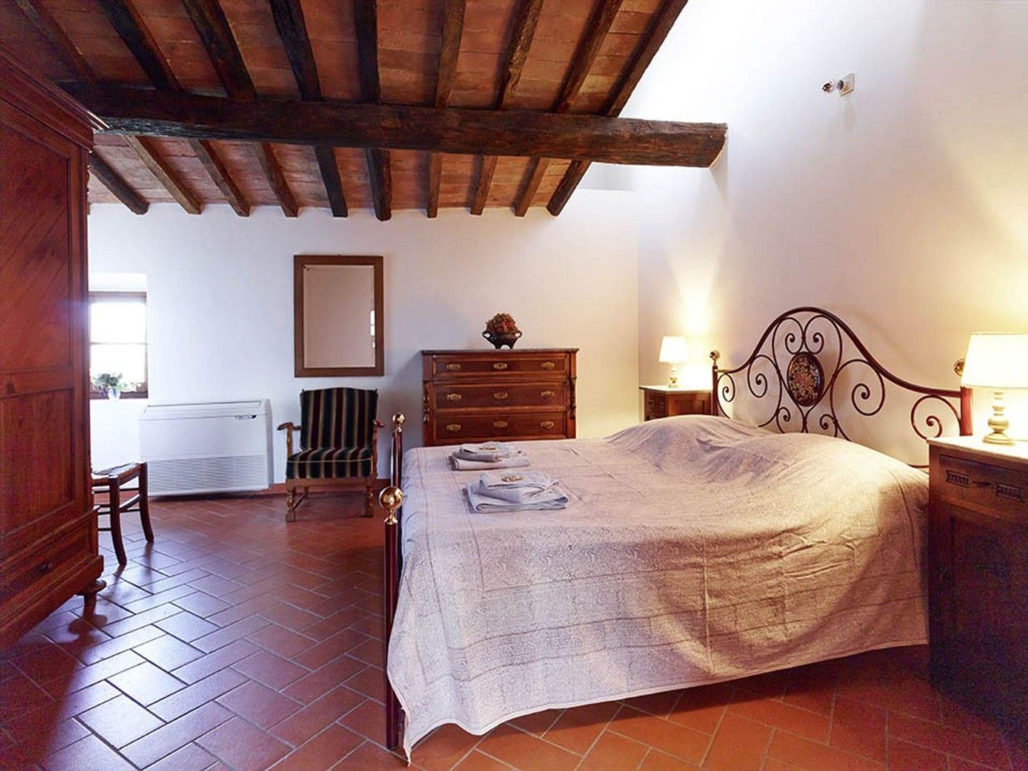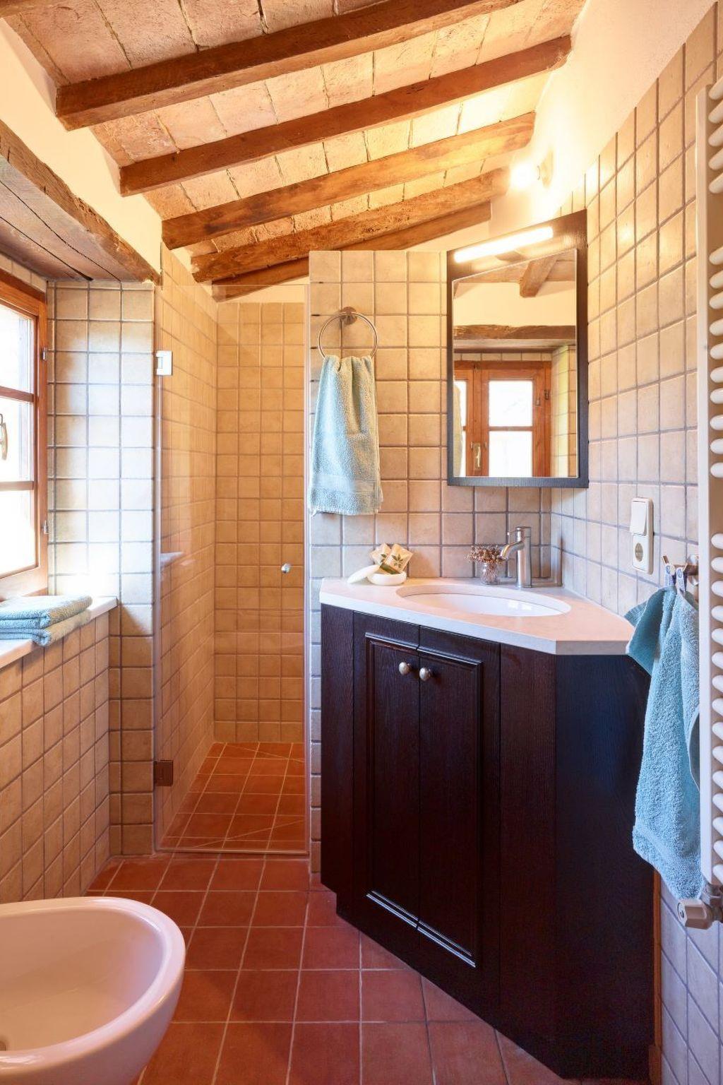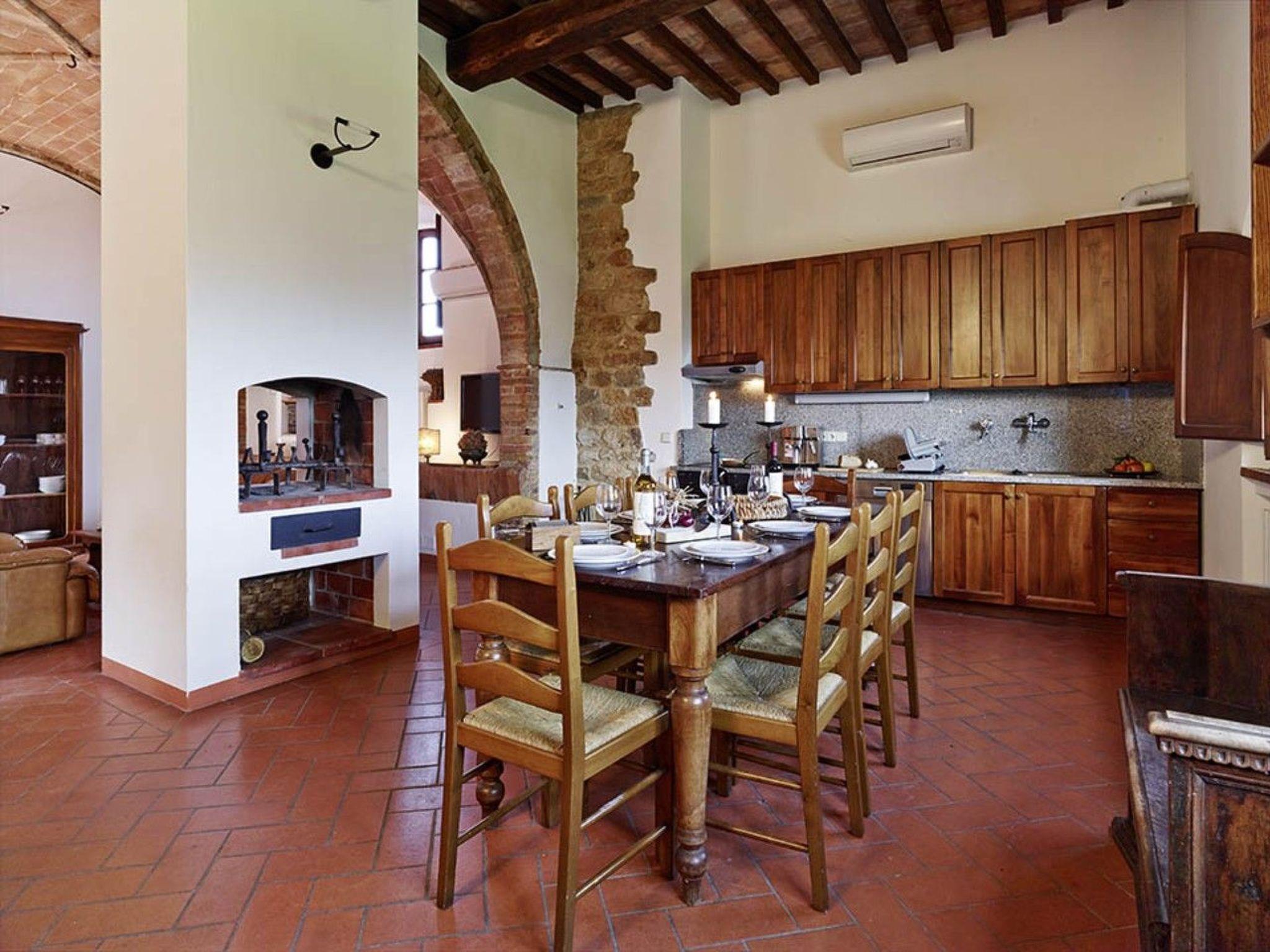 La Stalla is a large holiday flat (145 m²) for up to 8 people. Its architectural features include the exceptionally beautiful, well-preserved cross-arched ceilings. The flat forms a separate house with two floors. It has 2 living rooms, 3 bedrooms with orthopaedic beds, a spacious kitchen with dining room, 2 shower rooms and a guest WC. Each living room has an open fireplace. Upstairs there is a panoramic window with far-reaching views of the beautiful landscape of the Era Valley and access to the small terrace. The rustic paved courtyard serves as a large terrace. The furnishings are authentic Tuscan. The kitchen furniture is made of solid walnut wood with worktops made of real granite. The equipment includes a dishwasher, a cooker with 4 ceramic hobs and an oven, a fridge, a coffee machine and a toaster as well as a hairdryer. There is air conditioning and heating and a constant central hot water supply as well as satellite TV with numerous German programmes and a stereo system with CD player. A washing machine is centrally available.