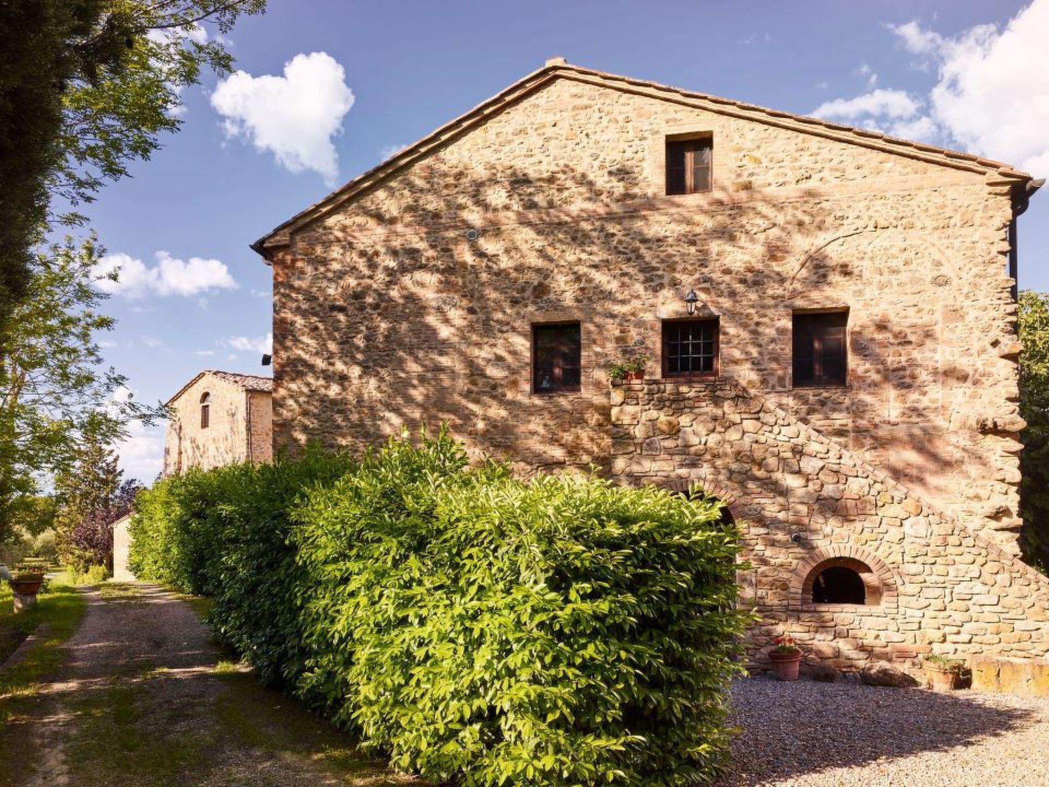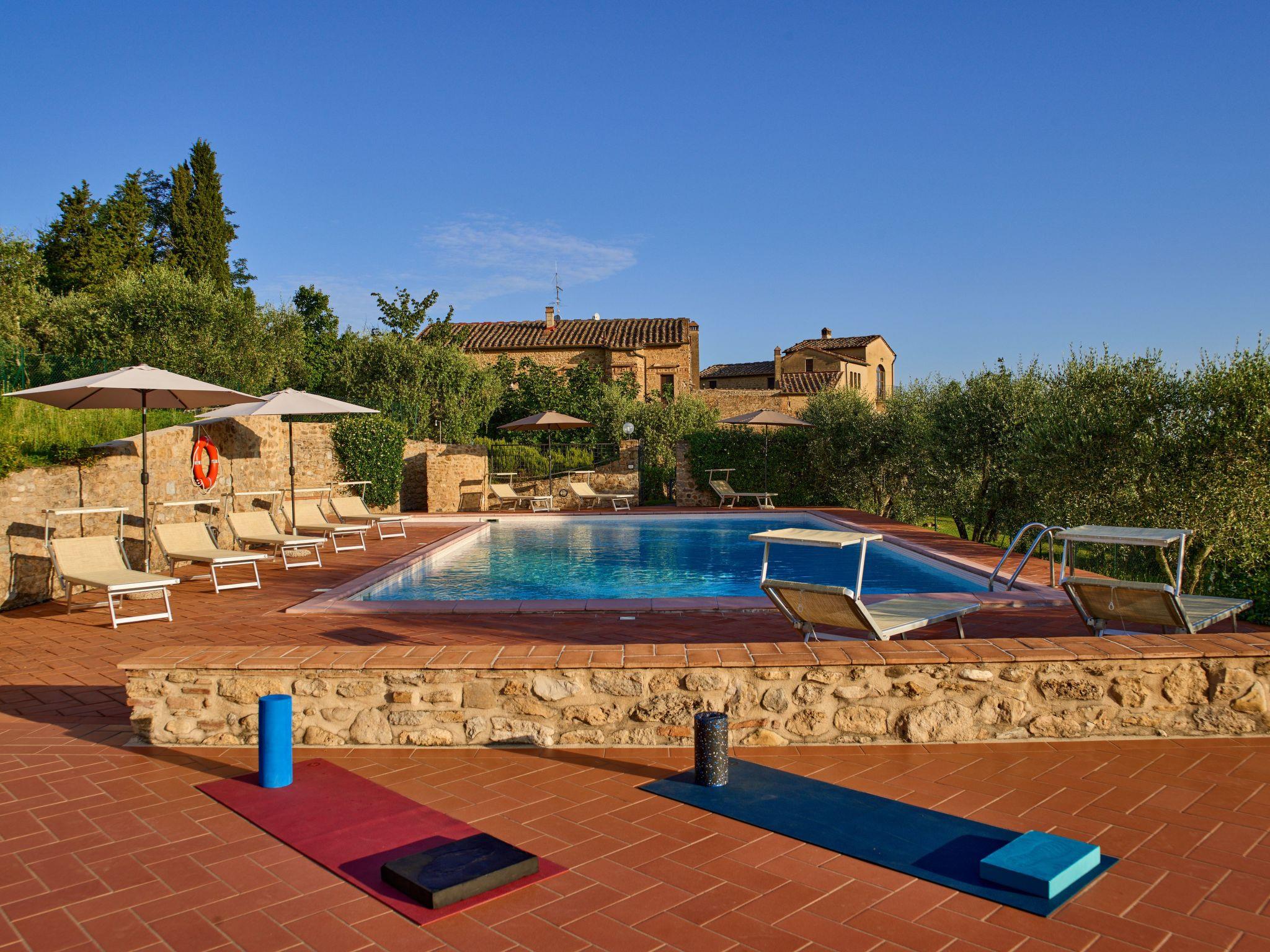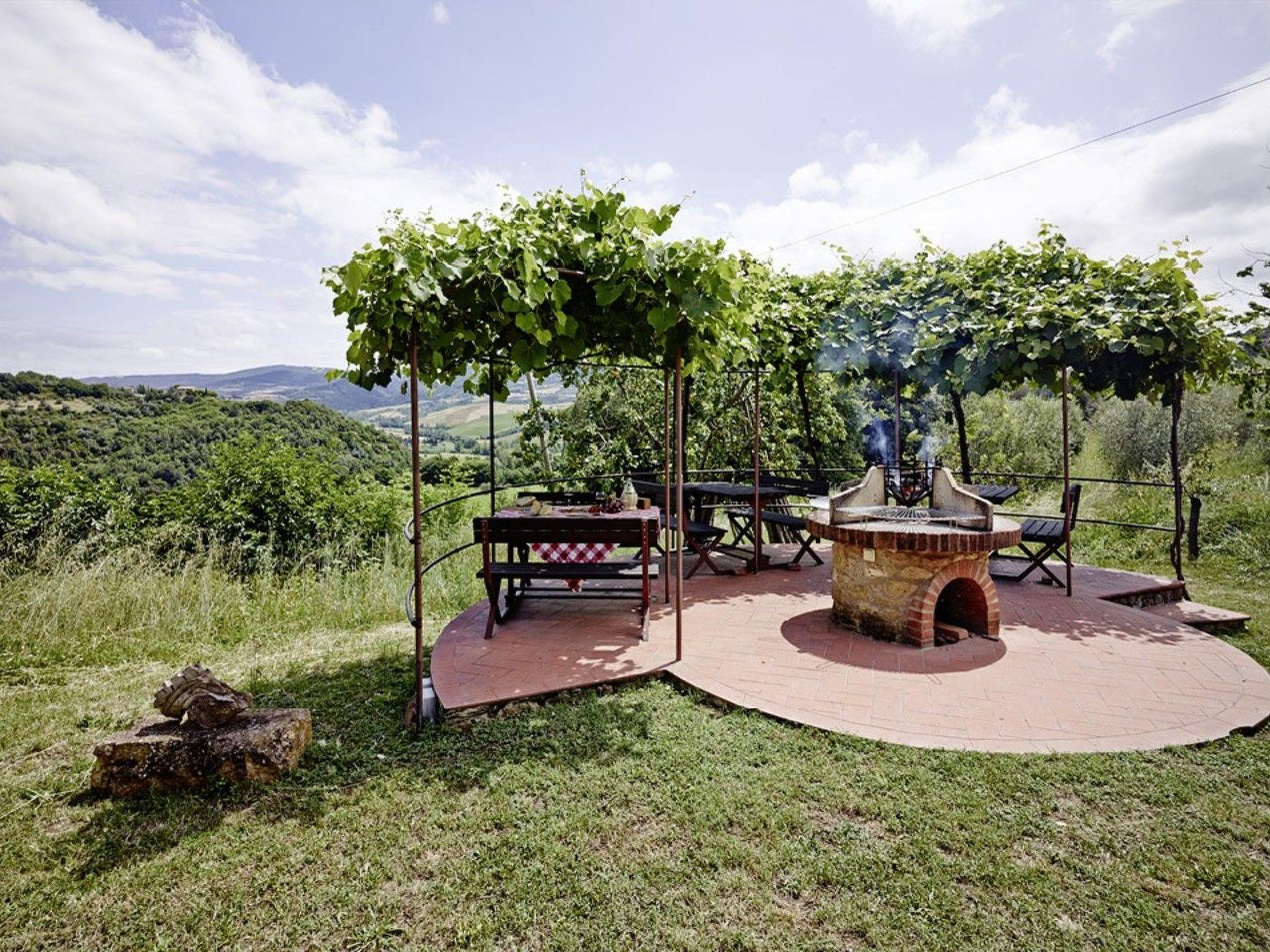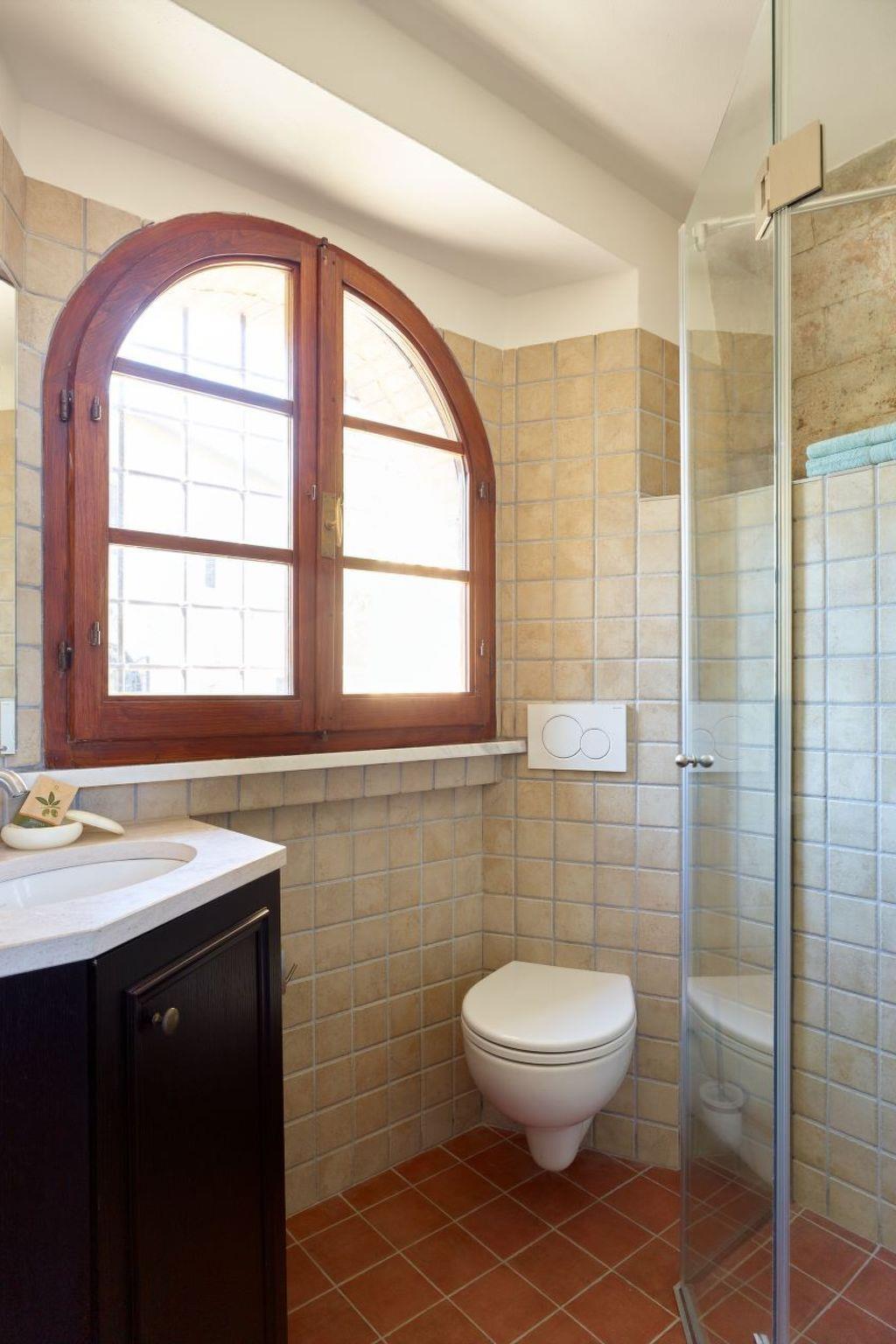 La Stalla is a large holiday flat (145 m²) for up to 8 people. Its architectural features include the exceptionally beautiful, well-preserved cross-arched ceilings. The flat forms a separate house with two floors. It has 2 living rooms, 3 bedrooms with orthopaedic beds, a spacious kitchen with dining room, 2 shower rooms and a guest WC. Each living room has an open fireplace. Upstairs there is a panoramic window with far-reaching views of the beautiful landscape of the Era Valley and access to the small terrace. The rustic paved courtyard serves as a large terrace. The furnishings are authentic Tuscan. The kitchen furniture is made of solid walnut wood with worktops made of real granite. The equipment includes a dishwasher, a cooker with 4 ceramic hobs and an oven, a fridge, a coffee machine and a toaster as well as a hairdryer. There is air conditioning and heating and a constant central hot water supply as well as satellite TV with numerous German programmes and a stereo system with CD player. A washing machine is centrally available.