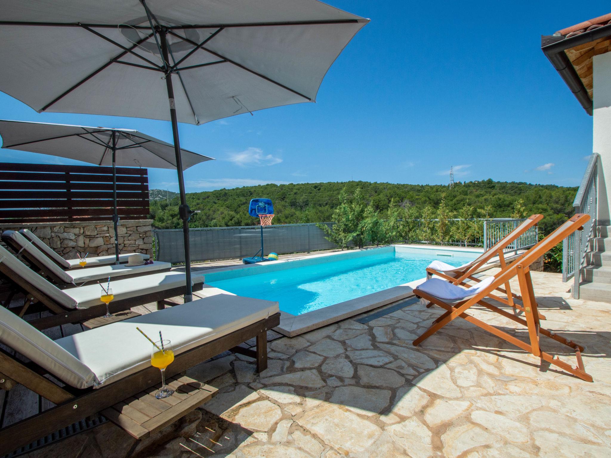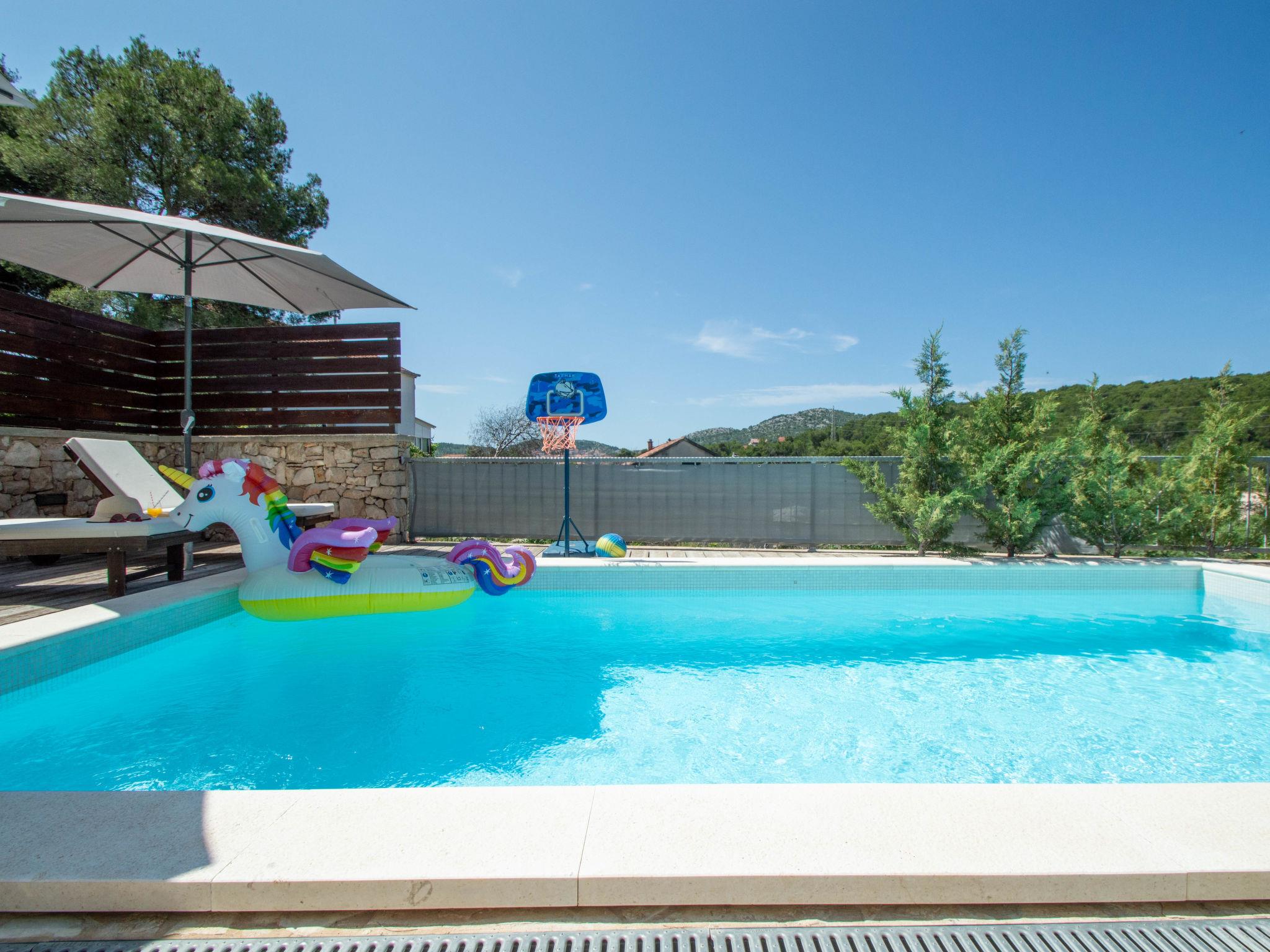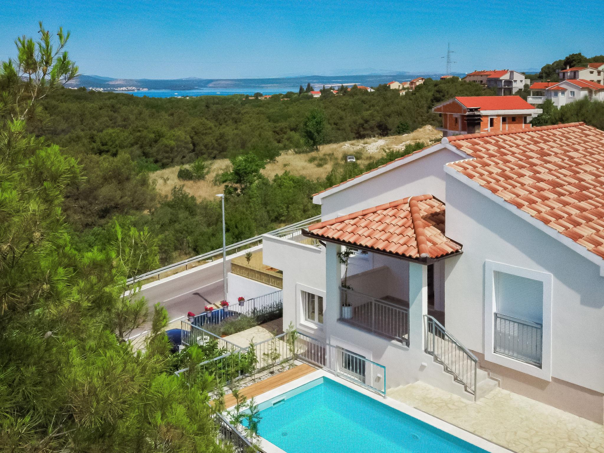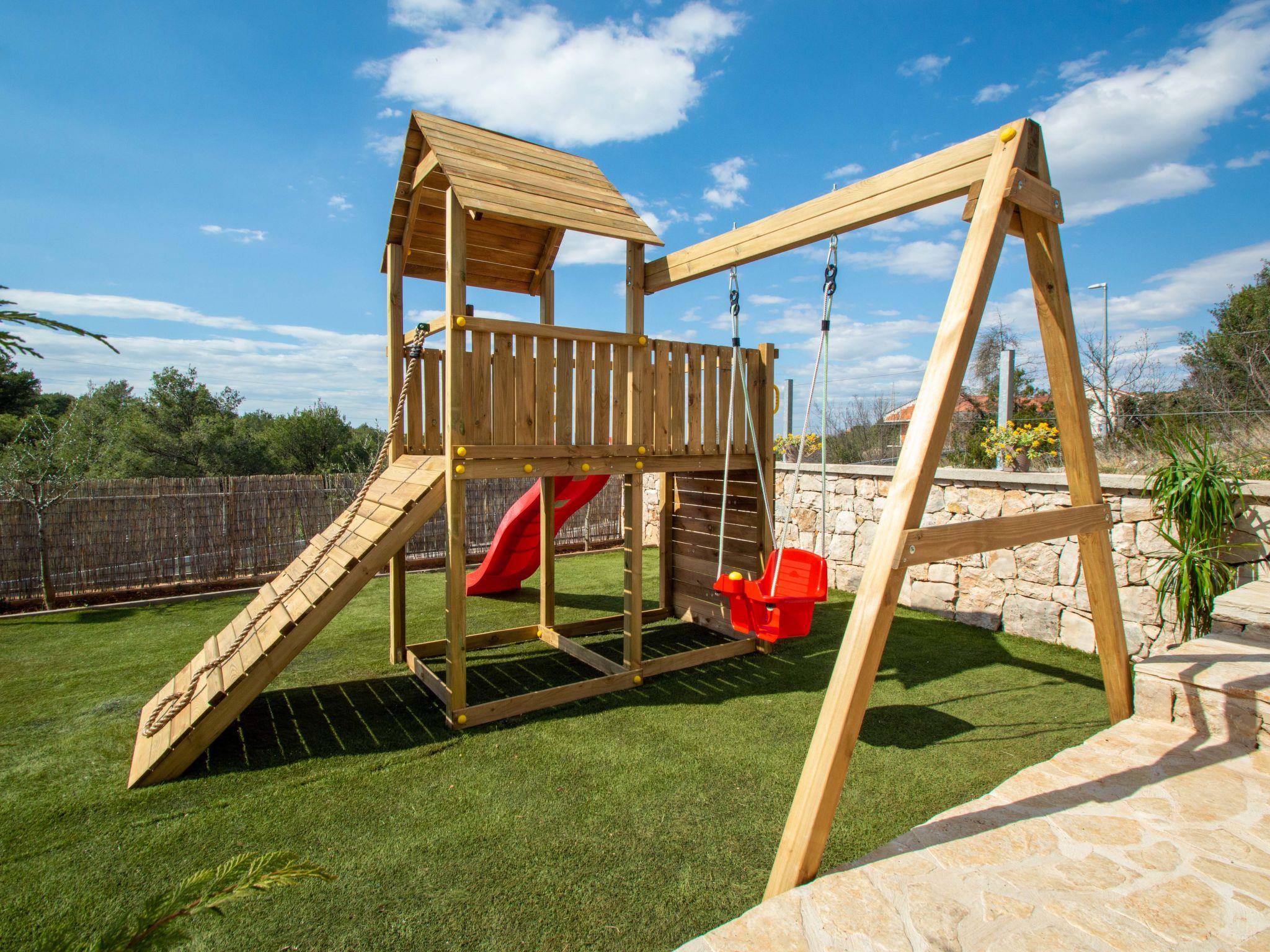Bilice: Beautiful single-family house "Dalmacia", 2 storeys. 2.5 km from the centre of Bilice, 5 km from the centre of Šibenik, in a sunny position, 5 km from the sea, 2.5 km from the lake, located by a road. Private: property 500 m2, wildlife garden and trees, swimming pool angular (6 x 3 m, depth 150 cm, seasonal availability: 28.May. - 03.Oct.) with internal staircase. Outdoor shower, children's playground (slide, swing). In the house: internet access, washing machine. Parking (for 3 cars) at the house on the premises. Shop 1 km, restaurant 3.5 km, café 200 m, bus stop 600 m, pebble beach 5 km, bathing lake 2.5 km. Nearby attractions: NP Krka 10 km. Well-known lakes can easily be reached: Prokljansko jezero 2.5 km. Part of the house is closed and unoccupied.