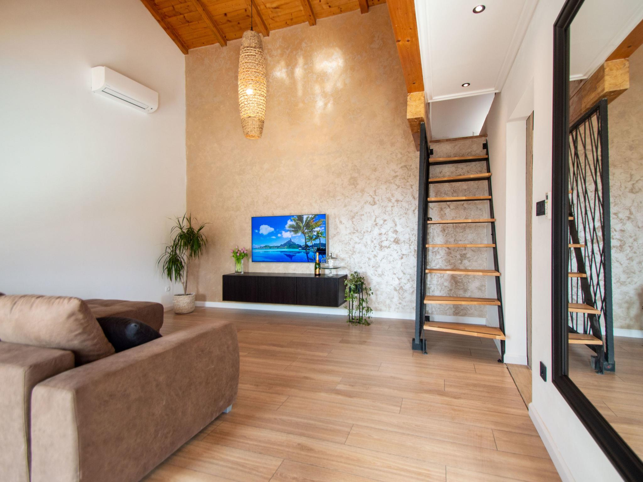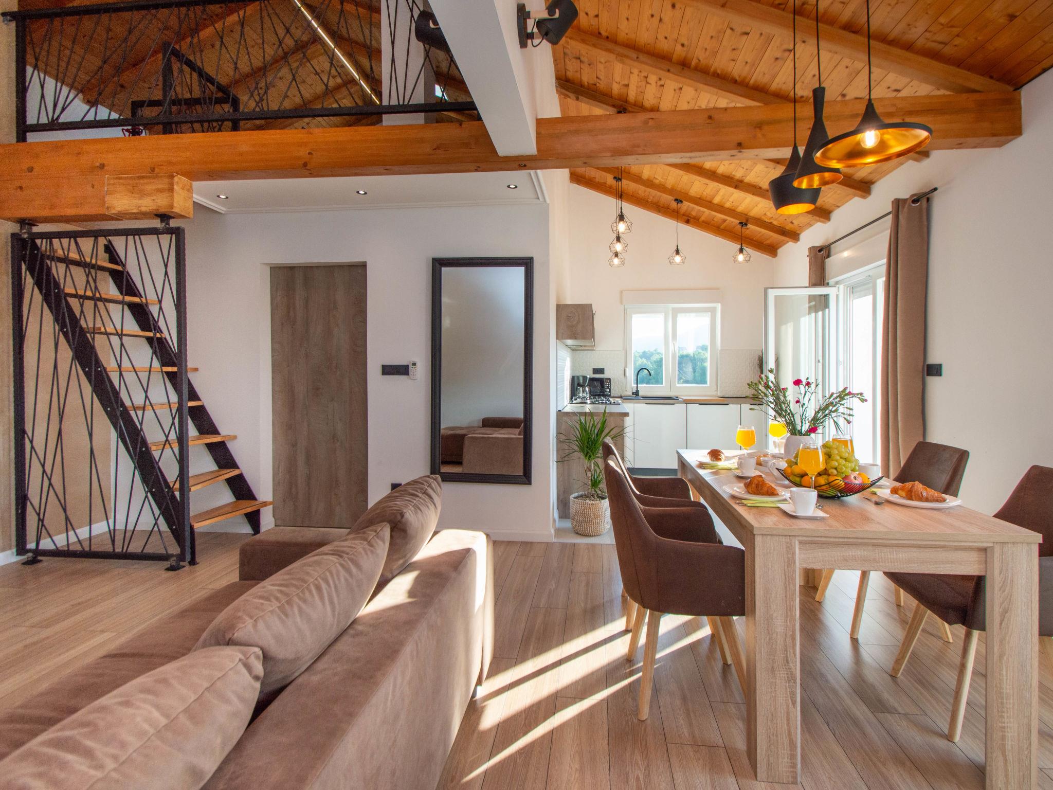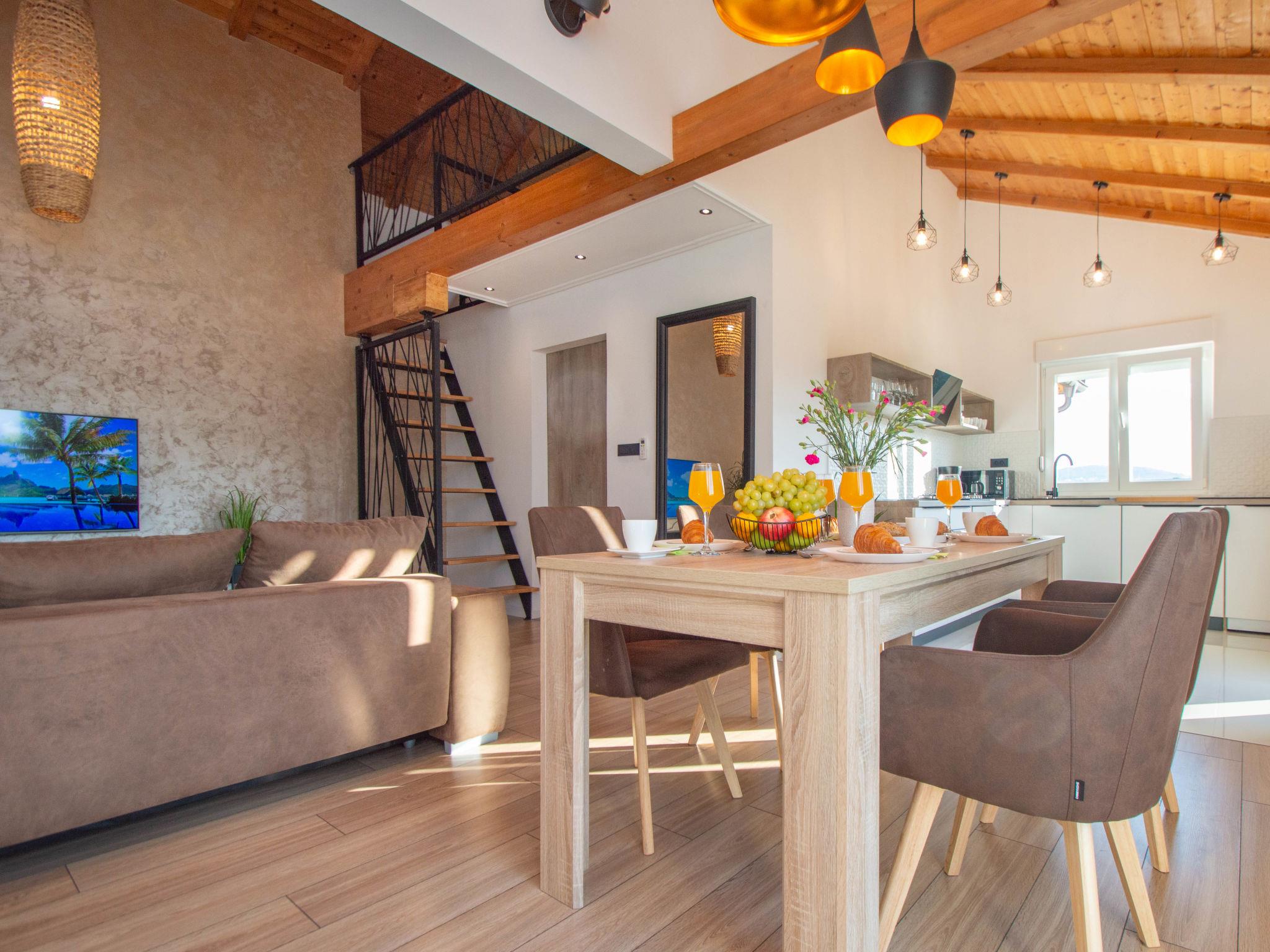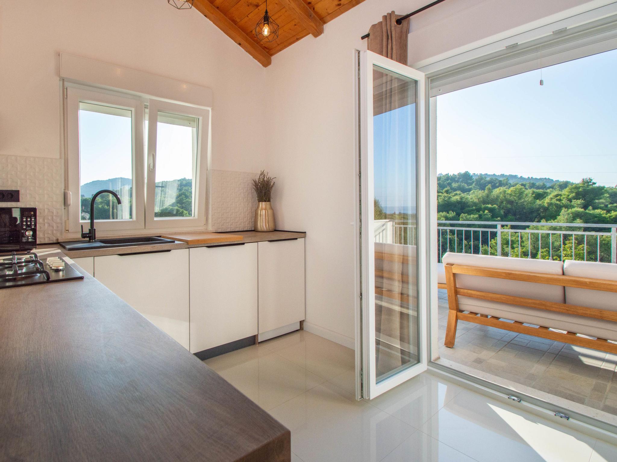 4-room house 118 m2 on 2 levels, south facing position. Cosy furnishings: living/dining room with open-hearth fireplace and satellite TV (flat screen), air conditioning. Exit to the terrace. 1 room with 1 french bed (160 cm, length 200 cm), TV (flat screen). Exit to the terrace. 1 room 7 m2 with 1 x 2 bunk beds (90 cm, length 200 cm). Open kitchen (4 hot plates, oven, dishwasher, toaster, kettle, microwave, freezer, electric coffee machine). Shower/WC. Upper floor: (exterior staircase) living/dining room with 1 double sofabed (140 cm, length 200 cm), satellite TV (flat screen), air conditioning. Exit to the terrace. (steep stair) open gallery with sloping ceilings, ceiling height 115 - 230 cm with rooflight with 1 french bed (160 cm, length 200 cm), air conditioning. Open kitchen (4 hot plates, oven, kettle). Shower/WC. Terrace 30 m2, terrace 18 m2. Terrace furniture, deck chairs. View of the swimming pool. Facilities: safe, iron, hair dryer. Internet (WiFi, free).