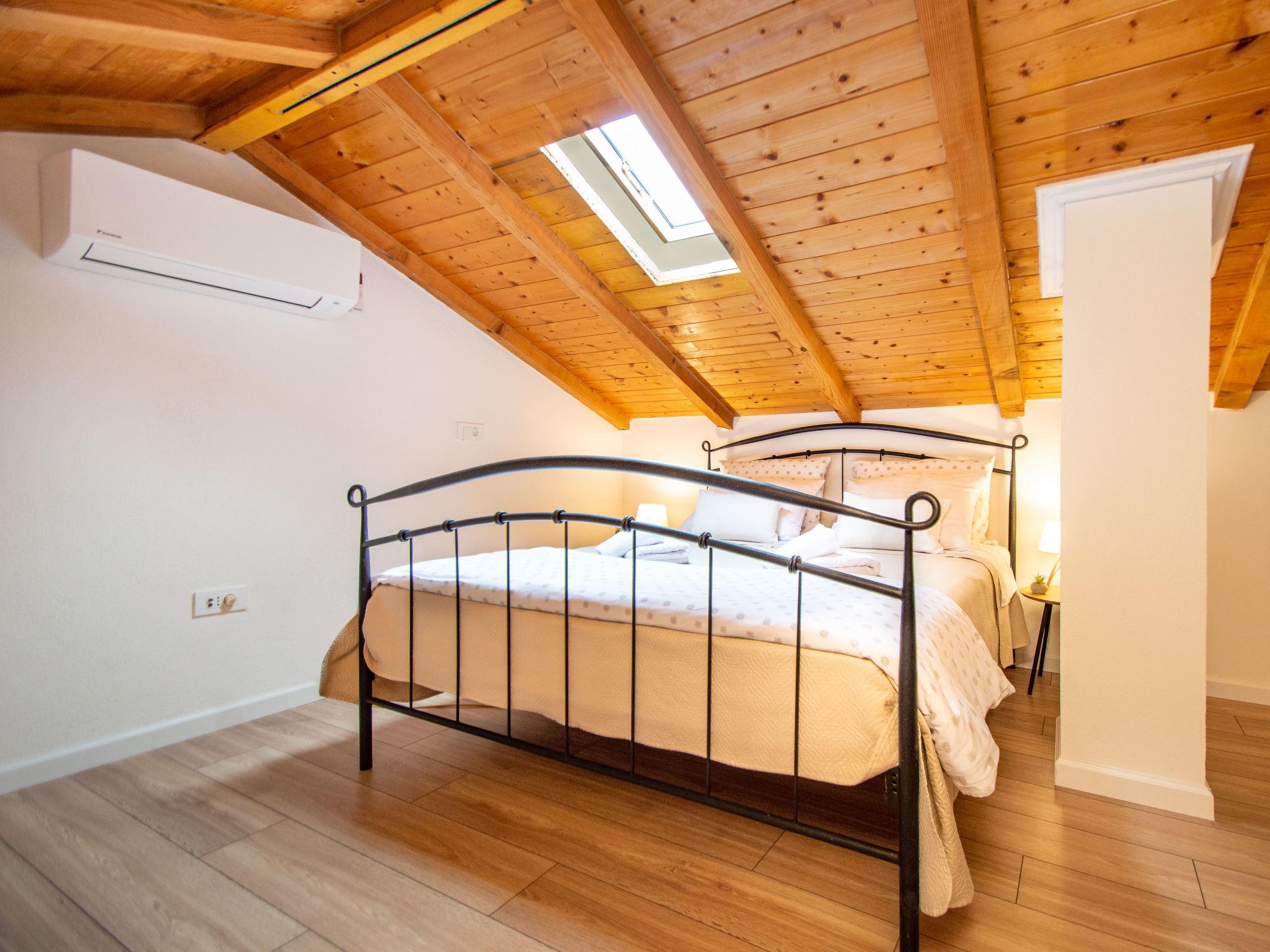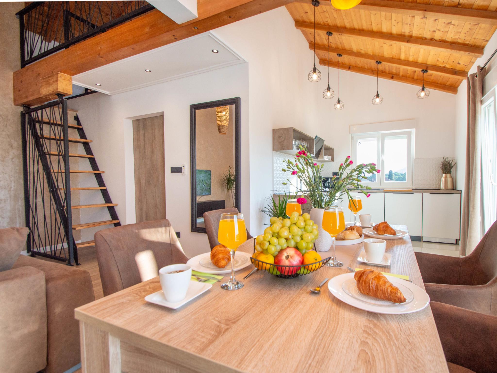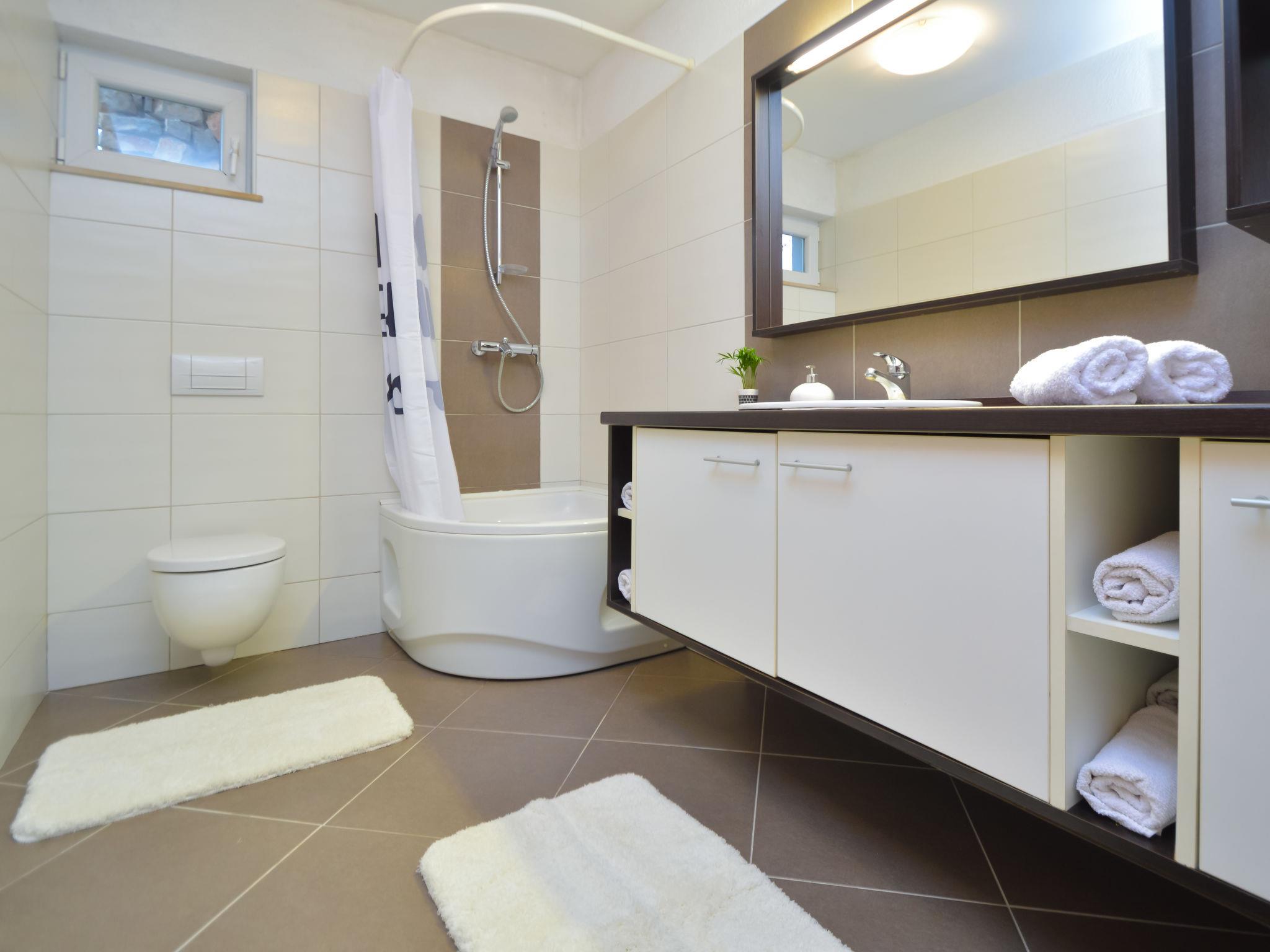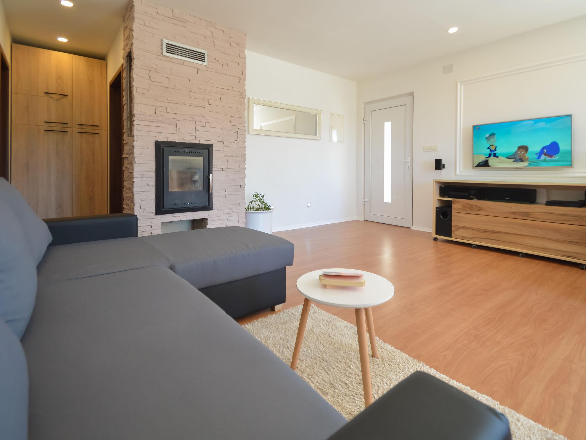 4-room house 118 m2 on 2 levels, south facing position. Cosy furnishings: living/dining room with open-hearth fireplace and satellite TV (flat screen), air conditioning. Exit to the terrace. 1 room with 1 french bed (160 cm, length 200 cm), TV (flat screen). Exit to the terrace. 1 room 7 m2 with 1 x 2 bunk beds (90 cm, length 200 cm). Open kitchen (4 hot plates, oven, dishwasher, toaster, kettle, microwave, freezer, electric coffee machine). Shower/WC. Upper floor: (exterior staircase) living/dining room with 1 double sofabed (140 cm, length 200 cm), satellite TV (flat screen), air conditioning. Exit to the terrace. (steep stair) open gallery with sloping ceilings, ceiling height 115 - 230 cm with rooflight with 1 french bed (160 cm, length 200 cm), air conditioning. Open kitchen (4 hot plates, oven, kettle). Shower/WC. Terrace 30 m2, terrace 18 m2. Terrace furniture, deck chairs. View of the swimming pool. Facilities: safe, iron, hair dryer. Internet (WiFi, free).