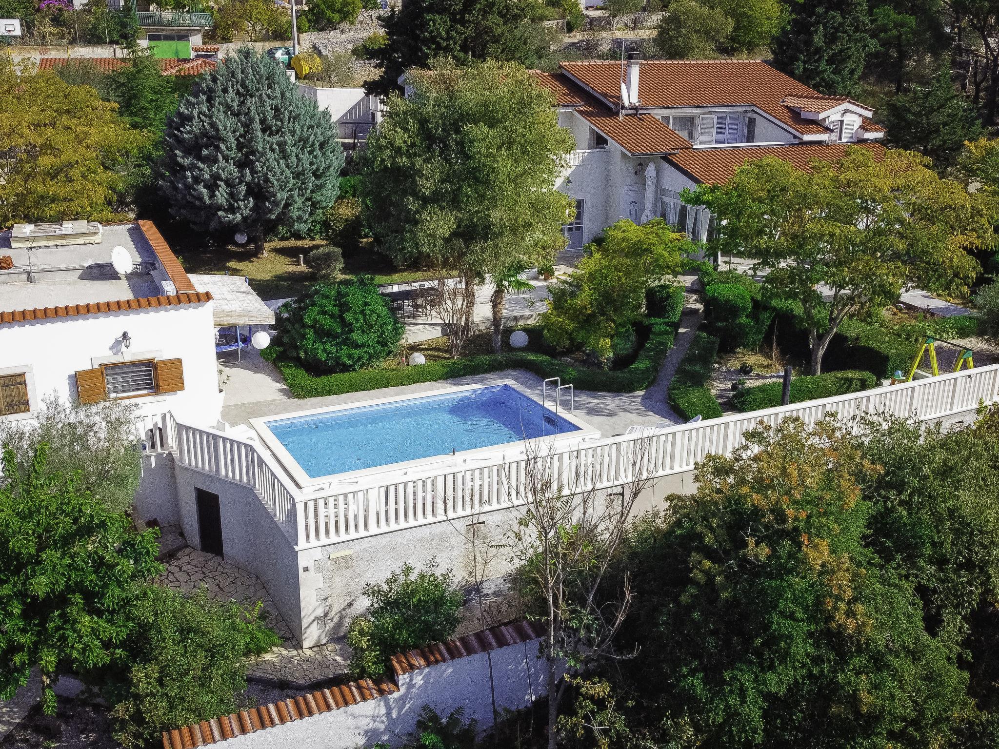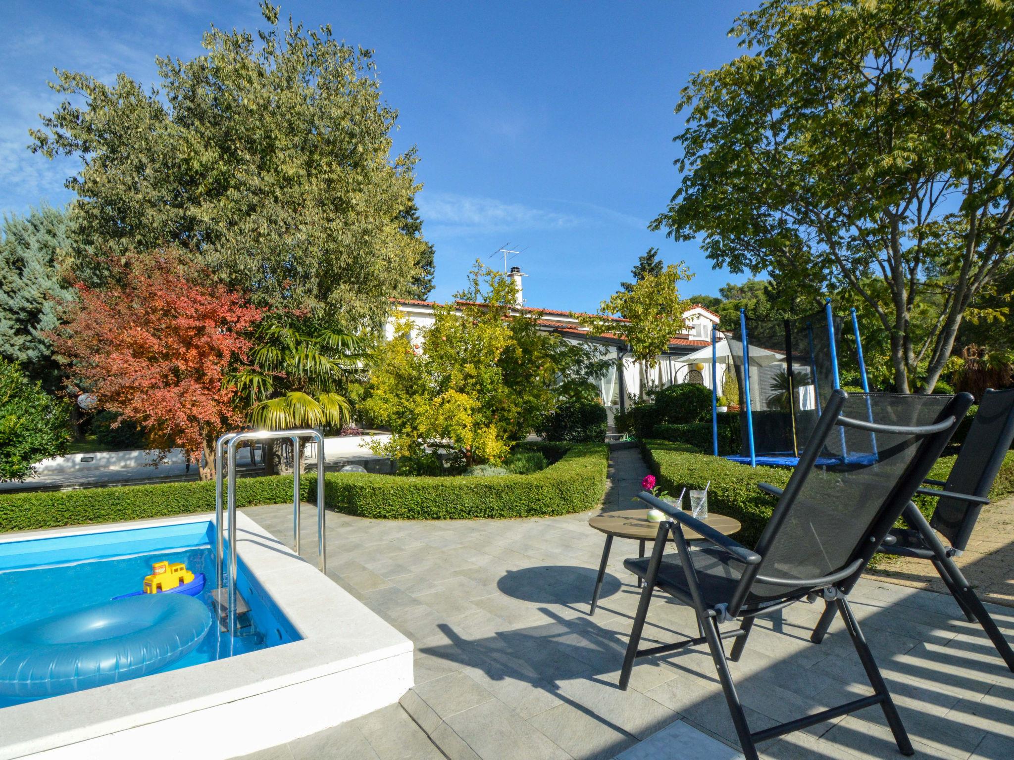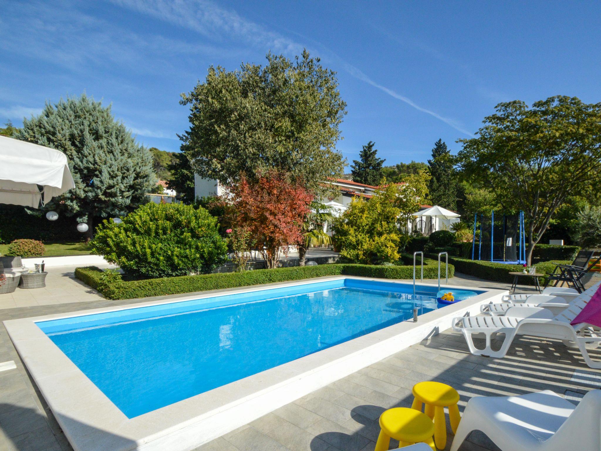 Beautiful single-family house "Villa Bloom garden". 5 km from the centre of Šibenik, in a quiet, sunny position, 5.5 km from the sea, in the countryside. Private: property 2'000 m2 (fenced), garden with wildlife garden and trees, swimming pool angular (7 x 4 m, depth 120 cm, seasonal availability: 01.Apr. - 31.Oct.). Outdoor shower, terrace (50 m2), garden furniture, barbecue, children's playground (swing, sandbox). In the house: internet access, trampoline, washing machine. Parking (for 3 cars) at the house on the premises. Shop 2.5 km, restaurant 4 km, bus stop 650 m, pebble beach 5.5 km. Riding stable 1 km. Nearby attractions: NP Krka 11 km. Please note: suitable for families. 1st floor is closed and not occupied. The unit consists of the small, separate house and the main house rented as one unit. By groups of young people double deposit is requested on arrival.
