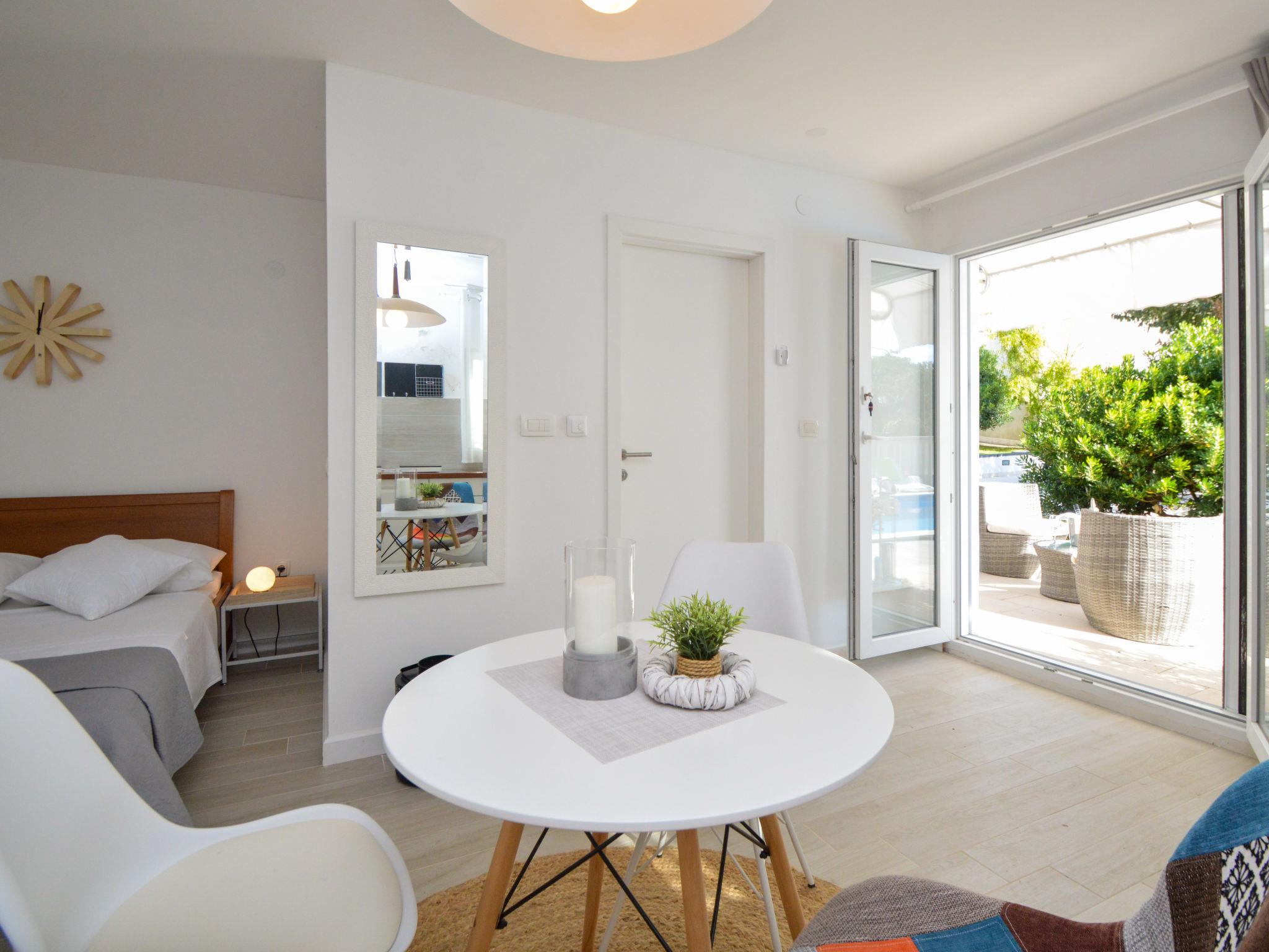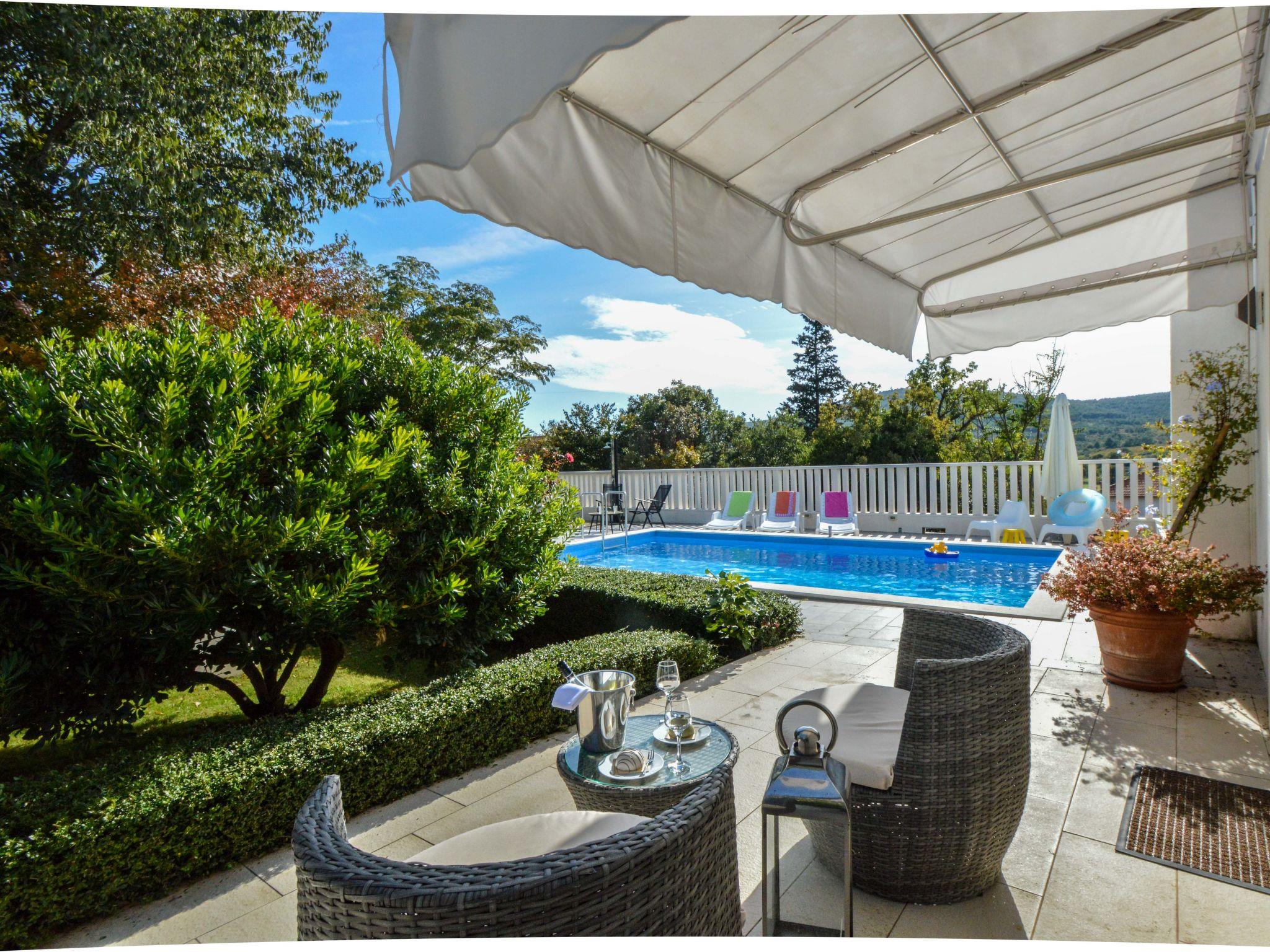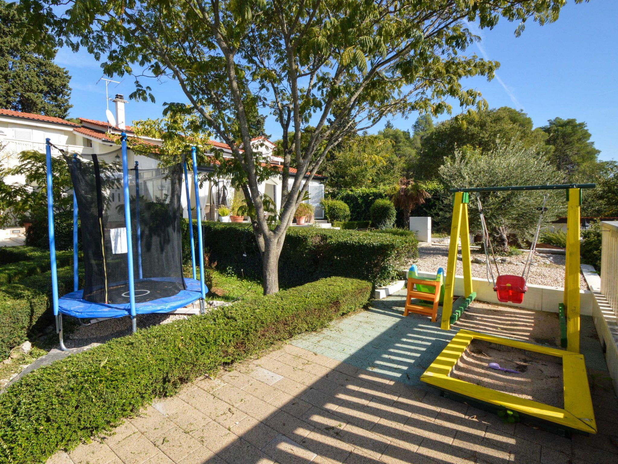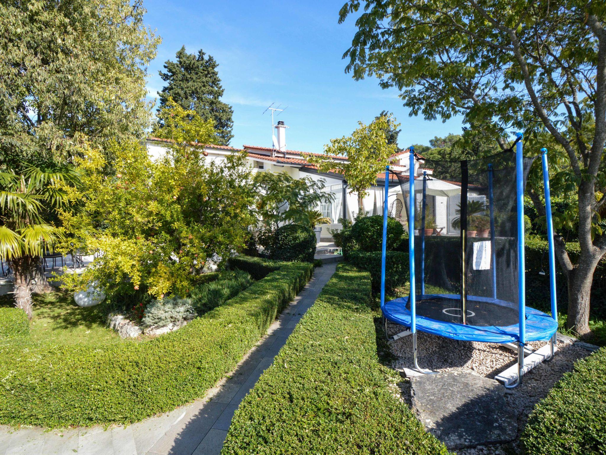 Beautiful single-family house "Villa Bloom garden". 5 km from the centre of Šibenik, in a quiet, sunny position, 5.5 km from the sea, in the countryside. Private: property 2'000 m2 (fenced), garden with wildlife garden and trees, swimming pool angular (7 x 4 m, depth 120 cm, seasonal availability: 01.Apr. - 31.Oct.). Outdoor shower, terrace (50 m2), garden furniture, barbecue, children's playground (swing, sandbox). In the house: internet access, trampoline, washing machine. Parking (for 3 cars) at the house on the premises. Shop 2.5 km, restaurant 4 km, bus stop 650 m, pebble beach 5.5 km. Riding stable 1 km. Nearby attractions: NP Krka 11 km. Please note: suitable for families. 1st floor is closed and not occupied. The unit consists of the small, separate house and the main house rented as one unit. By groups of young people double deposit is requested on arrival.