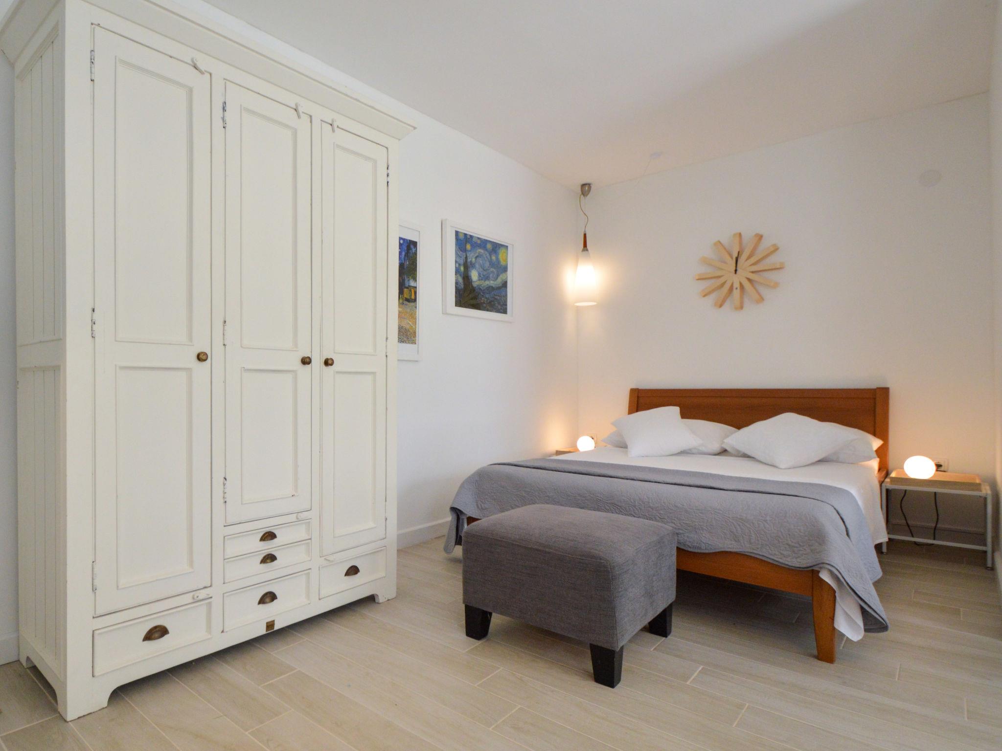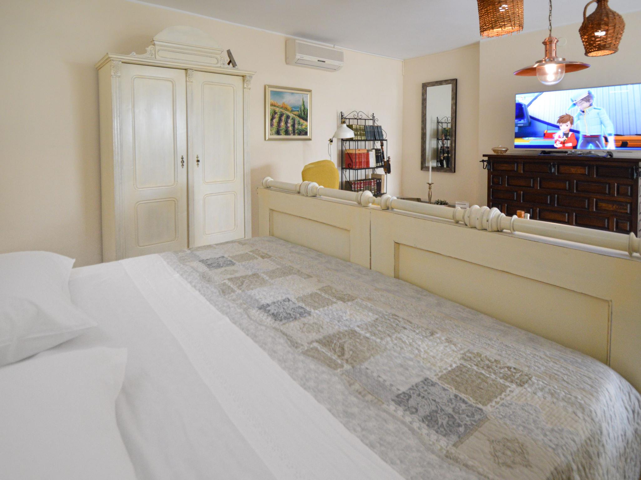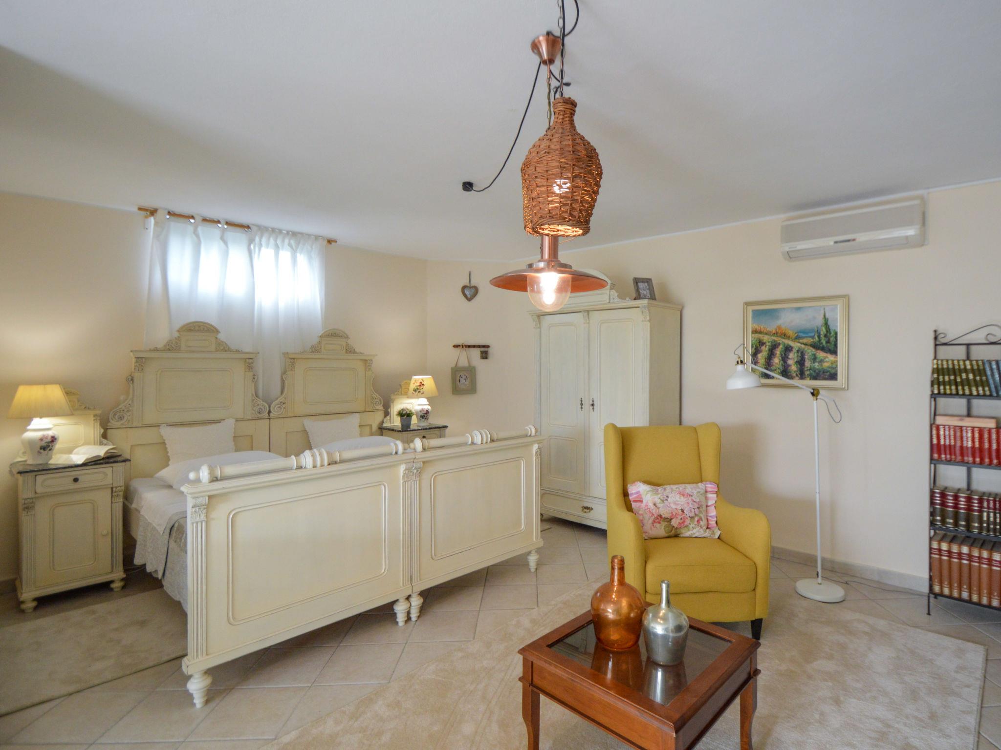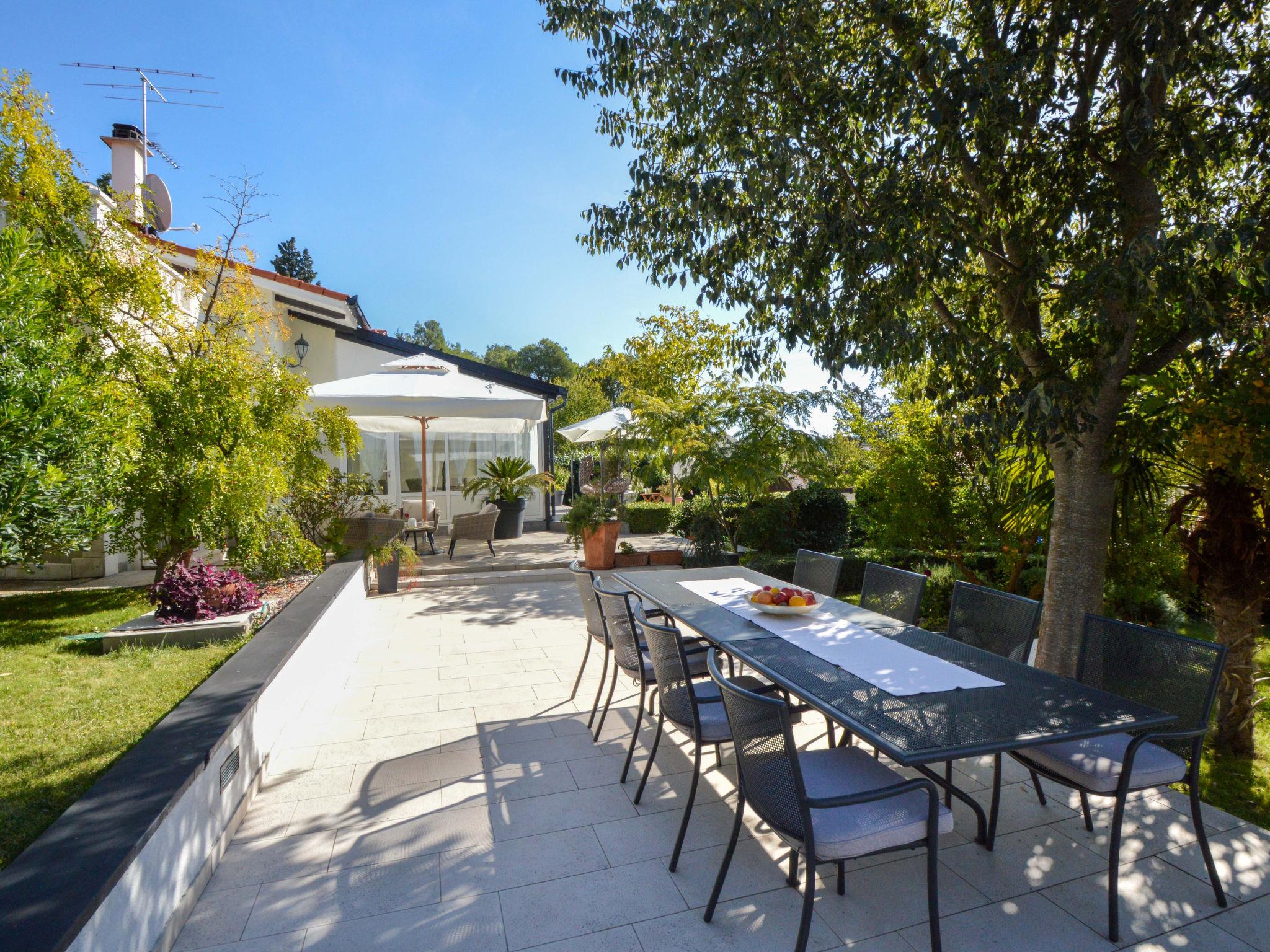 5-room house 180 m2, south facing position. Beautiful and tasteful furnishings: living/sleeping room with 1 french bed (140 cm, length 200 cm), dining table, kitchen corner and satellite TV (flat screen), air conditioning. Exit to the terrace. Living/sleeping room with 1 sofabed (100 cm, length 190 cm), 1 french bed (180 cm, length 200 cm), dining table, kitchen corner and satellite TV (flat screen), air conditioning. Exit to the terrace. Living/dining room 60 m2 with 1 sofabed (120 cm, length 200 cm), satellite TV (flat screen), air conditioning. Exit to the terrace. 1 room with 1 french bed (160 cm, length 200 cm), shower/WC and air conditioning. Exit to the terrace. 1 room with 2 beds (90 cm, length 200 cm). Exit to the balcony. Open kitchen (oven, dishwasher, 4 ceramic glass hob hotplates, toaster, kettle, microwave, freezer, electric coffee machine). Bath/WC, 2 showers/WC. No heating option. Balcony 4 m2, 2 terraces 30 m2, terrace 15 m2. Terrace furniture, deck chairs. View of the swimming pool and the garden. Facilities: washing machine, safe, children's high chair, baby cot, hair dryer. Internet (WiFi, free). No internal connecting door between the separated properties. Small detached house: living/ bedroom, open kitchen. Main building with 2 apartments on the ground floor, each apartment with separate and external entrance. One apartment: living/bedroom, open kitchen. The other apartment: living/dining area, open kitchen, 2 bedrooms.