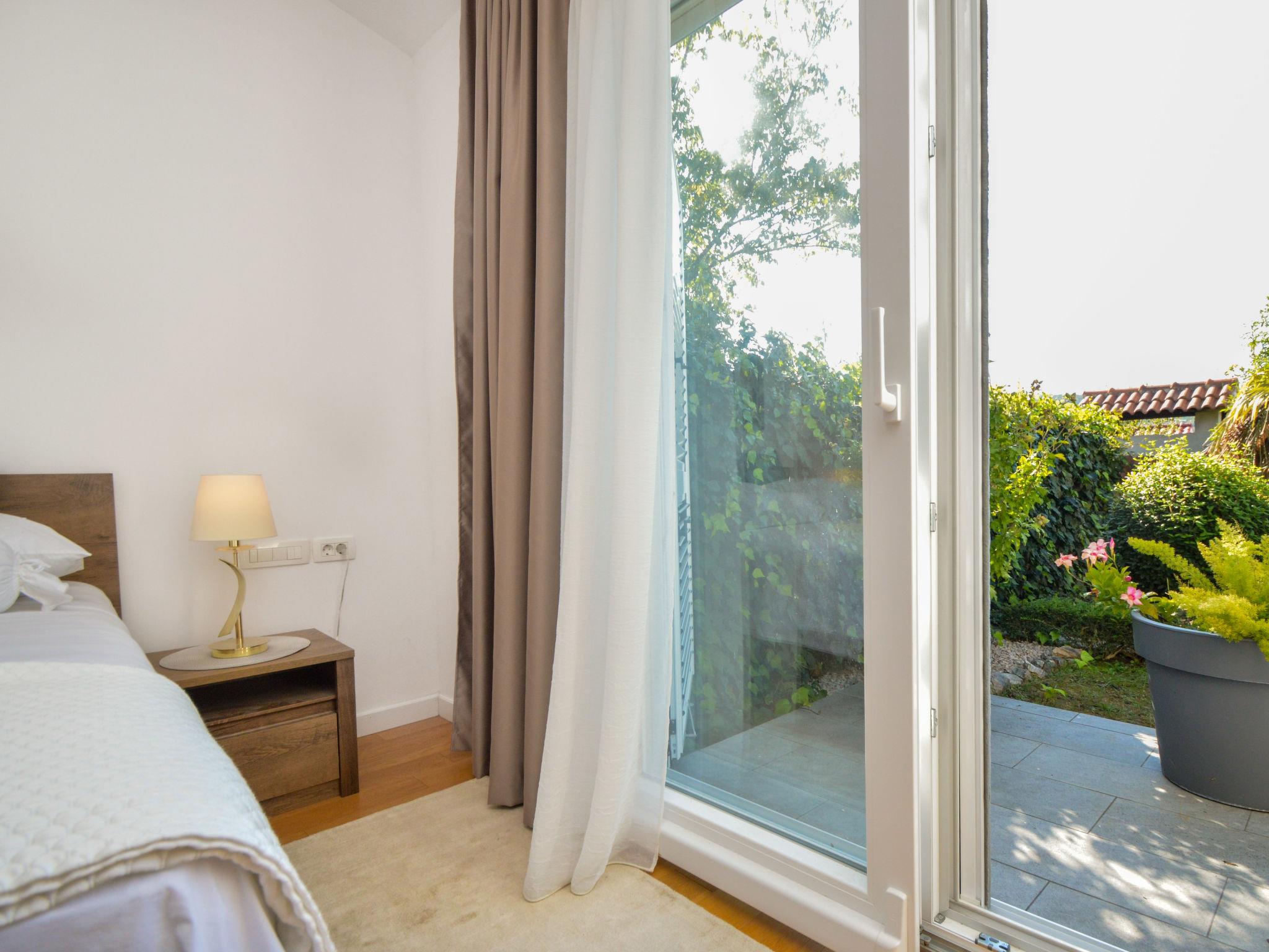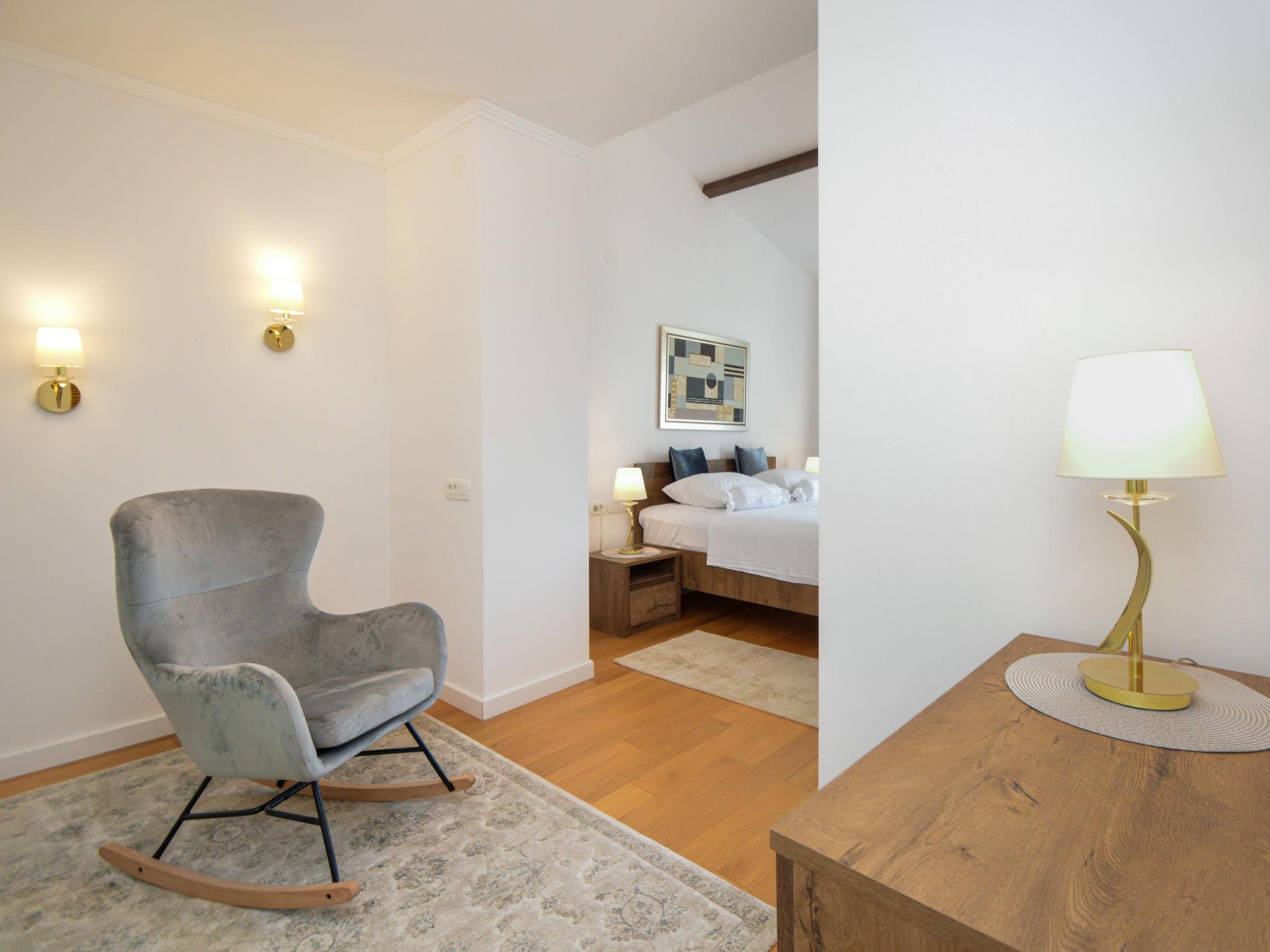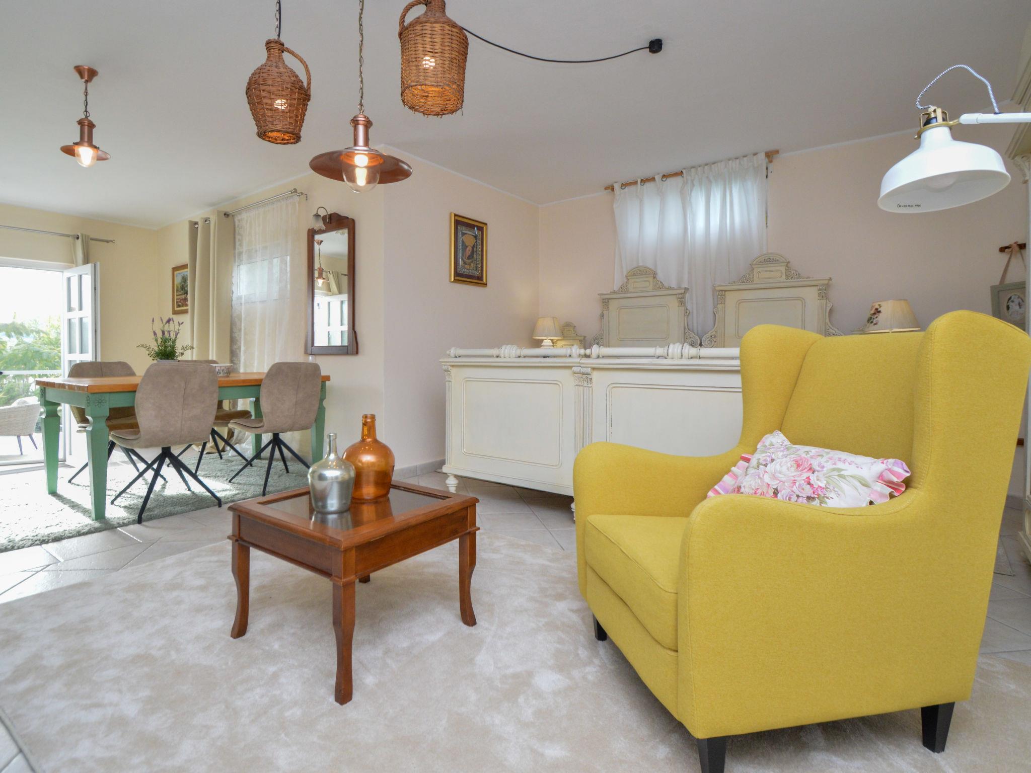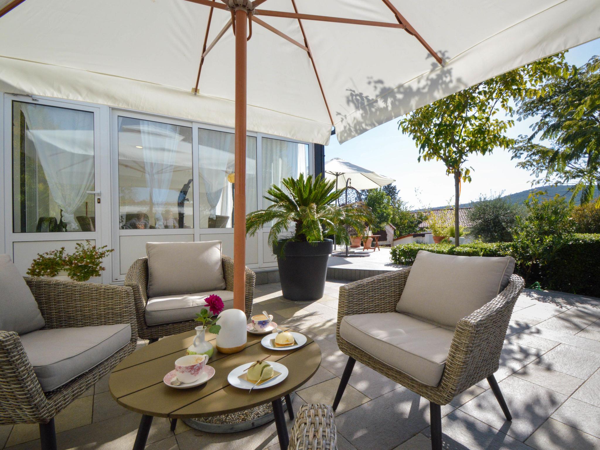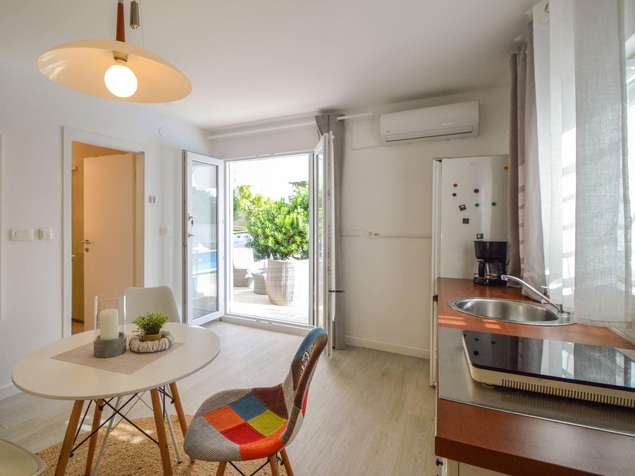 5-room house 180 m2, south facing position. Beautiful and tasteful furnishings: living/sleeping room with 1 french bed (140 cm, length 200 cm), dining table, kitchen corner and satellite TV (flat screen), air conditioning. Exit to the terrace. Living/sleeping room with 1 sofabed (100 cm, length 190 cm), 1 french bed (180 cm, length 200 cm), dining table, kitchen corner and satellite TV (flat screen), air conditioning. Exit to the terrace. Living/dining room 60 m2 with 1 sofabed (120 cm, length 200 cm), satellite TV (flat screen), air conditioning. Exit to the terrace. 1 room with 1 french bed (160 cm, length 200 cm), shower/WC and air conditioning. Exit to the terrace. 1 room with 2 beds (90 cm, length 200 cm). Exit to the balcony. Open kitchen (oven, dishwasher, 4 ceramic glass hob hotplates, toaster, kettle, microwave, freezer, electric coffee machine). Bath/WC, 2 showers/WC. No heating option. Balcony 4 m2, 2 terraces 30 m2, terrace 15 m2. Terrace furniture, deck chairs. View of the swimming pool and the garden. Facilities: washing machine, safe, children's high chair, baby cot, hair dryer. Internet (WiFi, free). No internal connecting door between the separated properties. Small detached house: living/ bedroom, open kitchen. Main building with 2 apartments on the ground floor, each apartment with separate and external entrance. One apartment: living/bedroom, open kitchen. The other apartment: living/dining area, open kitchen, 2 bedrooms.